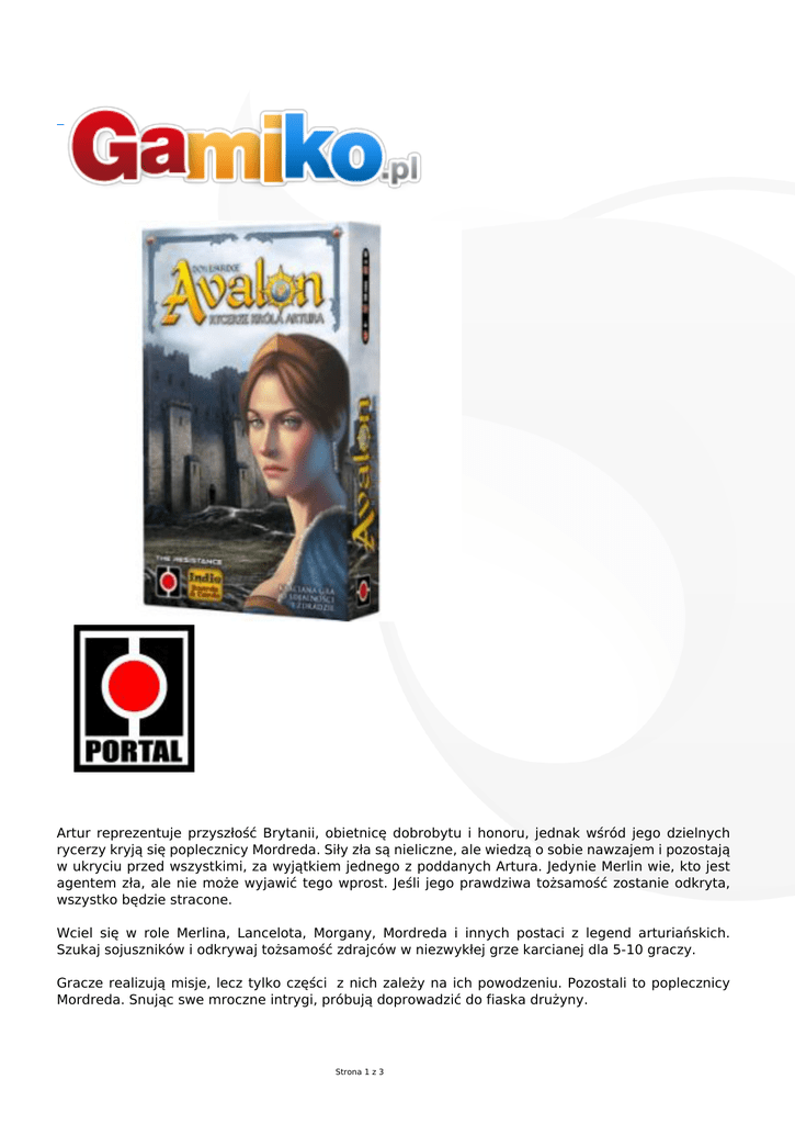 Artur reprezentuje przyszłość Brytanii, obietnicę dobrobytu i honoru, jednak wśród jego dzielnych rycerzy kryją się poplecznicy Mordreda. Siły zła są nieliczne, ale wiedzą o sobie nawzajem i pozostają w ukryciu przed wszystkimi, za wyjątkiem jednego z poddanych Artura. Jedynie Merlin wie, kto jest agentem zła, ale nie może wyjawić tego wprost. Jeśli jego prawdziwa tożsamość zostanie odkryta, wszystko będzie stracone. Wciel się w role Merlina, Lancelota, Morgany, Mordreda i innych postaci z legend arturiańskich. Szukaj sojuszników i odkrywaj tożsamość zdrajców w niezwykłej grze karcianej dla 5-10 graczy. Gracze realizują misje, lecz tylko części z nich zależy na ich powodzeniu. Pozostali to poplecznicy Mordreda. Snując swe mroczne intrygi, próbują doprowadzić do fiaska drużyny. Strona 1 z 3 Spiski, blef, dedukcja i żywiołowe negocjacje czynią tę grę zupełnie niepowtarzalną, emocjonującą do ostatniej chwili. Wkrocz w krainę legend... i nie ufaj nikomu! Uwaga! W pudełku z grą znajduje się również specjalny mini-dodatek – Lancelot (2 dodatkowe karty Postaci i 7 kart Lojalności), który może być użyty w trzech różnych wariantach dostępnych w instrukcji. Avalon: Rycerze króla Artura to tytuł z bestsellerowej serii The Resistance, w ramach której w 2011 roku ukazała się gra "The Resistance: Agenci Molocha". Akcja Avalonu ma miejsce na dworze Krola Artura dzięki czemu można ją łatwo prezentować graczom nie przepadającym za fantasy, czy science fiction. W Avalonie postacie otrzymały specjalne zdolności, a szpiedzy, czyli siły zła, nie tylko będą przeszkadzać w wypełnianiu podejmowanych misji, ale starać się będą również poznać tożsamość Merlina. Merlin bowiem wie kto nosi zło w swoim sercu, ale nie może wprost rzucać oskarżeń, ponieważ Źli mogą go uśmiercić i wygrać. Zawartość pudełka: 14 kart postaci 20 kart głosowania 10 kart misji 9 kart Lancelota karta Pani Jeziora 15 żetonów 3 plansze misji Wiek 13+ Liczba graczy 5-10 graczy Czas gry ok. 30 minut Strona 2 z 3 Wydanie polskie Intrukcja polska Producent Portal Projektant Don Eskridge Strona 3 z 3