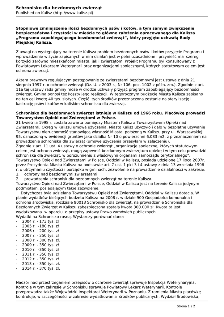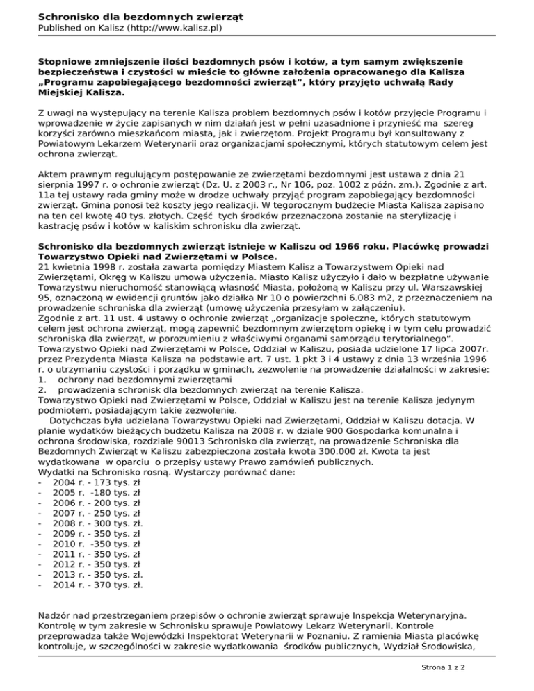 Schronisko dla bezdomnych zwierząt Published on Kalisz (http://www.kalisz.pl) Stopniowe zmniejszenie ilości bezdomnych psów i kotów, a tym samym zwiększenie bezpieczeństwa i czystości w mieście to główne założenia opracowanego dla Kalisza „Programu zapobiegającego bezdomności zwierząt”, który przyjęto uchwałą Rady Miejskiej Kalisza. Z uwagi na występujący na terenie Kalisza problem bezdomnych psów i kotów przyjęcie Programu i wprowadzenie w życie zapisanych w nim działań jest w pełni uzasadnione i przynieść ma szereg korzyści zarówno mieszkańcom miasta, jak i zwierzętom. Projekt Programu był konsultowany z Powiatowym Lekarzem Weterynarii oraz organizacjami społecznymi, których statutowym celem jest ochrona zwierząt. Aktem prawnym regulującym postępowanie ze zwierzętami bezdomnymi jest ustawa z dnia 21 sierpnia 1997 r. o ochronie zwierząt (Dz. U. z 2003 r., Nr 106, poz. 1002 z późn. zm.). Zgodnie z art. 11a tej ustawy rada gminy może w drodze uchwały przyjąć program zapobiegający bezdomności zwierząt. Gmina ponosi też koszty jego realizacji. W tegorocznym budżecie Miasta Kalisza zapisano na ten cel kwotę 40 tys. złotych. Część tych środków przeznaczona zostanie na sterylizację i kastrację psów i kotów w kaliskim schronisku dla zwierząt. Schronisko dla bezdomnych zwierząt istnieje w Kaliszu od 1966 roku. Placówkę prowadzi Towarzystwo Opieki nad Zwierzętami w Polsce. 21 kwietnia 1998 r. została zawarta pomiędzy Miastem Kalisz a Towarzystwem Opieki nad Zwierzętami, Okręg w Kaliszu umowa użyczenia. Miasto Kalisz użyczyło i dało w bezpłatne używanie Towarzystwu nieruchomość stanowiącą własność Miasta, położoną w Kaliszu przy ul. Warszawskiej 95, oznaczoną w ewidencji gruntów jako działka Nr 10 o powierzchni 6.083 m2, z przeznaczeniem na prowadzenie schroniska dla zwierząt (umowę użyczenia przesyłam w załączeniu). Zgodnie z art. 11 ust. 4 ustawy o ochronie zwierząt „organizacje społeczne, których statutowym celem jest ochrona zwierząt, mogą zapewnić bezdomnym zwierzętom opiekę i w tym celu prowadzić schroniska dla zwierząt, w porozumieniu z właściwymi organami samorządu terytorialnego”. Towarzystwo Opieki nad Zwierzętami w Polsce, Oddział w Kaliszu, posiada udzielone 17 lipca 2007r. przez Prezydenta Miasta Kalisza na podstawie art. 7 ust. 1 pkt 3 i 4 ustawy z dnia 13 września 1996 r. o utrzymaniu czystości i porządku w gminach, zezwolenie na prowadzenie działalności w zakresie: 1. ochrony nad bezdomnymi zwierzętami 2. prowadzenia schronisk dla bezdomnych zwierząt na terenie Kalisza. Towarzystwo Opieki nad Zwierzętami w Polsce, Oddział w Kaliszu jest na terenie Kalisza jedynym podmiotem, posiadającym takie zezwolenie. Dotychczas była udzielana Towarzystwu Opieki nad Zwierzętami, Oddział w Kaliszu dotacja. W planie wydatków bieżących budżetu Kalisza na 2008 r. w dziale 900 Gospodarka komunalna i ochrona środowiska, rozdziale 90013 Schronisko dla zwierząt, na prowadzenie Schroniska dla Bezdomnych Zwierząt w Kaliszu zabezpieczona została kwota 300.000 zł. Kwota ta jest wydatkowana w oparciu o przepisy ustawy Prawo zamówień publicznych. Wydatki na Schronisko rosną. Wystarczy porównać dane: - 2004 r. - 173 tys. zł - 2005 r. -180 tys. zł - 2006 r. - 200 tys. zł - 2007 r. - 250 tys. zł - 2008 r. - 300 tys. zł. - 2009 r. - 350 tys. zł - 2010 r. -350 tys. zł - 2011 r. - 350 tys. zł - 2012 r. - 350 tys. zł - 2013 r. - 350 tys. zł. - 2014 r. - 370 tys. zł. Nadzór nad przestrzeganiem przepisów o ochronie zwierząt sprawuje Inspekcja Weterynaryjna. Kontrolę w tym zakresie w Schronisku sprawuje Powiatowy Lekarz Weterynarii. Kontrole przeprowadza także Wojewódzki Inspektorat Weterynarii w Poznaniu. Z ramienia Miasta placówkę kontroluje, w szczególności w zakresie wydatkowania środków publicznych, Wydział Środowiska, Strona 1 z 2 Schronisko dla bezdomnych zwierząt Published on Kalisz (http://www.kalisz.pl) Rolnictwa i Gospodarki Komunalnej Urzędu Miejskiego. Jak każda placówka, schronisko jest kontrolowane przez Państwową Inspekcję Pracy. Link do strony schroniska http://www.kalisz-schronisko.toz.pl/ [1] Załącznik: Załącznik Ulotka [2] Program zapobiegający bezdomności zwierząt [3] Uchwała nr XXVI/398/2008 [4] Wielkość 446.32 KB 32.5 KB 94.28 KB Source URL: http://www.kalisz.pl/pl/q/dla-mieszkancow/schronisko-dla-bezdomnych-zwierzat Odnośniki [1] http://www.kalisz-schronisko.toz.pl/ [2] http://www.kalisz.pl/pl/system/files/tresc/zwyklestrony/2013/03/schronisko-dla-bezdomnychzwierzat/zalacznik/ulotka.pdf [3] http://www.kalisz.pl/pl/system/files/tresc/zwyklestrony/2013/03/schronisko-dla-bezdomnychzwierzat/zalacznik/programzapobiegajacybezdomnoscizwierzat.doc [4] http://www.kalisz.pl/pl/system/files/tresc/zwyklestrony/2013/03/schronisko-dla-bezdomnychzwierzat/zalacznik/uchwalarmk200826398.pdf Strona 2 z 2 Powered by TCPDF (www.tcpdf.org)