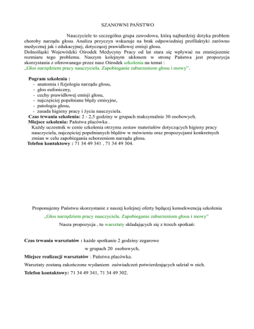 SZANOWNI PAŃSTWO Nauczyciele to szczególna grupa zawodowa, którą najbardziej dotyka problem choroby narządu głosu. Analiza przyczyn wskazuje na brak odpowiedniej profilaktyki zarówno medycznej jak i edukacyjnej, dotyczącej prawidłowej emisji głosu. Dolnośląski Wojewódzki Ośrodek Medycyny Pracy od lat stara się wpływać na zmniejszenie rozmiaru tego problemu. Naszym kolejnym ukłonem w stronę Państwa jest propozycja skorzystania z oferowanego przez nasz Ośrodek szkolenia na temat : „Głos narzędziem pracy nauczyciela. Zapobieganie zaburzeniom głosu i mowy”. Pogram szkolenia : - anatomia i fizjologia narządu głosu, - głos eufoniczny, - cechy prawidłowej emisji głosu, - najczęściej popełniane błędy emisyjne, - patologia głosu, - zasada higieny pracy i życia nauczyciela. Czas trwania szkolenia: 2 - 2,5 godziny w grupach maksymalnie 30 osobowych. Miejsce szkolenia: Państwa placówka . Każdy uczestnik w cenie szkolenia otrzyma zestaw materiałów dotyczących higieny pracy nauczyciela, najczęściej popełnianych błędów w mówieniu oraz propozycjami konkretnych zmian w celu zapobiegania schorzeniom narządu głosu. Telefon kontaktowy : 71 34 49 341 , 71 34 49 304. Proponujemy Państwu skorzystanie z naszej kolejnej oferty będącej konsekwencją szkolenia „Głos narzędziem pracy nauczyciela. Zapobieganie zaburzeniom głosu i mowy” Nasza propozycja , to warsztaty składających się z trzech spotkań: Czas trwania warsztatów : każde spotkanie 2 godziny zegarowe w grupach 20 osobowych, Miejsce realizacji warsztatów : Państwa placówka. Warsztaty zostaną zakończone wydaniem zaświadczeń potwierdzających udział w nich. Telefon kontaktowy: 71 34 49 341, 71 34 49 302.