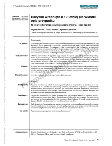 © PrzypadkiMedyczne.pl, e-ISSN 2084–2708, 2012; 20:75–79 Otrzymano: 15-05-2012 Akceptowano: 16-05-2012 Opublikowano: 14-06-2012 PrzypadkiMedyczne.pl Wydawnictwo COMVIDEO Łożysko wrośnięte u 19-letniej pierwiastki opis przypadku 19-year-old primipara with placenta increta - case report Magdalena Fiołna1 , Tomasz Jakubiak1 , Agnieszka Czarnecka1 1 Szpital Ginekologiczno-Położniczy im. Świętej Rodziny SPZOZ ul. Madalińskiego 25, 02-544 Warszawa, PL Streszczenie Tło, geneza: Łożysko przyrośnięte (placenta accreta) jest efektem patologicznej implantacji trofoblastu w głąb doczesnej. Jest to stan rzadko występujący w położnictwie, nie mniej jednak bardzo groźny dla zdrowia i życia rodzącej. Czynnikami ryzyka wystąpienia łożyska wrośniętego są: uprzednio przeprowadzone operacje macicy, łożysko przodujące, wiek matki powyżej 35 lat, uszkodzenie endometrium, mięśniaki podśluzówkowe. Patogeneza jest nieznana, a postępowanie diagnostyczne i lecznicze pozostaje istotnym problemem klinicznym. Opis przypadku: 19-letnia pierwiastka w 36 tygodniu ciąży przyjęta do szpitala z powodu przedwczesnego odpływania płynu owodniowego. Podczas trzeciego okresu porodu doszło do zatrzymania łożyska i krwotoku okołoporodowego. Pomimo zastosowania leczenia farmakologicznego, tamponady balonem Bakri, szwu B-Lyncha, podwiązania tętnic, krwotok nie został opanowany. Przeprowadzono histerektomię a pacjentka wymagała przetoczenia preparatów krwi. Wnioski: Wczesne wykrycie patologii łożyskowej może zapobiec zagrażającemu życiu krwotokowi okołoporodowemu oraz zredukować ryzyko powikłań. W każdym przypadku przedłużającego się krwotoku, należy rozważyć możliwość wystąpienia łożyska wrośniętego nawet jeśli u pacjentki nie występują żadne z czynników ryzyka. Słowa kluczowe: Łożysko wrośnięte, krwotok poporodowy, histerektomia Abstract Background: Placenta accreta is an effect of pathological trophoblast implantation in decidua or in myometrium. It is a rare but life-threatening condition. Risk factors for placenta accreta include uterine surgery, placenta previa, maternal age greater than 35 years, multiparity, endometrial defects and submucous leiomyomata. The pathogenesis is still unknown and the diagnosis and treatment represent an important clinical problem. Case Report: 19-year-old primipara at 36 weeks’ gestation with PROM upon admission. Preterm delivery with postpartum hemorrhage during the third stage of labor with uterine atony. The patient does not respond neither to pharmacological treatments, Bakri balloon, B-Lynch suture nor arterial ligature. Finally a hysterectomy and blood transfusion was done. Conclusions: Early detection of placenta increta can prevent a serious postpartum hemorrhage and reduce the risk of complications. In every case of prolonged postpartum hemorrhage we should remember about this complication even if our patient does not present the risk factors. key words: Adres pocztowy: Placenta accreta, postpartum hemorrhage, hysterectomy Szpital Ginekologiczno - Położniczy im. Świętej Rodziny SPZOZ ul. Madalińskiego 25, 02-544 Warszawa, PL; e-mail: magda.fi[email protected] 19-year-old primipara with placenta increta - case report 75 Magdalena Fiołna, Tomasz Jakubiak, Agnieszka Czarnecka Tło Opis przypadku Łożysko przyrośnięte (placenta accreta) jest efektem patologicznej i nadmiernej implantacji trofoblastu w głąb doczesnej lub w mięsień macicy. W zależności od głębokości penetracji kosmków łożyska do tkanek matczynych wyróżnia się kilka podtypów tej patologii: 19-letnia pierworódka w 36 tygodniu ciąży przyjęta została do Szpitala im. Świętej Rodziny z powodu przedwczesnego pęknięcia błon płodowych oraz odpływania płynu owodniowego. Przebieg ciąży powikłany toksoplazmozą leczoną rowamycyną - bez kontroli parametrów IgG i IgM. Pacjentka nie podlegała opiece przedciążowej. Liczba wizyt kontrolnych w ciąży - 7. W II i III trymestrze ciąży stwierdzono niedokrwistość i podawano Tardyferon. W badaniu ultrasonograficznym w II i III trymestrze ciąży bez odchyleń od stanu prawidłowego. W trakcie hospitalizacji wystąpiła własna, regularna czynność skurczowa macicy. Pacjentkę przyjęto na blok porodowy w stanie ogólnym dobrym. W badaniu kardiotokograficznym zarejestrowano prawidłową czynność serca płodu oraz czynność skurczową macicy co 2-3 min. W badaniu przezpochwowym: część pochwowa szyjki macicy długości 1 cm, rozwarcie 1cm, główka przyparta do wchodu, odpływał czysty płyn owodniowy. Odbył się poród przedwczesny siłami natury z nacięciem i szyciem krocza. Urodzono syna o masie 3260g, długości 51 cm ocenionego na 10 pkt w skali Apgar w 1, 5 i 10 minucie. Łożyska nie urodzono pomimo próby masażu macicy - zabieg Credego. Poproszono anestezjologa. Powtórzono zabieg Credego. W znieczuleniu ogólnym, dożylnym ręcznie wydobyto łożysko we fragmentach. Było ono mocno przytwierdzone do przedniej ściany macicy. Następnie wyłyżeczkowano jamę macicy. Pomimo przeprowadzonych działań nadal utrzymywało się wzmożone krwawienie. Zastosowano leczenie farmakologiczne (oksytocyna 10j, metergina 0,2mg iv, płyny dożylne oraz misoprostol 2 x 0,2mg pr). Zlecono także położenie lodu na brzuch pacjentki. Skontrolowano całość kanału rodnego. Założono szew hemostatyczny na pękniętą szyjkę macicy. Zeszyto nacięcie krocza. Ze względu na utrzymujące się krwawienie ponownie wyłyżeczkowano jamę macicy usuwając resztki łożyska oraz skrzepy krwi. Po raz kolejny skontrolowano całość kanału rodnego. Założono balon Bakri wypełniając go 360 ml NaCl 0,9%. Udało się zahamować krwawienie. Pacjentka w stanie ogólnym średnim, RR 110/70 mm Hg, HR 76/min. Po upływie ok 1,5 h w worku od balonu Bakri zaobserwowano 150 ml krwi. W pochwie pojawiła się żywoczerwona krew. Całkowitą utratę krwi oceniono na okoł