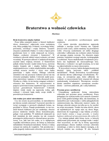 Braterstwo a wolność człowieka Braterstwo a wolność człowieka Martinus Brak braterstwa między ludźmi Przez kilka ostatnich stuleci w historii ludzkości słowo „braterstwo” odgrywało coraz ważniejszą rolę. Masy podjęły bój o wolność, wywołując bunty, powstania, rewolucje i wojny domowe. Tyranów strącano z piedestału władzy i w walce o lepsze jutro przelewano krew w wielu miejscach na świecie. Żądano „wolności, równości i braterstwa”. W rezultacie człowiek zdobył więcej wolności, niż miał wcześniej. W pewnym zakresie w niektórych krajach uzyskał także większą równość. Z braterstwem jednak różnie bywało i nadal różnie bywa, zarówno między krajami, jak i między ludźmi. Relacje międzypaństwowe, a także międzyludzkie nierzadko cechują uczucia zawiści i urazy oraz żądza panowania i żądza władzy. Dlatego człowiek ziemski(1) nie ma poczucia wolności ani też nie ma równości pomiędzy ludźmi. Człowiek nadal pozostaje zniewolony i spętany w wielu obszarach życia. Wynika to z faktu, że nie można osiągnąć wolności i równości bez braterstwa. W rzeczywistości te pojęcia są bowiem trzema aspektami tego, co można nazwać „prawdziwym braterstwem”. Człowiek dopiero wtedy stanie się naprawdę wolny, gdy wolność i równość będą miały swoje źródło w prawdziwym braterstwie. Jak trudno jest znieść niewolnictwo Czy nie uważa się powszechnie, że niewolnictwo już dawno zostało zniesione? A przecież zjawisko to wciąż występuje w pewnych zakątkach świata, na przykład w Afryce. Panuje przekonanie, że ten rozdział historii ludzkości jest już zamknięty, chociaż jeszcze niedawno istniały obozy koncentracyjne, gułagi i tym podobne. W niektórych miejscach na kuli ziemskiej do dziś zamyka się tak zwanych przestępców politycznych w obozach pracy przymusowej. Los, jaki tam ich czeka, to w najlepszym wypadku niewolnicza praca, do której są zmuszani nieludzkimi i brutalnymi metodami. Tortury w takiej sytuacji nie należą do wyjątków. Tak prymitywne i pełne pogardy traktowanie człowieka nie może mieć www.kosmologia.info miejsca w prawdziwie cywilizowanym społeczeństwie. Czy zatem zjawisko niewolnictwa naprawdę zniknęło z naszego życia? Niestety nie. Upłynie jeszcze wiele czasu, zanim staniemy się prawdziwie wolni. Zwyczaj uzależniania od siebie drugiego człowieka i odbierania mu wolności zależy bowiem od naszego stopnia rozwoju. Na obecnym etapie jesteśmy więźniami swojego umysłu, światopoglądu i wyobrażeń. Nasza niedoskonała świadomość przykuwa nas kajdanami do nieszczęśliwego losu. Marzymy o wolności i na ogół uważamy, że to inni są odpowiedzialni za nasze nieszczęścia. W przyszłości wszyscy ludzie dostąpią kosmicznej inicjacji, którą nazywam także „wielkimi narodzinami”. Wtedy doświadczą wyczekiwanego od dawien dawna całkowitego oswobodzenia. Poczują, że zewnętrzne pęta, które odbierały im wolność, w rzeczywistości były więzami ich własnej niedoskonałej świadomości. Wewnętrzne oswobodzenie umożliwi stopniowe zewnętrzne oswobodzenie – zarówno jednostek, jak i całej ludzkości. Przymus pracy zarobkowej Uzasadnioną społecznie formą zniewolenia człowieka jest przymus pracy zarobkowej. Praca polegająca na wykonywaniu tych samych czynności przez wiele godzin każdego dnia, tak monotonna, że niemożliwe jest wykrzesanie z siebie jakiegokolwiek zainteresowania nią, faktycznie stanowi ciężar, do którego człowiek zmusza się tylko po to, by zarobić na swoje utrzymanie. Trudno się temu dziwić, skoro od najmłodszych lat wpaja nam się słowa Boga, skierowane do wygnanego z raju Adama: przeklęta niech będzie ziemia z twego powodu, w trudzie będziesz zdobywał od niej pożywienie dla siebie.(2) Czy istnieją jednak takie formy życia, w których zdobywanie pożywienia nie wymaga trudu i znoju? Ależ oczywiście, że tak! Są to formy egzystencji poprzedzające obecne stadium rozwoju człowieka ziemskiego, a także te, które dopiero nastąpią, a do których wiedzie nas ewolucja. W obu formach 1 Braterstwo a wolność człowieka egzystencji żywa istota jest zdecydowanie bardziej wolna niż nękany trudami codziennego życia człowiek ziemski. Ale wolność, jakiej można doświadczyć w różnych epokach rozwoju, nie jest zawsze identyczna; w każdej epoce jest inna. Pierwsza z wymienionych epok to egzystencja w królestwie zwierząt(3). Obserwując zwierzęta, z łatwością możemy zauważyć, że ogólnie cieszą się dużo większym zakresem swobody niż ludzie ziemscy. Mogą zdobyć pożywienie, gdzie tylko i kiedy tylko mają na to ochotę. Człowiekowi ziemskiemu nie przychodzi to z taką samą łatwością. Musi się podporządkować niezliczonej ilości nakazów i zakazów stojących na straży prawa własności. Podstawą jest tutaj przykazanie Nie kradnij, które wymusza uszanowanie owego prawa. Czy nie istnieje zależność pomiędzy stanem majątkowym a sprawowaną władzą? Osoba posiadająca dużą fortunę zyskuje dzięki niej władzę, co z kolei umożliwia jej dalsze gromadzenie fortuny i zdobywanie jeszcze większej władzy. Ale w jaki sposób jeden człowiek zdobywa władzę nad drugim? Staje się to możliwe, gdy jest w jakiejś dziedzinie bardziej inteligentny. Górując nad innymi ludźmi, może nimi kierować, a w rezultacie podporządkowuje ich sobie i wykorzystuje. Drogę do kumulacji władzy otwierają niezdrowe, nieuczciwe zasady prowadzenia biznesu. Które zasady trzeba uznać za niezdrowe? W swojej czystej formie biznes jest błogosławieństwem dla człowieka, gdyż dzięki niemu można wymieniać jedne usługi czy towary na inne o tej samej wartości. W takim przypadku mamy do czynienia z obopólną korzyścią, żadna ze stron nie wzbogaca się kosztem drugiej. Natomiast gdy celem jest osiągnięcie zysku, wymiana usług czy towarów następuje po cenie wyższej, niż wynosi 