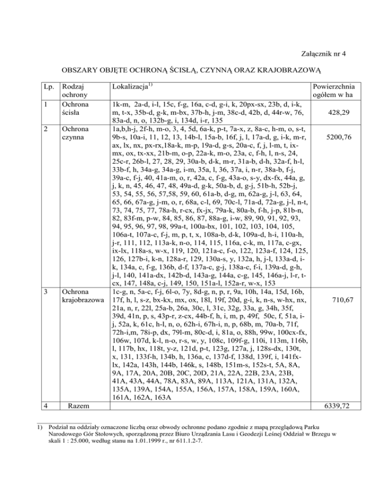 Załącznik nr 4 OBSZARY OBJĘTE OCHRONĄ ŚCISŁĄ, CZYNNĄ ORAZ KRAJOBRAZOWĄ Lp. 1 2 3 4 Rodzaj ochrony Ochrona ścisła Ochrona czynna Ochrona krajobrazowa Razem Lokalizacja1) 1k-m, 2a-d, i-l, 15c, f-g, 16a, c-d, g-i, k, 20px-sx, 23b, d, i-k, m, t-x, 35b-d, g-k, m-bx, 37b-h, j-m, 38c-d, 42b, d, 44r-w, 76, 83a-d, n, o, 132b-g, i, 134d, i-r, 135 1a,b,h-j, 2f-h, m-o, 3, 4, 5d, 6a-k, p-t, 7a-x, z, 8a-c, h-m, o, s-t, 9b-s, 10a-i, 11, 12, 13, 14b-l, 15a-b, 16f, j, l, 17a-d, g, i-k, m-r, ax, lx, nx, px-rx,18a-k, m-p, 19a-d, g-s, 20a-c, f, j, l-m, t, ixmx, ox, tx-xx, 21b-m, o-p, 22a-k, m-o, 23a, c, f-h, l, n-s, 24, 25c-r, 26b-l, 27, 28, 29, 30a-b, d-k, m-r, 31a-b, d-h, 32a-f, h-l, 33b-f, h, 34a-g, 34a-g, i-m, 35a, l, 36, 37a, i, n-r, 38a-b, f-j, 39a-c, f-j, 40, 41a-m, o, r, 42a, c, f-g, 43a-o, s-y, dx-fx, 44a, g, j, k, n, 45, 46, 47, 48, 49a-d, g-k, 50a-b, d, g-j, 51b-h, 52b-j, 53, 54, 55, 56, 57,58, 59, 60, 61a-b, d-g, m, 62a-g, j-l, 63, 64, 65, 66, 67a-g, j-m, o, r, 68a, c-l, 69, 70c-l, 71a-d, 72a-g, j-l, n-t, 73, 74, 75, 77, 78a-h, r-cx, fx-jx, 79a-k, 80a-b, f-h, j-p, 81b-n, 82, 83f-m, p-w, 84, 85, 86, 87, 88a-g, i-w, 89, 90, 91, 92, 93, 94, 95, 96, 97, 98, 99a-t, 100a-bx, 101, 102, 103, 104, 105, 106a-t, 107a-c, f-j, m, p, t, x, 108a-b, d-k, 109a-d, h-i, 110a-h, j-r, 111, 112, 113a-k, n-o, 114, 115, 116a, c-k, m, 117a, c-gx, ix-lx, 118a-s, w-x, 119, 120, 121a-c, f-o, 122, 123a-f, 124, 125, 126, 127b-i, k-n, 128a-r, 129, 130a-s, y, 132a, h, j-l, 133a-d, ik, 134a, c, f-g, 136b, d-f, 137a-c, g-j, 138a-c, f-i, 139a-d, g-h, j-l, 140, 141a-dx, 142b-d, 143a-g, 144a, c-g, 145, 146a-j, l-r, tcx, 147, 148a, c-j, 149, 150, 151a-l, 152a-r, w-x, 153 1c-g, n, 5a-c, f-j, 6l-o, 7y, 8d-g, n, p, r, 9a, 10h, 14a, 15d, 16b, 17f, h, l, s-z, bx-kx, mx, ox, 18l, 19f, 20d, g-i, k, n-s, w-hx, nx, 21a, n, r, 22l, 25a-b, 26a, 30c, l, 31c, 32g, 33a, g, 34h, 35f, 39d, 41n, p, s, 43p-r, z-cx, 44b-f, h, i, m, p, 49f, 50c, f, 51a, ij, 52a, k, 61c, h-l, n, o, 62h-i, 67h-i, n, p, 68b, m, 70a-b, 71f, 72h-i,m, 78i-p, dx, 79l-m, 80c-d, i, 81a, o, 88h, 99w, 100cx-fx, 106w, 107d, k-l, n-o, r-s, w, y, 108c, 109f-g, 110i, 113m, 116b, l, 117b, hx, 118t, y-z, 121d, p-t, 123g, 127a, j, 128s-dx, 130t, x, 131, 133f-h, 134b, h, 136a, c, 137d-f, 138d, 139f, i, 141fxlx, 142a, 143h, 144b, 146k, s, 148b, 151m-s, 152s-t, 5A, 8A, 9A, 17A, 20A, 20B, 20C, 20D, 21A, 22A, 22B, 23A, 23B, 41A, 43A, 44A, 78A, 83A, 89A, 113A, 121A, 131A, 132A, 135A, 139A, 154A, 155A, 156A, 157A, 158A, 159A, 160A, 161A, 162A, 163A Powierzchnia ogółem w ha 428,29 5200,76 710,67 6339,72 _________________ 1) Podział na oddziały oznaczone liczbą oraz obwody ochronne podano zgodnie z mapą przeglądową Parku Narodowego Gór Stołowych, sporządzoną przez Biuro Urządzania Lasu i Geodezji Leśnej Oddział w Brzegu w skali 1 : 25.000, według stanu na 1.01.1999 r., nr 611.1.2-7. Podział na pododdziały oznaczone literą oraz obszary objęte ochroną częściową przyjęto zgodnie z mapą gospodarstwa ochronnego Parku Narodowego Gór Stołowych, sporządzoną przez Biuro Urządzania Lasu i Geodezji Leśnej Oddział w Brzegu w skali 1 : 20.000, według stanu na 1.01.1999 r., nr 611.1.2-7. Mapy znajdują się w siedzibie Parku Narodowego Gór Stołowych w miejscowości Kudowa-Zdrój.
