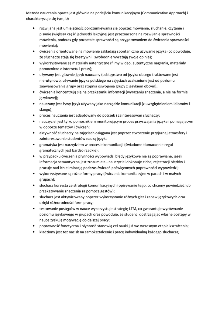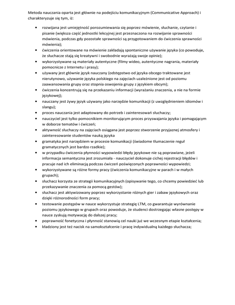 Metoda nauczania oparta jest głównie na podejściu komunikacyjnym (Communicative Approach) i charakteryzuje się tym, iż: • • • • • • • • • • • • • • • • • rozwijana jest umiejętność porozumiewania się poprzez mówienie, słuchanie, czytanie i pisanie (większa część jednostki lekcyjnej jest przeznaczona na rozwijanie sprawności mówienia, podczas gdy pozostałe sprawności są przygotowaniem do ćwiczenia sprawności mówienia); ćwiczenia orientowane na mówienie zakładają spontaniczne używanie języka (co powoduje, że słuchacze stają się kreatywni i swobodnie wyrażają swoje opinie); wykorzystywane są materiały autentyczne (filmy wideo, autentyczne nagrania, materiały pomocnicze z Internetu i prasy); używany jest głównie język nauczany (odstępstwo od języka obcego traktowane jest nierutynowo, używanie języka polskiego na zajęciach uzależnione jest od poziomu zaawansowania grupy oraz stopnia oswojenia grupy z językiem obcym); ćwiczenia koncentrują się na przekazaniu informacji (wyrażaniu znaczenia, a nie na formie językowej); nauczany jest żywy język używany jako narzędzie komunikacji (z uwzględnieniem idiomów i slangu); proces nauczania jest adaptowany do potrzeb i zainteresowań słuchaczy; nauczyciel jest tylko pomocnikiem monitorującym proces przyswajania języka i pomagającym w doborze tematów i ćwiczeń; aktywność słuchaczy na zajęciach osiągana jest poprzez stworzenie przyjaznej atmosfery i zainteresowanie studentów nauką języka gramatyka jest narzędziem w procesie komunikacji (świadome tłumaczenie reguł gramatycznych jest bardzo rzadkie); w przypadku ćwiczenia płynności wypowiedzi błędy językowe nie są poprawiane, jeżeli informacja semantyczna jest zrozumiała - nauczyciel dokonuje cichej rejestracji błędów i pracuje nad ich eliminacją podczas ćwiczeń poświęconych poprawności wypowiedzi; wykorzystywane są różne formy pracy (ćwiczenia komunikacyjne w parach i w małych grupach); słuchacz korzysta ze strategii komunikacyjnych (opisywanie tego, co chcemy powiedzieć lub przekazywanie znaczenia za pomocą gestów); słuchacz jest aktywizowany poprzez wykorzystanie różnych gier i zabaw językowych oraz dzięki różnorodności form pracy; testowanie postępów w nauce wykorzystuje strategię LTM, co gwarantuje wyrównanie poziomu językowego w grupach oraz powoduje, że studenci dostrzegając własne postępy w nauce zyskują motywację do dalszej pracy; poprawność fonetyczna i płynność stanowią cel nauki już we wczesnym etapie kształcenia; kładziony jest też nacisk na samokształcenie i pracę indywidualną każdego słuchacza;