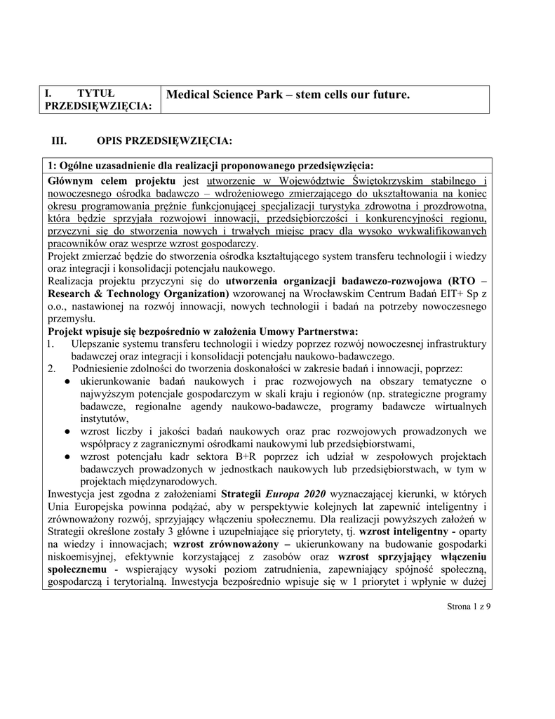 I. TYTUŁ PRZEDSIĘWZIĘCIA: III. Medical Science Park – stem cells our future. OPIS PRZEDSIĘWZIĘCIA: 1: Ogólne uzasadnienie dla realizacji proponowanego przedsięwzięcia: Głównym celem projektu jest utworzenie w Województwie Świętokrzyskim stabilnego i nowoczesnego ośrodka badawczo – wdrożeniowego zmierzającego do ukształtowania na koniec okresu programowania prężnie funkcjonującej specjalizacji turystyka zdrowotna i prozdrowotna, która będzie sprzyjała rozwojowi innowacji, przedsiębiorczości i konkurencyjności regionu, przyczyni się do stworzenia nowych i trwałych miejsc pracy dla wysoko wykwalifikowanych pracowników oraz wesprze wzrost gospodarczy. Projekt zmierzać będzie do stworzenia ośrodka kształtującego system transferu technologii i wiedzy oraz integracji i konsolidacji potencjału naukowego. Realizacja projektu przyczyni się do utworzenia organizacji badawczo-rozwojowa (RTO – Research & Technology Organization) wzorowanej na Wrocławskim Centrum Badań EIT+ Sp z o.o., nastawionej na rozwój innowacji, nowych technologii i badań na potrzeby nowoczesnego przemysłu. Projekt wpisuje się bezpośrednio w założenia Umowy Partnerstwa: 1. Ulepszanie systemu transferu technologii i wiedzy poprzez rozwój nowoczesnej infrastruktury badawczej oraz integracji i konsolidacji potencjału naukowo-badawczego. 2. Podniesienie zdolności do tworzenia doskonałości w zakresie badań i innowacji, poprzez: ● ukierunkowanie badań naukowych i prac rozwojowych na obszary tematyczne o najwyższym potencjale gospodarczym w skali kraju i regionów (np. strategiczne programy badawcze, regionalne agendy naukowo-badawcze, programy badawcze wirtualnych instytutów, ● wzrost liczby i jakości badań naukowych oraz prac rozwojowych prowadzonych we współpracy z zagranicznymi ośrodkami naukowymi lub przedsiębiorstwami, ● wzrost potencjału kadr sektora B+R poprzez ich udział w zespołowych projektach badawczych prowadzonych w jednostkach naukowych lub przedsiębiorstwach, w tym w projektach międzynarodowych. Inwestycja jest zgodna z założeniami Strategii Europa 2020 wyznaczającej kierunki, w których Unia Europejska powinna podążać, aby w perspektywie kolejnych lat zapewnić inteligentny i zrównoważony rozwój, sprzyjający włączeniu społecznemu. Dla realizacji powyższych założeń w Strategii określone zostały 3 główne i uzupełniające się priorytety, tj. wzrost inteligentny - oparty na wiedzy i innowacjach; wzrost zrównoważony – ukierunkowany na budowanie gospodarki niskoemisyjnej, efektywnie korzystającej z zasobów oraz wzrost sprzyjający włączeniu społecznemu - wspierający wysoki poziom zatrudnienia, zapewniający spójność społeczną, gospodarczą i terytorialną. Inwestycja bezpośrednio wpisuje się w 1 priorytet i wpłynie w dużej Strona 1 z 9 mierze na wzrost potencjału wiedzy i innowacji. Projekt jest też zgodny z zapisami Regionalnego Programu Operacyjnego Województwa Świętokrzyskiego na lata 2014-2020 (zwanej dalej RPO), gdzie do najważniejszych czynników wpływających na konkurencyjność gospodarki zalicza się wysoki poziom innowacyjności w przedsiębiorstwach oraz efektywne wykorzystanie dostępnej wiedzy i badań naukowych w sektorze przedsiębiorczości. Nawiązując do inteligentnych specjalizacji regionu, zawartych w Strategii Badań i Innowacyjności (RIS3) do roku 2020, w Województwie Świętokrzyskim zapanuje kultura sprzyjająca innowacji, przedsiębiorczości i konkurencyjności. W ramach Osi priorytetowej 1. Innowacje i nauka RPO, wspierane będą przedsięwzięcia służące podniesieniu poziomu innowacyjności gospodarki województwa, szczególnie poprzez wzmocnienie potencjału sektora badawczo-rozwojowego dla rozwoju przedsiębiorczości. W ramach Priorytetu inwestycyjnego 1a będzie prowadzona interwencja w infrastrukturę jednostek badawczo-rozwojowych w formie bezzwrotnych dotacji. Nowopowstała infrastruktura B+R będzie dedykowana ostatecznym odbiorcom głównie w postaci świętokrzyskich przedsiębiorców, którzy uzyskają możliwość jej wykorzystania do prowadzenia działalności badawczo-rozwojowej. Cele szczegółowe: 1. Podniesienie jakości i ilości prowadzonych badań w jednostkach badawczo-rozwojowych. 2. Rozwój Regionalnego Centrum Naukowo-Technologicznego w Podzamczu (RCNT) jako ośrodka innowacji, nakierowanego na budowanie i rozwój inteligentnej specjalizacji regionu Świętokrzyskiego – turystyka zdrowotna i prozdrowotna. 3. Organizacja prac badawczych w celu wdrożenia ich rezultatów w przedsiębiorstwie, a także wsparcie procesu tworzenia i rozwoju firm spin-off, spin-out. Planowane jest uzyskanie wsparcia w zakresie tworzenia i rozwoju niezbędnej infrastruktury i wyposażenia B+R (laboratoria, nowoczesna aparatura badawcza). Efektem osiągniętym w wyniku udzielonej pomocy będzie wzrost potencjału ośrodków tego sektora oraz intensywniejsza i bardziej efektywna współpraca z przedsiębiorcami w zakresie wykorzystania nowopowstałej infrastruktury w prowadzeniu badań naukowych, których wyniki będą mogły być wdrożone do działalności gospodarczej. Projekt przyczyni się bezpośrednio do wzrostu konkurencyjności jednostek badawczo-rozwojowych a pośrednio również do wzrostu poziomu innowacyjnego przedsiębiorstw w skali całego kraju, jak i Europy. Priorytet inwestycyjny 1a skoncentrowany jest na zapewnieniu najlepszych warunków infrastrukturalnych do prowadzenia prac B+R, służących lepszemu i bardziej innowacyjnemu wykorzystaniu posiadanych zasobów w obszarach regionalnych inteligentnych specjalizacji. Pośrednio interwencja przysłuży się również do wzrostu zatrudnienia oraz podniesienia umiejętności kadry badawczej, pracującej w jednostkach badawczo-rozwojowych. Misją Regionalnego Centrum Naukowo-Technologicznego w Podzamczu (RCNT) jest prowadzenie badań naukowych oraz wsparcie przedsiębiorstw w rozwoju wdrażanych technolo