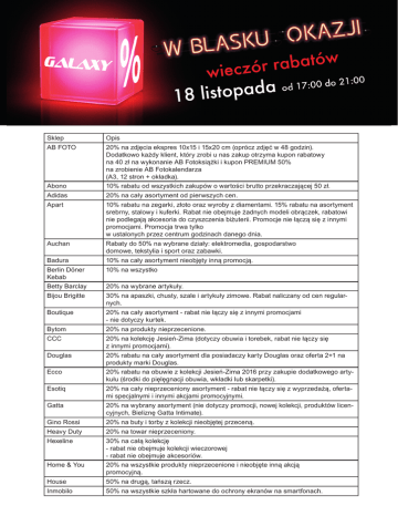 Sklep Opis AB FOTO 20% na zdjęcia ekspres 10x15 i 15x20 cm (oprócz zdjęć w 48 godzin). Dodatkowo każdy klient, który zrobi u nas zakup otrzyma kupon rabatowy na 40 zł na wykonanie AB Fotoksiążki i kupon PREMIUM 50% na zrobienie AB Fotokalendarza (A3, 12 stron + okładka). Abono 10% rabatu od wszystkich zakupów o wartości brutto przekraczającej 50 zł. Adidas 20% na cały asortyment od pierwszych cen. Apart 10% rabatu na zegarki, złoto oraz wyroby z diamentami. 15% rabatu na asortyment srebrny, stalowy i kuferki. Rabat nie obejmuje żadnych modeli obrączek, rabatowi nie podlegają akcesoria do czyszczenia biżuterii. Promocje nie łączą się z innymi promocjami. Promocja trwa tylko w ustalonych przez centrum godzinach danego dnia. Auchan Rabaty do 50% na wybrane działy: elektromedia, gospodarstwo domowe, tekstylia i sport oraz zabawki. Badura 10% na cały asortyment nieobjęty inną promocją. Berlin Döner Kebab 10% na wszystko Betty Barclay 20% na wybrane artykuły. Bijou Brigitte 30% na apaszki, chusty, szale i artykuły zimowe. Rabat naliczany od cen regularnych. Boutique 20% na cały asortyment - rabat nie łączy się z innymi promocjami - nie dotyczy kurtek. Bytom 20% na produkty nieprzecenione. CCC 20% na kolekcję Jesień-Zima (dotyczy obuwia i torebek, rabat nie łączy się z innymi promocjami). Douglas 20% rabatu na cały asortyment dla posiadaczy karty Douglas oraz oferta 2+1 na produkty marki Douglas. Ecco 20% rabatu na obuwie z kolekcji Jesień-Zima 2016 przy zakupie dodatkowego artykułu (środki do pięlęgnacji obuwia, wkładki lub skarpetki). Esotiq 20% na cały nieprzeceniony asortyment - rabat nie łączy się z wyprzedażą, ofertami specjalnymi i innymi akcjami promocyjnymi. Gatta 20% na wybrany asortyment (nie dotyczy promocji, nowej kolekcji, produktów licencyjnych, Bieliznę Gatta Intimate). Gino Rossi 20% na buty i torby z kolekcji nieobjętej przeceną. Heavy Duty 20% na towar nieprzeceniony. Hexeline 30% na całą kolekcję - rabat nie obejmuje kolekcji wieczorowej - rabat nie obejmuje akcesoriów. Home & You 20% na wszystkie produkty nieprzecenione i nieobjęte inną akcją promocyjną. House 50% na drugą, tańszą rzecz. Inmobilo 50% na wszystkie szkła hartowane do ochrony ekranów na smartfonach. Jupi Park Druga godzina gratis, przy zakupie minimum biletu 1-godzinnego. Kuchnia Pekin 15% na wszystko. Kuchnia Polska 15% na wszystko. Levis 20% przy zakupie minimum 2 sztuk na paragonie. LKJ rabaty od 20% do 70%. Marilyn 20% na cały nieprzeceniony asortyment - oferta nie łączy się z innymi promocjami. Maxima 50% na wybrane modele, reszta kolekcji -20%. Monnari wszystko -40% - rabaty nie łączą się z innymi promocjami. Mustang Jeans 20% na wszystkie produkty z kolekcji Jesień-Zima 2016. NeoNail 10% na wszystkie lakiery hybrydowe MONO UV 3 IN 1 LACK. Nike 20% na cały asortyment - od pierwszych cen na metce. North Fish Łosoś norweski SF ze szpinakiem + dodatki jesz ile chcesz za 18,99 zł. Mintaj panierowany z dodatkami za 12,99 zł. Knarr + frytki + napój 0,4 za 9,99 zł. Orsay 20% na całą kolekcję (nieprzecenioną). Pierre Cardin 15% na produkty nieprzecenione Pizza Hut Duża Pizza w cenie średniej (dotyczy pizzy na cieście pan i tradycyjnym). Pretty One 20% na całą kolekcję. Promod 20% zniżki przy zakupie 2 nieprzecenionych produktów. Puccini 50% na bagaż - rabat naliczany od pierwszej ceny produktu. Ryłko Rabat 10% przy zakupie za minimum 300 zł. Salad Story 20% na cały asortyment. Salon Terpiłowski 30% na wybrane modele zegarków. Samsonite Rabaty do 50%. Simple 20% na wszystkie sukienki - promocja nie łączy się z innymi promocjami i rabatami. Solar 15% przy zakupie 2 szt. lub więcej (rabat obowiązuje na rzeczy nieprzecenione) Subway 15% rabatu na zestaw kanapek 15cm i 30cm. Sunloox 15% na kompletną parę okularów korekcyjnych. Super-Pharm Z kartą LIFESTYLE: -25% dermokosmetyki -25% produkty do makijażu -20% koloryzacja -25% suplementy diety: witaminy i minerały *RABAT OD CEN REGULARNYCH. Swarovski Od kwoty: 400 zł - 499 zł rabat 10% 500 zł - 599 zł rabat 15% powyżej 600 zł rabat 20%. Swiss Rabat 50 zł przy zakupie Szwajcarskiego zegarka - promocje nie łączą się ze sobą. Taranko 20% na całą kolekcję, z wyłączeniem Limited Edition. Tatuum 20% rabatu. Unisono 20% rabatu na cały asortyment - rabat nie łączy się z innymi promocjami. Vistula 30% rabatu na całą kolekcję - rabat obowiązuje od cen regularnych i nie łączy się z innymi promocjami. W.Kruk 15% na biżuterię - nie dotyczy kolekcji Obsydian Amore, marki Damiani oraz obrączek - rabaty nie sumują się. Wojas 20% na cały asortyment nieprzeceniony. Wólczanka 30% rabatu na całą kolekcję - rabat obowiązuje od cen regularnych i nie łączy się z innymi promocjami. Yogo Factory 60% rabatu na drugi świeży sok. Druga porcja lodów Fresh Gelato za 1 zł. YES Salon Jubilerski 10% na cały asortyment, obowiązujący w godzinach 17-21. Rabat nie łączy się z innymi promocjami.