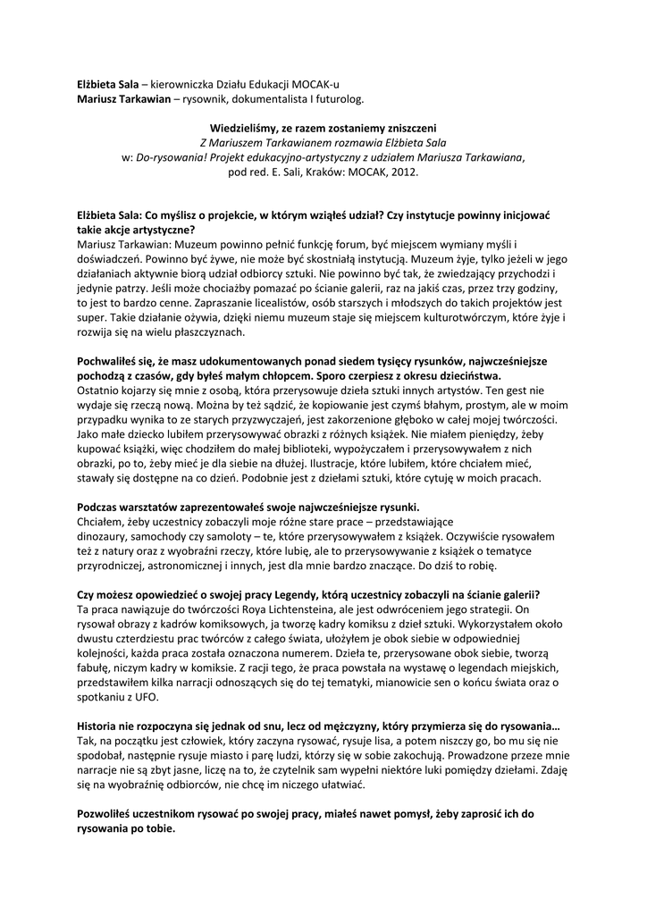 Elżbieta Sala – kierowniczka Działu Edukacji MOCAK-u Mariusz Tarkawian – rysownik, dokumentalista I futurolog. Wiedzieliśmy, ze razem zostaniemy zniszczeni Z Mariuszem Tarkawianem rozmawia Elżbieta Sala w: Do-rysowania! Projekt edukacyjno-artystyczny z udziałem Mariusza Tarkawiana, pod red. E. Sali, Kraków: MOCAK, 2012. Elżbieta Sala: Co myślisz o projekcie, w którym wziąłeś udział? Czy instytucje powinny inicjowad takie akcje artystyczne? Mariusz Tarkawian: Muzeum powinno pełnid funkcję forum, byd miejscem wymiany myśli i doświadczeo. Powinno byd żywe, nie może byd skostniałą instytucją. Muzeum żyje, tylko jeżeli w jego działaniach aktywnie biorą udział odbiorcy sztuki. Nie powinno byd tak, że zwiedzający przychodzi i jedynie patrzy. Jeśli może chociażby pomazad po ścianie galerii, raz na jakiś czas, przez trzy godziny, to jest to bardzo cenne. Zapraszanie licealistów, osób starszych i młodszych do takich projektów jest super. Takie działanie ożywia, dzięki niemu muzeum staje się miejscem kulturotwórczym, które żyje i rozwija się na wielu płaszczyznach. Pochwaliłeś się, że masz udokumentowanych ponad siedem tysięcy rysunków, najwcześniejsze pochodzą z czasów, gdy byłeś małym chłopcem. Sporo czerpiesz z okresu dzieciostwa. Ostatnio kojarzy się mnie z osobą, która przerysowuje dzieła sztuki innych artystów. Ten gest nie wydaje się rzeczą nową. Można by też sądzid, że kopiowanie jest czymś błahym, prostym, ale w moim przypadku wynika to ze starych przyzwyczajeo, jest zakorzenione głęboko w całej mojej twórczości. Jako małe dziecko lubiłem przerysowywad obrazki z różnych książek. Nie miałem pieniędzy, żeby kupowad książki, więc chodziłem do małej biblioteki, wypożyczałem i przerysowywałem z nich obrazki, po to, żeby mied je dla siebie na dłużej. Ilustracje, które lubiłem, które chciałem mied, stawały się dostępne na co dzieo. Podobnie jest z dziełami sztuki, które cytuję w moich pracach. Podczas warsztatów zaprezentowałeś swoje najwcześniejsze rysunki. Chciałem, żeby uczestnicy zobaczyli moje różne stare prace – przedstawiające dinozaury, samochody czy samoloty – te, które przerysowywałem z książek. Oczywiście rysowałem też z natury oraz z wyobraźni rzeczy, które lubię, ale to przerysowywanie z książek o tematyce przyrodniczej, astronomicznej i innych, jest dla mnie bardzo znaczące. Do dziś to robię. Czy możesz opowiedzied o swojej pracy Legendy, którą uczestnicy zobaczyli na ścianie galerii? Ta praca nawiązuje do twórczości Roya Lichtensteina, ale jest odwróceniem jego strategii. On rysował obrazy z kadrów komiksowych, ja tworzę kadry komiksu z dzieł sztuki. Wykorzystałem około dwustu czterdziestu prac twórców z całego świata, ułożyłem je obok siebie w odpowiedniej kolejności, każda praca została oznaczona numerem. Dzieła te, przerysowane obok siebie, tworzą fabułę, niczym kadry w komiksie. Z racji tego, że praca powstała na wystawę o legendach miejskich, przedstawiłem kilka narracji odnoszących się do tej tematyki, mianowicie sen o koocu świata oraz o spotkaniu z UFO. Historia nie rozpoczyna się jednak od snu, lecz od mężczyzny, który przymierza się do rysowania… Tak, na początku jest człowiek, który zaczyna rysowad, rysuje lisa, a potem niszczy go, bo mu się nie spodobał, następnie rysuje miasto i parę ludzi, którzy się w sobie zakochują. Prowadzone przeze mnie narracje nie są zbyt jasne, liczę na to, że czytelnik sam wypełni niektóre luki pomiędzy dziełami. Zdaję się na wyobraźnię odbiorców, nie chcę im niczego ułatwiad. Pozwoliłeś uczestnikom rysowad po swojej pracy, miałeś nawet pomysł, żeby zaprosid ich do rysowania po tobie. To był eksperyment, chciałem zobaczyd, jak to wyjdzie. Nie zawsze daje się ludziom możliwośd rysowania po czyjejś pracy, to jest ryzykowne, nie wiadomo, co zrobią, mogą ją zepsud na przykład, efekt może się nie spodobad autorowi. W tym przypadku mogłem sobie na to ryzyko pozwolid, ponieważ wiedziałem, że ta praca zostanie zamalowana. Oni też o tym wiedzieli i dzięki temu mogliśmy wszyscy bardziej zaszaled. Może o to chodzi: wiedzieliśmy, że razem zostaniemy zniszczeni. Zresztą i tak wszyscy umrzemy [śmiech]. Wszystkie przerysowane przez ciebie dzieła ponumerowałeś i stworzyłeś coś w rodzaju bibliografii. Podczas warsztatów dopisałeś do listy prace ich uczestników. Tak, skoro zaprosiliśmy uczestników do sali galeryjnej, w której była już narracja budowana przez moją pracę, to oni stali się automatycznie jej współtwórcami, zaczęli ją kontynuowad, wychodzid jej naprzeciw, a nawet ją niszczyd. Chciałem w ten sposób postawid ich na równi z artystami, których cytowałem na tej ścianie. Myślę, że to mogło się im nawet spodobad. Co myślisz o efekcie spotkania? W ciągu trzech godzin powstało bardzo, bardzo dużo prac, byłem zaskoczony, że aż tyle można narysowad w tak krótkim czasie. Dla mnie było to ciekawe doświadczenie, bo rzadko jest tak, że zbiera się grupa zupełnie obcych sobie ludzi i zaczyna rysowad, tak po prostu, razem. Ciekawe było to, że niektóre prace zaczęły ze sobą korespondowad, ktoś coś narysował i potem inna osoba coś dorysowywała, jakiś komentarz do tego obrazka. To było najfajniejsze w tym wszystkim. Rysunki, które powstały, są najprzeróżniejsze. Jest Jezus, jest Batman, roboty, czaszki, oczy, klaun, Joker z Batmana, Gwiezdne wojny, miasto. Każdy z uczestników malował coś innego i taka mieszanina kilkudziesięciu prac była bardzo odświeżająca. Czy brałeś udział w podobnych przedsięwzięciach? Czy rysowałem razem z innymi ludźmi? Nie. Ja nie lubię rysowad z kimś, nie tworzę żadnych grup artystycznych. To było więc dla mnie ciekawe i może dla niektórych uczestników warsztatów również. Spotykając się z obcymi ludźmi, musieli otwo