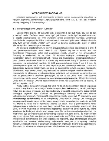 WYPOWIEDZI MODALNE (niniejsze opracowanie jest nieznacznie skróconą wersją opracowania zawartego w książce Zygmunta Ziembińskiego Logika pragmatyczna. (wyd. XIX, s. 121128). Polecam lekturę całej pracy Z. Ziembińskiego.) § l. Interpretacje słów „musi" i „może" Często mówi się nie, że tak a tak jest, lecz że tak a tak być musi, czy też, że tak a tak być może. Zarówno zwrot „musi być", jak i zwrot „może być" są wieloznaczne, a częste posługiwanie się tymi zwrotami przez prawników wymaga uważnego rozróżniania przynajmniej kilku podstawowych znaczeń tych słów. Niejednokrotnie przy tym użycie zwrotu „może" czy „musi" w pewnej wypowiedzi łączy w sobie elementy kilku zasadniczych znaczeń. „W trójkącie prostokątnym, w którym przyprostokątne mają odpowiednio 3 cm i 4 cm, przeciwprostokątna musi mieć 5 cm". Zgodzi się na to każdy, kto zna twierdzenie Pitagorasa. Jakie jest znaczenie zwrotu „musi" w tym przykładzie? Chcemy tu stwierdzić, że ze zdań: „W każdym trójkącie prostokątnym suma kwadratów boków przyprostokątnych równa się kwadratowi przeciwprostokątnej" oraz „Suma kwadratów liczb 3 i 4 równa się kwadratowi liczby 5" (które to zdania uznajemy za prawdziwe) wynika, że jeśli przyprostokątne mają 3 cm i 4 cm, to przeciwprostokątna ma 5 cm — taka implikacja jest bowiem prawdziwa i zachodzi odpowiedni związek między tym, co głosi jej poprzednik, a tym. co głosi następnik. Użyliśmy tu więc słowa „musi", aby wskazać na pewien związek między zdaniami: mianowicie na stosunek wynikania między zdaniami już uprzednio uznanymi przez nas za prawdziwe a zdaniem głoszącym, że tak a tak „musi" być. Taki sposób rozumienia zwrotu „musi" nazywamy jego interpretacją logiczną. W tej interpretacji „musi być A" znaczy: „Wśród zdań uznanych przez nas za prawdziwe są zdania, z których wynika, że A" . Kiedy indziej zwracamy uwagę nie tylko na to, iż „konieczność” zdania A polega na tym, iż wynika ono ze zdań już stwierdzonych, lecz także na to, że fakt, o którym mówi się, że musi wystąpić, jest spowodowany w sposób nieuchronny przez jakieś istniejące czynniki. Np.: „Oddział nie posiadający amunicji musi ulec dobrze uzbrojonemu wrogowi”. Taki sposób rozumienia zwrotu „musi być A” nazywamy jego interpretacją dynamiczną. W tej interpretacji „musi być A" znaczy: „W istniejącym zespole okoliczności są czynniki, które nieuchronnie powodują że realizuje się fakt A". Mowa tu więc nie o wynikaniu zdania ze zdań, lecz o powodowaniu faktu opisywanego w zdaniu przez inne fakty. Jeżeli Piotr jest o miesiąc starszy od ojca Zofii, to Piotr musi być (w interpretacji logicznej) starszy od Zofii: wynika to, skoro wiadomo, że Zofia jest młodsza od swego ojca. Nie można natomiast powiedzieć, że Piotr musi być (w interpretacji dynamicznej) starszy od Zofii, bo to, że Piotr urodził się przed ojcem Zofii, nie jest przyczyną urodzenia się Zofii w latach późniejszych. Interpretacja dynamiczna jest więc węższa niż logiczna, gdyż stwierdzając związek wynikania nie zawsze stwierdzamy odpowiedni związek przyczynowy między faktami, o których mowa w zdaniach składowych implikacji. Skoro teraz jest dzień w Poznaniu, to wkrótce musi nastąpić noc; ale dzień nie jest przyczyną nocy. Od logicznej i dynamicznej interpretacji słowa „musi" różnią się zasadniczo jego dwie inne interpretacje: aksjologiczna i tetyczna. W interpretacji aksjologicznej używamy zwrotu „musi być A" dla wyrażenia oceny, że aprobujemy stan A, a dezaprobujemy stan nieA, inaczej: że byłoby źle z jakiegoś względu, gdyby było inaczej niż A. Zdanie „Temperatura w pokoju musi wynosić 18°C" wzięte w interpretacji aksjologicznej nie znaczy, iż zdanie stwierdzają taką wysokość temperatury wynika z innych zdań uznanych za prawdziwe, ani też, że ta wysokość temperatury jest nieuchronnie spowodowana przez działające w danej sytuacji czynniki, ale to, że byłoby źle, gdyby temperatura w pokoju była inna niż 18°C bo nie udałoby się nam jakieś doświadczenie, bo zaszkodziłoby to naszemu zdrowiu itp. Pamiętajmy przy tym, że zazwyczaj zastanawiając się nad tym, czy gdy będzie tak a tak, czy to będzie dobrze czy źle, bierzemy w jakiś sposób pod rozwagę wszystkie strony dobre i wszystkie złe, i dokonujemy oceny globalnie. Musimy leczyć zęby, bo choć to bywa bolesne, chroni przed większym jeszcze boku i chorobami. Brany w interpretacji tetycznej zwrot „musi być A" znaczy tyle co: „zrealizowanie stanu rzeczy A jest komuś nakazane przez jakąś normę;'' Jeżeli sędzia orzeka karę śmierci, to musi też orzec karę pozbawienia praw publicnych. Zwrot „musi" nie wyraża w tym przypadku myśli, że źle będzie, jeśli sędzia tej kary nie orzeknie, lecz myśl, że wymierzenie w tym przypadku kary utraty praw publicznych nakazane jest przez obowiązującą sędziego normę — a mianowicie normę wyrażoną w przepisie art. 40 § l k.k. Piotr nie musi (w interpretacji aksjologicznej) grać w szachy; jak ni będzie grał, nic złego się nie stanie. Nie musi też (w interpretacji tetycznej) grać w szachy, bo nikt nie narzucił mu normy nakazującej grę. Ale jeśli gra białymi, to musi zrobić pierwszy ruch. „Musi" (w interpretacji tetycznej), bo tak nakazują jakieś normy, w tym przypadku — normy obowiązujące tego, kto przystąpi do gry w szachy przyjmując tym samym, że będzie przestrzegać reguł tej gry. Te cztery interpretacje słowa „musi" wymagały w każdym przypadku relatywizacji, odniesienia do czegoś: 1) przy interpretacji logicznej — do zdań uprzednio przez nas stwierdzonych, a więc do stanu naszej wiedzy; 2) przy interpretacji dynamicznej — do istniejącego układu czynników, które mają być przyczyną czegoś, o czym mowa; 3) przy interpretacji aksjologicznej — do czyichś ocen; 4) prz
