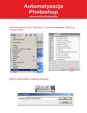 Automatyzacja Photoshop www.studiocdr.pl/grafika Jeśli nie widzisz okna „Operacje” w swoim programie, otwórz je z menu Okno. Utwórz swój zestaw (katalog) poleceń. Tworzymy nowy zestaw poleceń. Jak widać ikona Record jest aktywna. Można teraz wykonywać polecenia, które będą rejestrowane np. zamiana trybu zdjęcia na Odcienie szarości. Do zatrzymania procesu rejestracji służy przycisk Stop Teraz wystarczy, że zaznaczymy interesujące nas polecenia i wciśniemy przycisk Play Warto wspomnieć o pełnej automatyzacji, która potrafi przetworzyć całe katalogi zdjęć. Sekwencja wsadowa korzysta z zarejestrowanych wcześniej poleceń.