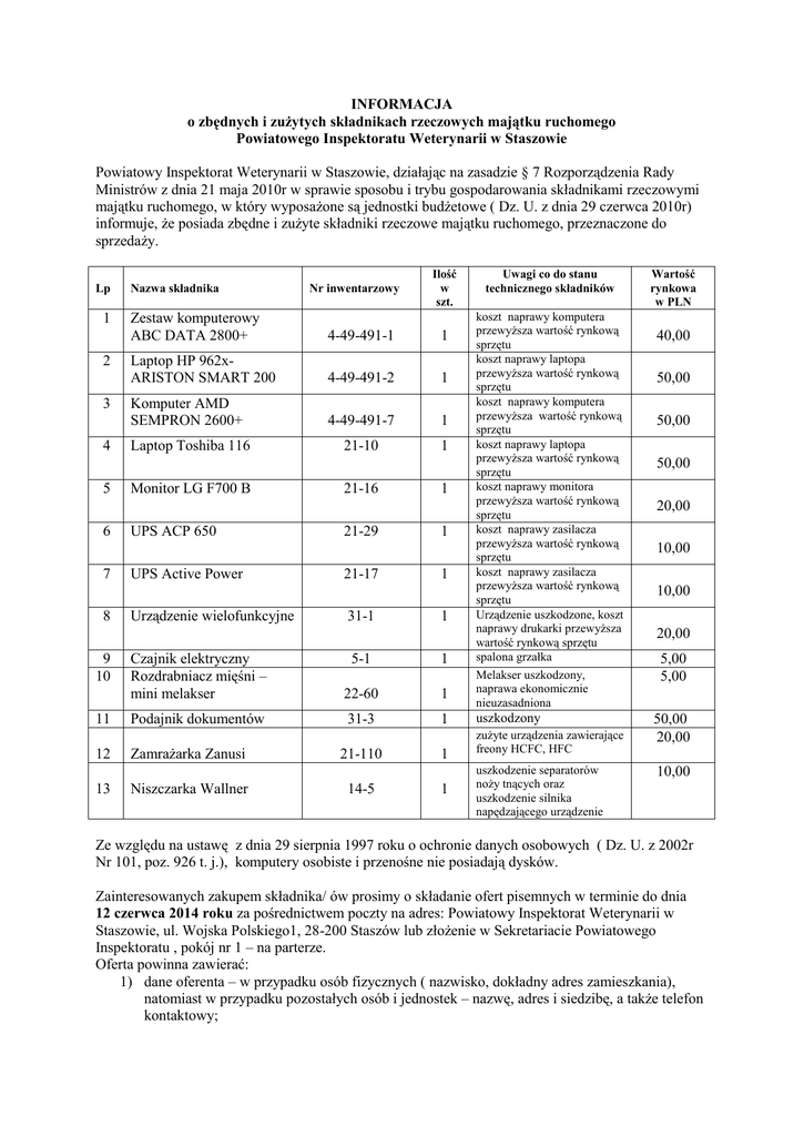 INFORMACJA o zbędnych i zużytych składnikach rzeczowych majątku ruchomego Powiatowego Inspektoratu Weterynarii w Staszowie Powiatowy Inspektorat Weterynarii w Staszowie, działając na zasadzie § 7 Rozporządzenia Rady Ministrów z dnia 21 maja 2010r w sprawie sposobu i trybu gospodarowania składnikami rzeczowymi majątku ruchomego, w który wyposażone są jednostki budżetowe ( Dz. U. z dnia 29 czerwca 2010r) informuje, że posiada zbędne i zużyte składniki rzeczowe majątku ruchomego, przeznaczone do sprzedaży. Lp 1 2 3 4 5 6 7 8 9 10 11 12 13 Nazwa składnika Nr inwentarzowy Ilość w szt. Zestaw komputerowy ABC DATA 2800+ 4-49-491-1 1 Laptop HP 962xARISTON SMART 200 4-49-491-2 1 Komputer AMD SEMPRON 2600+ 4-49-491-7 1 Laptop Toshiba 116 21-10 1 Monitor LG F700 B UPS ACP 650 UPS Active Power Urządzenie wielofunkcyjne 21-16 21-29 21-17 31-1 1 1 1 1 Czajnik elektryczny Rozdrabniacz mięśni – mini melakser 5-1 1 22-60 1 Podajnik dokumentów 31-3 1 Zamrażarka Zanusi Niszczarka Wallner 21-110 14-5 1 1 Uwagi co do stanu technicznego składników koszt naprawy komputera przewyższa wartość rynkową sprzętu koszt naprawy laptopa przewyższa wartość rynkową sprzętu koszt naprawy komputera przewyższa wartość rynkową sprzętu koszt naprawy laptopa przewyższa wartość rynkową sprzętu koszt naprawy monitora przewyższa wartość rynkową sprzętu koszt naprawy zasilacza przewyższa wartość rynkową sprzętu koszt naprawy zasilacza przewyższa wartość rynkową sprzętu Urządzenie uszkodzone, koszt naprawy drukarki przewyższa wartość rynkową sprzętu spalona grzałka Melakser uszkodzony, naprawa ekonomicznie nieuzasadniona uszkodzony zużyte urządzenia zawierające freony HCFC, HFC uszkodzenie separatorów noży tnących oraz uszkodzenie silnika napędzającego urządzenie Wartość rynkowa w PLN 40,00 50,00 50,00 50,00 20,00 10,00 10,00 20,00 5,00 5,00 50,00 20,00 10,00 Ze względu na ustawę z dnia 29 sierpnia 1997 roku o ochronie danych osobowych ( Dz. U. z 2002r Nr 101, poz. 926 t. j.), komputery osobiste i przenośne nie posiadają dysków. Zainteresowanych zakupem składnika/ ów prosimy o składanie ofert pisemnych w terminie do dnia 12 czerwca 2014 roku za pośrednictwem poczty na adres: Powiatowy Inspektorat Weterynarii w Staszowie, ul. Wojska Polskiego1, 28-200 Staszów lub złożenie w Sekretariacie Powiatowego Inspektoratu , pokój nr 1 – na parterze. Oferta powinna zawierać: 1) dane oferenta – w przypadku osób fizycznych ( nazwisko, dokładny adres zamieszkania), natomiast w przypadku pozostałych osób i jednostek – nazwę, adres i siedzibę, a także telefon kontaktowy; 2) wykaz składników majątku objętych ofertą ze wskazaniem nazwy składników, 3) Oświadczenie oferenta, że zapoznał się ze stanem składników majątku, lub że ponosi odpowiedzialność za skutki wynikające z rezygnacji oględzin, 4) Oferowane ceny za poszczególne składniki majątku ruchomego, (wzór formularza ofertowego stanowi załącznik nr 1 ) W przypadku wpływu co najmniej dwóch ofert dotyczących nabycia tego samego składnika majątku ruchomego Powiatowy Inspektorat Weterynarii w Staszowie dodatkowo przeprowadzi aukcję, pomiędzy tymi osobami. Powiatowy Inspektorat Weterynarii w Staszowie zastrzega sobie prawo do odwołania oferty sprzedażowej ( całej lub części) bez podania przyczyn. Szczegółowych informacji na temat składników rzeczowych majątku ruchomego można uzyskać w Powiatowym Inspektoracie Weterynarii w Staszowie pod numerem telefonu 15 8642536, w tym informacji dot. stanu technicznego sprzętu informatycznego udziela Krzysztof Piórkowski tel. kom. 601062436. Składniki rzeczowe majątku ruchomego można obejrzeć w siedzibie Powiatowego Inspektoratu Weterynarii w Staszowie w terminie do dnia 11 czerwca 2014 roku w godzinach od 10,00 do 14,00, po uprzednim zgłoszeniu telefonicznym. Zakupione składniki majątku ruchomego zostaną wydane po dokonaniu wpłaty przelewem na rachunek bankowy sprzedającego nr 77 1010 1238 0856 6122 3100 0000. Jeżeli w/w składniki majątku ruchomego nie zostaną sprzedane, zostaną fizyczne zlikwidowane, przy czym sprzęt informatyczny oraz AGD zostanie przekazany do Przedsiębiorstwa Gospodarki Komunalnej i Mieszkaniowej, Składowisko Odpadów w Staszowie. Informacja została umieszczona na tablicy ogłoszeń w siedzibie Powiatowego Inspektoratu Weterynarii w Staszowie oraz na stronie internetowej [email protected] Kierownik Powiatowego Inspektoratu Weterynarii w Staszowie lek. wet. Zofia Słomka Załącznik Nr 1 Formularz ofertowy …………………………………………. ( imię i nazwisko/ nazwa firmy) …………………………………………. …………………………………………. (miejsce zamieszkania/ siedziby firmy Oferenta) …………………………………………………… Telefon ………………. Fax ……………………. Powiatowy Inspektorat Weterynarii 28 – 200 Staszów ul. Wojska Polskiego 1 W odpowiedzi na ogłoszenie dotyczące sprzedaży zbędnych składników majątku ruchomego, składam ofertę zakupu następujących składników: 1. ………………………………………………………………………………………. 2. ( należy podać nazwę składnika, nr inwentarzowy oraz cenę) ………………………………………………………………………………………………………….. 3. ………………………………………………………………………………………………………….. - oświadczam, że zapoznałem się ze stanem technicznym składników majątku * - ponoszę odpowiedzialność za skutki wynikające z rezygnacji oględzin*, *niepotrzebne skreślić ………………………………….. ( podpis oferenta)