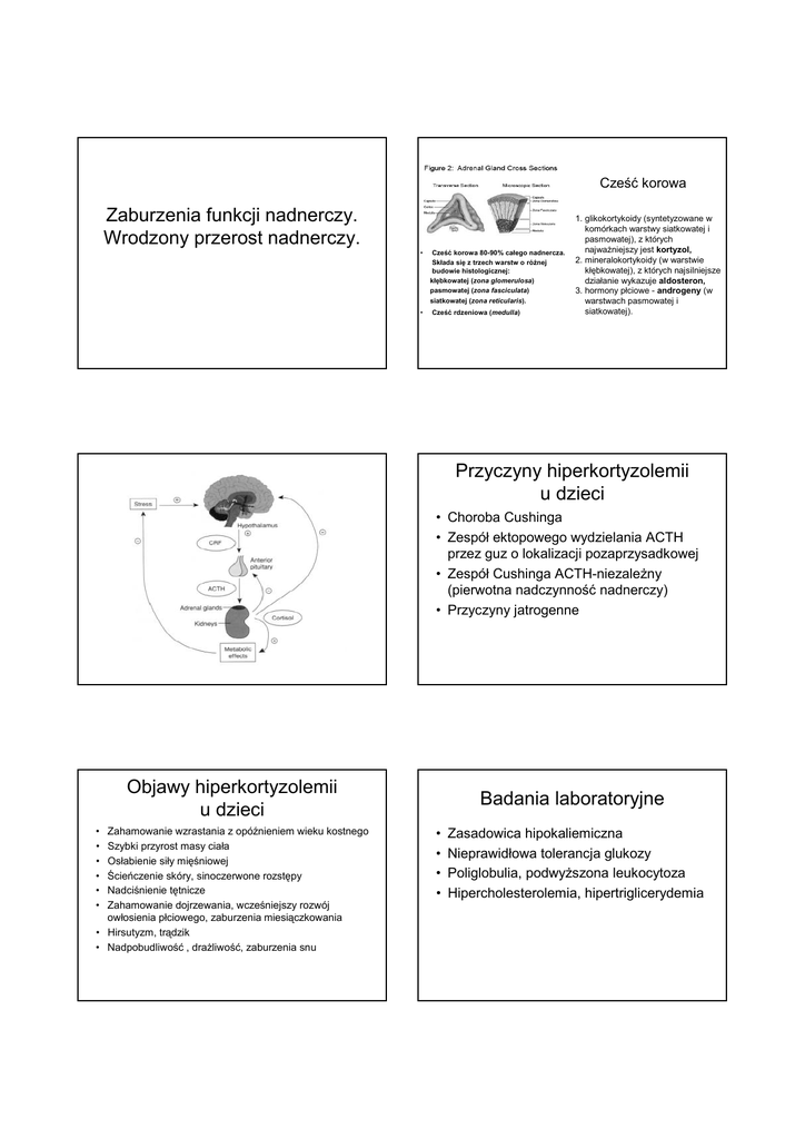 Cześć korowa Zaburzenia funkcji nadnerczy. Wrodzony przerost nadnerczy. • Cześć korowa 80-90% całego nadnercza. Składa się z trzech warstw o różnej budowie histologicznej: kłębkowatej (zona glomerulosa) pasmowatej (zona fasciculata) siatkowatej (zona reticularis). • Cześć rdzeniowa (medulla) 1. glikokortykoidy (syntetyzowane w komórkach warstwy siatkowatej i pasmowatej), z których najważniejszy jest kortyzol, 2. mineralokortykoidy (w warstwie kłębkowatej), z których najsilniejsze działanie wykazuje aldosteron, 3. hormony płciowe - androgeny (w warstwach pasmowatej i siatkowatej). Przyczyny hiperkortyzolemii u dzieci • Choroba Cushinga • Zespół ektopowego wydzielania ACTH przez guz o lokalizacji pozaprzysadkowej • Zespół Cushinga ACTH-niezależny (pierwotna nadczynność nadnerczy) • Przyczyny jatrogenne Objawy hiperkortyzolemii u dzieci • • • • • • Zahamowanie wzrastania z opóźnieniem wieku kostnego Szybki przyrost masy ciała Osłabienie siły mięśniowej Ścieńczenie skóry, sinoczerwone rozstępy Nadciśnienie tętnicze Zahamowanie dojrzewania, wcześniejszy rozwój owłosienia płciowego, zaburzenia miesiączkowania • Hirsutyzm, trądzik • Nadpobudliwość , drażliwość, zaburzenia snu Badania laboratoryjne • • • • Zasadowica hipokaliemiczna Nieprawidłowa tolerancja glukozy Poliglobulia, podwyższona leukocytoza Hipercholesterolemia, hipertriglicerydemia Potwierdzenie hiperkortyzolemii: • wolny kortyzol w DZM • Test nocnego hamowania Dexamethasonem • ocena rytmu dobowego kortyzolu • test klasyczny hamowania Dexamethasonem z małą dawką Diagnostyka różnicowa hiperkortyzolemii • Poziom ACTH -nieoznaczalny lub niski : autonomiczna synteza kortyzolu w nadnerczach -podwyższony lub prawidłowy: choroba Cushinga ektopowe wydzielanie ACTH niektóre z.makroguzkowego przerostu nadnerczy Diagnostyka różnicowa hiperkortyzolemii • Test hamowania Dexamethasonem (z dużą dawką) -w chorobie Cushinga spadek poziomu kortyzolu o co najmniej 50% -w przypadku autonomicznego wydzielania kortyzolu lub ektopowego wydzielania ACTH brak efektu Diagnostyka różnicowa hiperkortyzolemii Różnicowanie ch.Cushinga z ektopowym wydzielaniem ACTH •Test z CRH (1 ug/kg m.c. i.v.) : w ch.Cushinga : po 15 min wzrost ACTH o 50%, po 30 min. wzrost kortyzolu o 20% (zwykle brak odpowiedzi w pozostałych przyczynach hiperkortyzolemii) •Obustronne cewnikowanie dolnych zatok skalistych kości skroniowych Przyczyny pierwotnej niedoczynności kory nadnerczy Niedoczynność nadnerczy u dzieci 1. Wtórna niedoczynność nadnerczy (przysadkowa i/lub podwzgórzowa). - może mieć podłoże genetyczne związane np. z mutacją czynników transkrypcyjnych niezbędnych do prawidłowego różnicowania przysadki i ekspresji genów (Pit1, Prop1, HESX1) - choroby rozrostowe ,stany po niedotlenieniu, wady wrodzone 2. 3. 4. 5. 6. Choroby autoimmunologiczne /autoimmunologiczne podłoże; postać izolowana lub występująca z innymi chorobami autoimmunologicznymi Infekcje-grzybice, gruźlica, posocznica, AIDS WPN (wrodzony przerost nadnerczy Adrenoleukodystrofia X-ALD Zespół niewrażliwości nadnerczy na ACTH chromosom 12q13 (ALADIN lub AAAS gen) Wrodzony niedorozwój nadnerczy (AHC) Objawy kliniczne: takie jak w wrodzonym przeroście kory nadnerczy bez wzrostu zwiększonego wydzielania 17-OHP, adrogenów i pregnanów. Objawy kliniczne niedoczynności kory nadnerczy u dzieci • Osłabienie • Spadek masy ciała, nudności, wymioty, biegunki, bóle brzucha • Chwiejność emocjonalna • Niskie ciśnienie tętnicze • Hiperpigmentacja skóry i błon śluzowych (nie występuje w niedoczynności wtórnej) Badania laboratoryjne: • Tendencja do hipoglikemii • Niedokrwistość normocytarna • Hiponatremia, hiperkaliemia, kwasica metaboliczna (zwłaszcza przy niedoborze mineralokortykoidów) Diagnostyka niedoczynności kory nadnerczy Wrodzony przerost nadnerczy • Test stymulacyjny z ACTH -odpowiedź prawidłowa stężenie kortyzolu > 21 ug/dl • Ocena stężenia ACTH w warunkach podstawowych • Test hipoglikemii poinsulinowej ( ocena obniżonej rezerwy przysadkowej w zakresie wydzielania ACTH) • Wrodzony przerost nadnerczy to wrodzone zaburzenie steroidogenezy nadnerczowej związane z niedoborem jednego z enzymów niezbędnych do jej prawidłowego przebiegu • W większości przypadków prowadzi to do niedoboru kortyzolu, zwiększenia sekrecji ACTH, przerostu nadnerczy i wzrostu wydzielania androgenów Objawy podmiotowe i przedmiotowe u dzieci sugerujące rozpoznanie wrodzonego przerostu kory nadnerczy • Nieprawidłowy wygląd narządów płciowych • Obustronne wnętrostwo lub wnętrostwo i spodziectwo • Stany odwodnienia trudno poddające się leczeniu • Wywiad rodzinny w kierunku wpn, niejasne zgony noworodków lub niemowląt w rodzinie • Przedwczesne dojrzewanie płciowe /u chłopców/ • Przedwczesny rozwój owłosienia płciowego, hirsutyzm, wirylizacja /u dziewczynek/ • Nadciśnienie tętnicze WPN postać klasyczna bez utraty soli -objawy Wrodzony przerost nadnerczy; niedobór 21-hydroksylazy • Forma klasyczna – z utratą i bez utraty soli • Forma nieklasyczna -łagodna lub późno ujawniająca się late-onset • Utajona - cryptic Objawy wrodzonej maskulinizacji Dominują objawy związane z nadmiarem androgenów • wrodzona maskulinizacja narządów płciowych u dziewczynek •przedwczesne pojawienie się owłosienia płciowego, mutacji, trądziku •przyspieszenie tempa wzrastania, przyspieszenie wieku kostnego, szybkie ukończenie wzrastania, niski wzrost ostateczny Klasyfikacja wg Pradera • kliteromegalia • wytworzenie zatoki moczowo-płciowej (z umiejscowieniem jej ujścia na kroczu, u podstawy przerośniętej łechtaczki lub na jej szczycie) • całkowite lub częściowe zrośnięcie fałdów wargowo-mosznowych • Typ I-nieznaczne powiększenie łechtaczki • Typ II-powiększenie łechtaczki, ujście ce