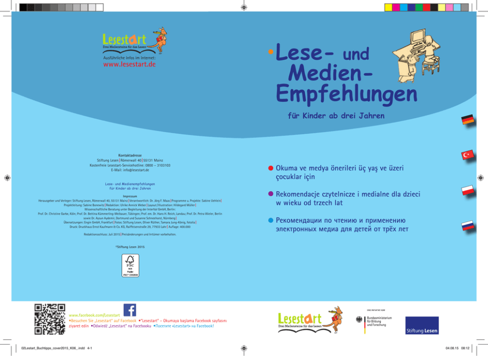 Lese- und MedienEmpfehlungen Ausführliche Infos im Internet: www.lesestart.de für Kinder ab drei Jahren Kontaktadresse Stiftung Lesen | Römerwall 40 | 55131 Mainz Kostenfreie Lesestart-Servicehotline: 0800 – 3103103 E-Mail: [email protected] Lese- und Medienempfehlungen für Kinder ab drei Jahren Impressum Herausgeber und Verleger: Stiftung Lesen, Römerwall 40, 55131 Mainz | Verantwortlich: Dr. Jörg F. Maas | Programme u. Projekte: Sabine Uehlein| Projektleitung: Sabine Bonewitz | Redaktion: Ulrike Annick Weber | Layout /Illustration: Hildegard Müller | Wissenschaftliche Beratung unter Begleitung der InterVal GmbH, Berlin: Prof. Dr. Christine Garbe, Köln; Prof. Dr. Bettina Kümmerling-Meibauer, Tübingen; Prof. em. Dr. Hans H. Reich, Landau; Prof. Dr. Petra Wieler, Berlin sowie Dr. Aysun Aydemir, Dortmund und Susanne Schneehorst, Nürnberg | Übersetzungen: Engin GmbH, Frankfurt | Fotos: Stiftung Lesen, Oliver Rüther, Tamara Jung-König, fotolia | Druck: Druckhaus Ernst Kaufmann & Co. KG, Raiffeisenstraße 29, 77933 Lahr | Auflage: 400.000 Redaktionsschluss: Juli 2015 | Preisänderungen und Irrtümer vorbehalten. Okuma ve medya önerileri üç yaş ve üzeri çocuklar için Rekomendacje czytelnicze i medialne dla dzieci w wieku od trzech lat Рекомендации по чтению и применению электронных медиа для детей от трёх лет ©Stiftung Lesen 2015 Facebook “f ” Logo CMYK / .eps Facebook “f ” Logo CMYK / .eps www.facebook.com/Lesestart •Besuchen Sie „Lesestart“ auf Facebook •“Lesestart” – Okumaya başlama Facebook sayfasını ziyaret edin •Odwiedź „Lesestart” na Facebooku •Посетите «Lesestart» на Facebook! 02Lestart_Buchtipps_cover2015_K06_.indd 4-1 04.08.15 08:12 Vorwort Liebe Eltern, Kostenlose Lesestart-Apps zum Download gibt es auf www.lesestart.de. jeder gemeinsame Tag ist für Sie und Ihr Kind voller vielfältiger Erlebnisse, Eindrücke und Gefühle. All diese Erfahrungen finden sich auch in Geschichten wieder. Wenn wir Bücher anschauen und lesen, werden wir unterhalten und überrascht, wir fühlen mit den Helden der Geschichten und lernen dabei eine Menge. Wer von klein auf das „Lesen“ entdeckt und erfährt, wie spannend und unterhaltsam Geschichten sind, der wird nicht mehr darauf verzichten wollen. Vorlesen und Erzählen prägen, bilden und bereiten viel Vergnügen. Ücretsiz indirebileceğiniz Lesestart uygulamaları www.lesestart.de sitesinde mevcuttur. Na stronie internetowej www.lesestart.de można pobrać bezpłatne aplikacje do programu Lesestart. Бесплатные приложения «Lesestart» можно скачать с сайта www.lesestart.de. Mit den neuen Materialien der Initiative „Lesestart – Drei Meilensteine für das Lesen“ wollen wir Sie bestärken, weiterhin gemeinsam mit Ihrem Kind in die Welt der Bücher und Geschichten einzutauchen. In dieser Lesetipp-Broschüre finden Sie zahlreiche Lese- und Medienempfehlungen für Kinder im Alter zwischen drei und fünf Jahren. Im Vorleseratgeber, den Sie auch in der Tasche finden, und im Internet unter www.lesestart.de gibt es viele Tipps zum Vorlesen in der Familie. Geeignete Bilderbücher können Sie in Ihrer Bibliothek vor Ort ausleihen, in der Sie Ihr aktuelles Lesestart-Set erhalten haben. Auch ein Besuch in einer Buchhandlung lohnt sich. Wir wünschen Ihnen gemeinsam mit Ihrem Kind weiterhin eine schöne und spannende Vorlese-Zeit. Ihr Lesestart-Team der Stiftung Lesen Fiete – Ein Tag auf dem Bauernhof Ahoiii Entertainment UG | erhältlich im AppStore und in Android-Stores | Für iOS: iPhone, iPad; Für Android: Samsung-Geräte, Kindle fire | ca. € 2.99 | ab ca. 2–3 Jahren | Yakl. 2–3 yaşından itibaren | od ok. 2–3 lat | начиная приблизительно с 2–3 лет Fiete hat auf seinem Insel-Bauernhof einiges zu tun. Ob nun Rüben gezogen, Schweinchen geschrubbt oder Kühe gemolken werden müssen, ohne die Unterstützung der kleinen App-Nutzer wäre das alles nicht zu schaffen. Die App lädt zu einfachen Spielen ein, regt aber auch zum Erzählen an. Fiete’nin ada çiftliğinde yapacak çok işi var. Havuçları toplamak, yavru domuzu temizlemek veya inekleri sağmak… Uygulamanın küçük kullanıcılarının desteği olmasaydı tüm bunları başarmak hiç mümkün olmazdı. Uygulama hem oyun 2 02Lestart_Buchtipps_cover2015_K06_.indd 2-3 www.lesestart.de facebook.com/Lesestart www.lesestart.de facebook.com/Lesestart oynamaya davet ediyor, hem de hikâye anlatmaya. Fiete ma sporo pracy na gospodarstwie, które znajduje się na wyspie. Raz trzeba wykopać buraki, innym razem wyszorować świnki, a jeszcze innym wydoić krówki, a wszystko to można zrobić tylko z pomocą małych użytkowników aplikacji, która zaprasza do prostych gier, zachęcając jednocześnie do opowiadania. Фите должен кое-что сделать на своём крестьянском дворе-острове. То ли нужно сейчас вырвать свеклу, почистить поросят или подоить коров, без поддержки маленьких пользователей приложения справиться со всем этим было бы невозможно. Прикладная программа приглашает к простой игре, но также побуждает к рассказам. 19 04.08.15 08:12 Önsöz Sevgili anne-babalar, Çocuğunuzla birlikte geçirdiğiniz her gün çok yönlü deneyim, etki ve hisler anlamına gelir. Tüm bu tecrübeler hikâyelerde de görülebilir. Kitapları incelediğimizde ve okuduğumuzda, zaman geçiririz ve hayrete düşeriz, hikâyelerdeki kahramanları anlarız ve bu esnada birçok şey öğreniriz. Küçük yaşta “okumayı” keşfeden ve hikâyelerin ne kadar heyecan verici olduğunu keşfeden biri bir daha okumayı bırakmak istemez. Okumak ve anlatmak yarat