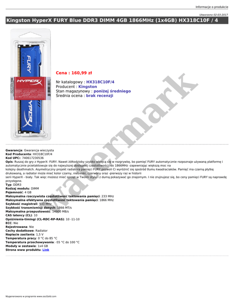 Informacje o produkcie Utworzono 02-03-2017 Kingston HyperX FURY Blue DDR3 DIMM 4GB 1866MHz (1x4GB) HX318C10F / 4 Cena : 160,99 zł er m ar k Nr katalogowy : HX318C10F/4 Producent : Kingston Stan magazynowy : poniżej średniego Średnia ocena : brak recenzji w at Gwarancja: Gwarancja wieczysta Kod Producenta: HX318C10F/4 Kod UPC:: 740617230536 Opis: Ruszaj do gry z HyperX- FURY. Nawet żółtodzioby szybko wkręcą się w rozgrywkę, bo pamięć FURY automatycznie rozpoznaje używaną platformę i automatycznie przetaktowuje się do najwyższej dostępnej częstotliwości -do 1866MHz -zapewniając większą moc na kolejny deathmatch. Asymetryczny projekt radiatora pamięci FURY pozwoli Ci wyróżnić się spośród tłumu kwadraciaków. Pamięć ma czarną płytkę drukowaną, a radiator może mieć kolor czarny, niebieski, czerwony oraz -pierwszy raz w historii serii HyperX - biały. Tak więc możesz mieć sprzęt w Twoim stylu i z dumą pokazywać go znajomym. I nie zrujnujesz się, bo ceny pamięci FURY są naprawdę przystępne. Typ: DDR3 Rodzaj modułu: DIMM Pojemność: 4 GB Maksymalna rzeczywista częstotliwość taktowania pamięci: 233 MHz Maksymalna efektywna częstotliwość taktowania pamięci: 1866 MHz Szybkość magistrali: 933 MHz Szybkość transmismisji danych: 1866 MT/s Maksymalna przepustowość: 14900 MB/s CAS latency (CL): 10 Opóźnienia-timingi (CL-RDC-RP-RAS): 10 -11-10 ECC: Nie Rejestrowana: Nie Cechy dodatkowe: Radiator Napięcie zasilania: 1,5 V Temperatura pracy: 0 °C do 85 °C Temperatura przechowywania: -55 °C do 100 °C Moduły w zestawie: 1x4 GB Strona www produktu: Link Wygenerowano w programie www.oscGold.com