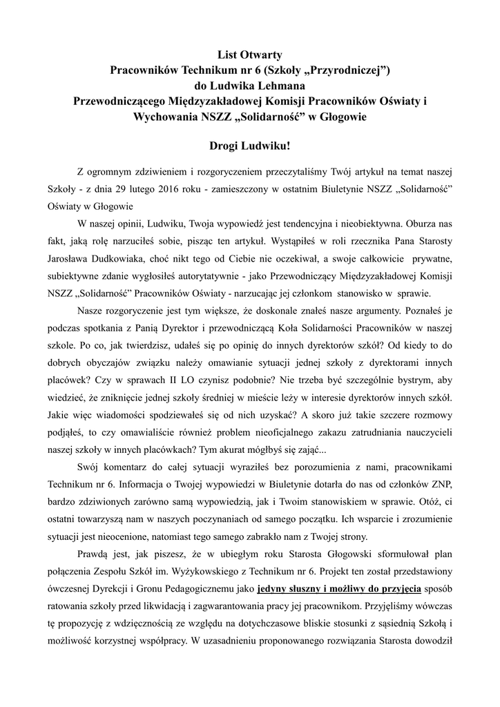 List Otwarty Pracowników Technikum nr 6 (Szkoły „Przyrodniczej”) do Ludwika Lehmana Przewodniczącego Międzyzakładowej Komisji Pracowników Oświaty i Wychowania NSZZ „Solidarność” w Głogowie Drogi Ludwiku! Z ogromnym zdziwieniem i rozgoryczeniem przeczytaliśmy Twój artykuł na temat naszej Szkoły - z dnia 29 lutego 2016 roku - zamieszczony w ostatnim Biuletynie NSZZ „Solidarność” Oświaty w Głogowie W naszej opinii, Ludwiku, Twoja wypowiedź jest tendencyjna i nieobiektywna. Oburza nas fakt, jaką rolę narzuciłeś sobie, pisząc ten artykuł. Wystąpiłeś w roli rzecznika Pana Starosty Jarosława Dudkowiaka, choć nikt tego od Ciebie nie oczekiwał, a swoje całkowicie prywatne, subiektywne zdanie wygłosiłeś autorytatywnie - jako Przewodniczący Międzyzakładowej Komisji NSZZ „Solidarność” Pracowników Oświaty - narzucając jej członkom stanowisko w sprawie. Nasze rozgoryczenie jest tym większe, że doskonale znałeś nasze argumenty. Poznałeś je podczas spotkania z Panią Dyrektor i przewodniczącą Koła Solidarności Pracowników w naszej szkole. Po co, jak twierdzisz, udałeś się po opinię do innych dyrektorów szkół? Od kiedy to do dobrych obyczajów związku należy omawianie sytuacji jednej szkoły z dyrektorami innych placówek? Czy w sprawach II LO czynisz podobnie? Nie trzeba być szczególnie bystrym, aby wiedzieć, że zniknięcie jednej szkoły średniej w mieście leży w interesie dyrektorów innych szkół. Jakie więc wiadomości spodziewałeś się od nich uzyskać? A skoro już takie szczere rozmowy podjąłeś, to czy omawialiście również problem nieoficjalnego zakazu zatrudniania nauczycieli naszej szkoły w innych placówkach? Tym akurat mógłbyś się zająć... Swój komentarz do całej sytuacji wyraziłeś bez porozumienia z nami, pracownikami Technikum nr 6. Informacja o Twojej wypowiedzi w Biuletynie dotarła do nas od członków ZNP, bardzo zdziwionych zarówno samą wypowiedzią, jak i Twoim stanowiskiem w sprawie. Otóż, ci ostatni towarzyszą nam w naszych poczynaniach od samego początku. Ich wsparcie i zrozumienie sytuacji jest nieocenione, natomiast tego samego zabrakło nam z Twojej strony. Prawdą jest, jak piszesz, że w ubiegłym roku Starosta Głogowski sformułował plan połączenia Zespołu Szkół im. Wyżykowskiego z Technikum nr 6. Projekt ten został przedstawiony ówczesnej Dyrekcji i Gronu Pedagogicznemu jako jedyny słuszny i możliwy do przyjęcia sposób ratowania szkoły przed likwidacją i zagwarantowania pracy jej pracownikom. Przyjęliśmy wówczas tę propozycję z wdzięcznością ze względu na dotychczasowe bliskie stosunki z sąsiednią Szkołą i możliwość korzystnej współpracy. W uzasadnieniu proponowanego rozwiązania Starosta dowodził o braku perspektyw dla naszej Szkoły, gdyż jest zbyt droga w utrzymaniu i mało atrakcyjna w swej ofercie, a nowy nabór uczniów może się dokonać jedynie w wyniku ogłoszenia połączenia szkół. Gwarantowano nam pozostanie w tym samych budynkach, ale pod sztandarem Zespołu Szkół im. Wyżykowskiego. Ponadto „uświadomiono” innych dyrektorów szkół, że otwierając kolejne oddziały, odbieramy nabór uczniów ich szkołom. Dobrze wiesz, że to nieprawda. Podczas spotkania naszych pracowników z panem Starostą w ubiegłym roku (w którym jeszcze uczestniczyłeś) prosiliśmy o możliwość warunkowego otwarcia dwóch oddziałów – bowiem od kilku lat sukcesywnie ogranicza nam się nabór. Zobowiązaliśmy się wówczas do przeprowadzenia skutecznej rekrutacji. Dobrze wiesz, że z naszą ofertą wybiegamy daleko poza granice naszego powiatu, a nawet województwa i nie stanowimy zagrożenia w naborze dla innych szkół, gdyż klienci naszej szkoły w większości nie są klientami szkół głogowskich. Wybrzmiało to wielokrotnie na spotkaniu uczniów i rodziców z panem Starostą, zorganizowanym w naszej szkole na ich prośbę i przeprowadzonym w obecności Przewodniczącego Rady Powiatu Głogowskiego oraz Przewodniczącej Komisji Oświaty, Kultury i Sportu Rady Powiatu Głogowskiego. Oto przykładowa wypowiedź Moniki z klasy IV L. Cyt.: „Pan mnie obraża, mówiąc, że gdyby nie ogłoszenie połączenia szkół nikt by tutaj nie przyszedł. Jestem uczennicą klasy IV. Mieszkam we Wschowie. Gdy przyszłam do tej szkoły 4 lata temu, nikt jeszcze nie słyszał o połączeniu. Gdybym wówczas chciała pójść do ogólniaka, mogłabym to zrobić u siebie. Ale tylko tu było Technikum Leśne, na którym mi zależało. Kocham tę szkołę i mam tu swoje sukcesy.” Podczas wspomnianego spotkania wielu uczniów potwierdziło swój świadomy wybór naszej szkoły, a rodzice wyrazili dumę z tego powodu. Uczniowie wszystkich klas podpisali w tej sprawie petycję. Ale pan Starosta nikogo nie chciał słuchać. Ty jednak dobrze wiesz, że około 60% uczniów naszej szkoły to dojeżdżający i że wybrali nasze kierunki nieprzypadkowo. Wiesz dobrze również, że po agitacji przeprowadzonej przez pana Starostę żaden dyrektor nie jest zainteresowany istnieniem naszej szkoły. Oczekiwaliśmy od Ciebie wsparcia, ale udzieliło nam go tylko ZNP. Projekt opracowany przez sztab pana Starosty miał swoje racjonalne podstawy i był spektakularnym pomysłem ratowania powiatowego budżetu oświaty. Nie chodziło jednak o ratowanie naszej szkoły, lecz o możliwość przejęcia jej majątku w białych rękawiczkach. Dziś – potwierdza to sam pan Starosta – kierunkiem ważnym i mającym szansę przetrwania byłaby jedynie geodezja i ewentualnie ochrona środowiska, a kartą przetargową - nowoczesna sala gimnastyczna mieszcząca się w naszej szkole. Nam nie pozwolono otworzyć ani szkoły mundurowej, ani klasy sportowej, choć to my przeprowadziliśmy cały sondaż w środowisku na temat zainteresowania tymi kierunkami, nawiązaliśmy wstępne porozumienia z klubami sportowymi. Wręcz przejęto nasze pomysły i zamknięto drogę d