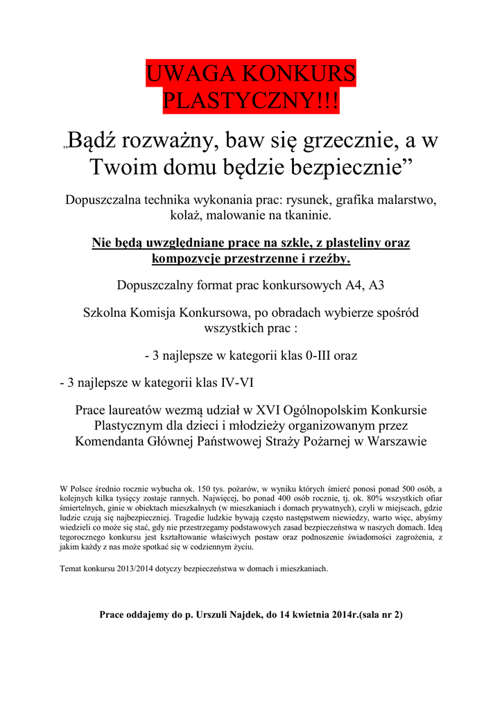 UWAGA KONKURS PLASTYCZNY!!! Bądź rozważny, baw się grzecznie, a w Twoim domu będzie bezpiecznie” „ Dopuszczalna technika wykonania prac: rysunek, grafika malarstwo, kolaż, malowanie na tkaninie. Nie będą uwzględniane prace na szkle, z plasteliny oraz kompozycje przestrzenne i rzeźby. Dopuszczalny format prac konkursowych A4, A3 Szkolna Komisja Konkursowa, po obradach wybierze spośród wszystkich prac : - 3 najlepsze w kategorii klas 0-III oraz - 3 najlepsze w kategorii klas IV-VI Prace laureatów wezmą udział w XVI Ogólnopolskim Konkursie Plastycznym dla dzieci i młodzieży organizowanym przez Komendanta Głównej Państwowej Straży Pożarnej w Warszawie W Polsce średnio rocznie wybucha ok. 150 tys. pożarów, w wyniku których śmierć ponosi ponad 500 osób, a kolejnych kilka tysięcy zostaje rannych. Najwięcej, bo ponad 400 osób rocznie, tj. ok. 80% wszystkich ofiar śmiertelnych, ginie w obiektach mieszkalnych (w mieszkaniach i domach prywatnych), czyli w miejscach, gdzie ludzie czują się najbezpieczniej. Tragedie ludzkie bywają często następstwem niewiedzy, warto więc, abyśmy wiedzieli co może się stać, gdy nie przestrzegamy podstawowych zasad bezpieczeństwa w naszych domach. Ideą tegorocznego konkursu jest kształtowanie właściwych postaw oraz podnoszenie świadomości zagrożenia, z jakim każdy z nas może spotkać się w codziennym życiu. Temat konkursu 2013/2014 dotyczy bezpieczeństwa w domach i mieszkaniach. Prace oddajemy do p. Urszuli Najdek, do 14 kwietnia 2014r.(sala nr 2)