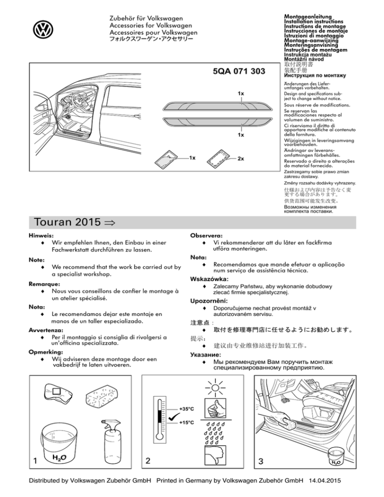 Montageanleitung Installation instructions Instructions de montage Instrucciones de montaje Istruzioni di montaggio Montage-aanwijzing Monteringsanvisning Instruções de montagem Zubehör für Volkswagen Accessories for Volkswagen Accessoires pour Volkswagen Instrukcja montażu Montážní návod 5QA 071 303 取付説明書 装配手册 Инструкция по монтажу Änderungen des Lieferumfanges vorbehalten. Design and specifications subject to change without notice. Sous réserve de modifications. Se reservan las modificaciones respecto al volumen de suministro. Ci riserviamo il diritto di apportare modifiche al contenuto della fornitura. Wijzigingen in leveringsomvang voorbehouden. Ändringar av leveransomfattningen förbehålles. Reservado o direito a alterações do material fornecido. 1x 1x 2x Zastrzegamy sobie prawo zmian zakresu dostawy. Změny rozsahu dodávky vyhrazeny. 仕様および内容は予告なく変 更する場合があります。 供货范围可能发生改变。 Возможны изменения комплекта поставки. Touran 2015 ⇒ Hinweis: ♦ Wir empfehlen Ihnen, den Einbau in einer Fachwerkstatt durchführen zu lassen. Note: ♦ We recommend that the work be carried out by a specialist workshop. Remarque: ♦ Nous vous conseillons de confier le montage à un atelier spécialisé. Nota: ♦ Le recomendamos dejar este montaje en manos de un taller especializado. Avvertenza: ♦ Per il montaggio si consiglia di rivolgersi a un'officina specializzata. Opmerking: ♦ Wij adviseren deze montage door een vakbedrijf te laten uitvoeren. Observera: ♦ Vi rekommenderar att du låter en fackfirma utföra monteringen. Nota: ♦ Recomendamos que mande efetuar a aplicação num serviço de assistência técnica. Wskazówka: ♦ Zalecamy Państwu, aby wykonanie dobudowy zlecać firmie specjalistycznej. Upozornění: ♦ Doporučujeme nechat provést montáž v autorizovaném servisu. 注意点: ♦ 取付を修理専門店に任せるようにお勧めします。 提示: ♦ 建议由专业维修站进行加装工作。 Указание: ♦ Мы рекомендуем Вам поручить монтаж специализированному предприятию. +35°C +15°C 1 2 3 Distributed by Volkswagen Zubehör GmbH Printed in Germany by Volkswagen Zubehör GmbH 14.04.2015 1 4 6 5 5 Min. 15-35°C 2 X X 1 10 mm X=X 7 8 9 10 11 12 13 14 15 Distributed by Volkswagen Zubehör GmbH Printed in Germany by Volkswagen Zubehör GmbH 14.04.2015