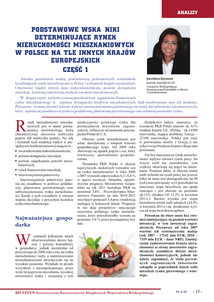 ANALIZY PODSTAWOWE WSKA NIKI DETERMINUJ¥CE RYNEK NIERUCHOMOŒCI MIESZKANIOWYCH W POLSCE NA TLE INNYCH KRAJÓW EUROPEJSKICH CZÊŒÆ 1 Jaros³awa Ejsymont Autorka przedstawia analizê porównawcz¹ podstawowych wskaŸników prawnik, poœrednik lic.128 kszta³tuj¹cych rynek nieruchomoœci w Polsce i wybranych krajach europejskich. Wiceprezes Wielkopolskiego Omówiono miêdzy innymi dane makroekonomiczne, poziom dostêpnoœci Stowarzyszenia Poœredników w Obrocie Nieruchomoœciami mieszkañ, iloœciow¹ i jakoœciow¹ wielkoœæ zasobów mieszkaniowych. W drugiej czêœci artyku³u zostan¹ przedstawione zagadnienia finansowania rynku mieszkaniowego w aspekcie dostêpnoœci kredytów mieszkaniowych, skali kredytowania oraz ich struktury. Poruszone zostan¹ równie¿ kwestie wp³ywu interwencjonizmu pañstwowego na rynek nieruchomoœci mieszkaniowych, który ujawnia siê zasadniczo w polityce podatkowej, planowania przestrzennego oraz subwencjonowania rynku. R ynek nieruchomoœci mieszkaniowych jest w stanie permanentnej nierównowagi, któr¹ charakteryzuje okresowa nadwy¿ka popytu lub nadwy¿ka poda¿y. Na si³ê i kierunek tych tendencji wp³yw w perspektywie krótkoterminowej maj¹ m.in.: ! uwarunkowania makroekonomiczne, ! poziom dostêpnoœci mieszkañ, ! poziom zaspokojenia potrzeb mieszkaniowych, ! rynek finansowania mieszkañ, ! interwencjonizm pañstwowy. Interwencjonizm pañstwowy ujawnia siê zasadniczo w polityce podatkowej, planowania przestrzennego oraz subwencjonowania rynku nieruchomoœci. Ka¿dy z tych czynników w ró¿nym stopniu decyduje o przysz³ym kszta³cie rynku mieszkaniowego. Najwa¿niejsza gospodarka W ostatnich kilkunastu latach obserwowaliœmy okresy lepszej i gorszej koniunktury w gospodarce, jednak niezale¿nie od powy¿szego do 2008 roku ceny na rynku nieruchomoœci ros³y, a zainteresowanie nieruchomoœciami utrzymywa³o siê na wysokim poziomie. Wynika³o to przede wszystkim z niezaspokojonego, przez wiele lat popytu na mieszkania, wysokiej rentownoœci rynku i zwi¹zanej z tym atrakcyjnoœci polskiego rynku dla potencjalnych inwestorów zagranicznych, zw³aszcza od momentu przyst¹pienia Polski do U.E. Obecnie rynek nieruchomoœci jest silnie skorelowany z tempem wzrostu gospodarczego kraju. Od 2008 roku obserwuje siê spadek popytu i cen, który towarzyszy spowolnieniu gospodarczemu. Dynamika PKB Polski w okresie najwy¿szych, skokowych wzrostów cen na rynku nieruchomoœci w roku 2006 i 2007 wynosi³a odpowiednio 6,2 i 6,8 % w ujêciu rocznym. Aktualna, optymistyczna prognoza Ministerstwa Gospodarki na rok 2011 kszta³tuje PKB na poziomie 3,8% . Przewidywania Ministerstwa Finansów na lata 2010-2015 oscyluj¹ w granicach 3,4 proc z tendencj¹ malej¹c¹ w kolejnych latach. Prognozy te nie daj¹ perspektyw znacz¹cego o¿ywienia polskiego rynku nieruchomoœci, który potrzebowa³by wzrostu na poziomie 5-6 % przez przynajmniej trzy lata. Dodatkowo nale¿y zauwa¿yæ, ¿e wysokoœæ PKB Polski stanowi ok. 61% œredniej krajów UE. (Polska - ok.14500 euro/osobê, maj¹ca problemy Grecja – 22100 euro/osobê). Polska jest wiêc w porównaniu choæby z Grecj¹ (i nie tylko) wci¹¿ biednym krajem i d³ugo nim pozostanie. Nie bez znaczenia na rynek nieruchomoœci wp³ywa równie¿ rynek pracy. Im wiêcej osób ma zatrudnienie, tym wiêkszy obserwuje siê popyt na mieszkania. Pomimo faktu, i¿ obecnie mniej osób wchodzi na rynek pracy ni¿ jeszcze kilka lat temu (ni¿ demograficzny lat 90 tych) oraz powojenny wy¿ przechodzi na emeryturê stopa bezrobocia nie spada znacz¹co i jest obecnie na poziomie ok.12% (œrednia UE 12,3% w kwietniu 2011r.). Bardzo wysoka jest stopa bezrobocia wœród osób m³odych (24,9% w kwietniu 2011r.) ok. dwukrotnie wy¿sza od stopy bezrobocia ogó³em. Powodem do obaw mo¿e byæ równie¿ zmniejszaj¹cy siê poziom wartoœci inwestycji, w tym inwestycji zagranicznych. Pocz¹wszy od roku 2007 wartoœæ ich systematycznie maleje (rok 2007 – 17242 mln EUR, 2010 – 7319 mln EUR – dane NBP). Zmniejszenie zainteresowania bran¿¹ nieruchomoœci ze strony inwestorów zagranicznych, zasadniczo dotyka nieruchomoœci komercyjnych, jednak nie nale¿y zapominaæ, ¿e wielu prywatnych zagranicznych inwestorów zakupi³o w poprzednich latach setki mieszkañ rynku pierwotnego i wtórnego. BIULETYN Stowarzyszenia Rzeczoznawców Maj¹tkowych Województwa Wielkopolskiego Nr 3/29 - 15 - ANALIZY C e ny m i e s z k a ñ z a wysokie Wykres 1 Stopa inwestycji w Polsce w % PKB P W szerszej perspektywie koniunktura gospodarcza odbija siê na nastrojach spo³eczeñstwa, które bêd¹c zadowolone z sytuacji gospodarczej chêtniej inwestuje we w³asne lokum. Z ostatnich badañ CBOS (kwiecieñ 2011 roku) wynika, ¿e tylko co pi¹ty ankietowany (21%) ocenia ogóln¹ sytuacjê w kraju Tabela 1 Wybrane dane ekonomiczne ród³o: The Economist 2011, MF - 16 - Wrzesieñ 2011 jako dobr¹, natomiast dwie trzecie jako z³¹ (63%). Na polsk¹ gospodarkê wp³yw wywiera kondycja krajów UE. Obecne zagro¿enie niewyp³acalnoœci¹ Grecji, Irlandii, Hiszpanii, Portugalii, W³och oraz problemy USA dodatkowo nie bêd¹ czynnikiem wspieraj¹cym polski rynek. oziom dostêpnoœci mieszkañ wyznacza siê wskaŸnikiem dostêpnoœci obliczanym jako P/I (ang. house price to income ratio) czyli iloraz ceny (typowo mediana ceny) za przeciêtnej wielkoœci mieszkania na danym rynku do rocznego przeciêtnego dochodu rozporz¹dzalnego gospodarstwa domowego. Przeciêtna wielkoœæ mieszkania charakterystyczna dla danego rynku – w USA jest to dom, w Europie mieszkanie zazwyczaj 3 pokojowe. Dochód gospodarstwa domowego to przeciêtny podwójny dochód rozporz¹dzalny gospodarstwa domowego w danym kraju, regionie, czy mieœcie. Wysokoœæ tego dochodu jest zró¿nicowana np. w 2009 roku w województwie mazowieckim by³a najwy¿sza i wynosi³a 1439 z³, w podkarpackim – 835 z³, natomiast przeciêtny miesiêczny dochód rozporz¹dzalny na osobê w gospodarstwach ogó³em kszt