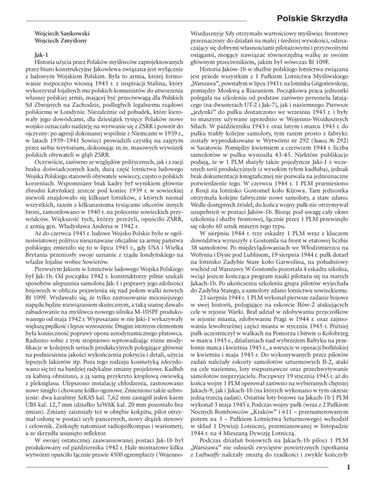 Polskie Skrzydła Wojciech Sankowski Wojciech Zmyślony Jak-1 Historia użycia przez Polaków myśliwców zaprojektowanych przez biuro konstrukcyjne Jakowlewa związana jest wyłącznie z ludowym Wojskiem Polskim. Była to armia, której formowanie rozpoczęto wiosną 1943 r. z inspiracji Stalina, który wykorzystał lojalnych mu polskich komunistów do utworzenia własnej polskiej armii, mającej być przeciwwagą dla Polskich Sił Zbrojnych na Zachodzie, podległych legalnemu rządowi polskiemu w Londynie. Niezależnie od pobudek, które kierowały jego dowódcami, dla dziesiątek tysięcy Polaków nowe wojsko oznaczało nadzieję na wyrwanie się z ZSRR i powrót do ojczyzny: po agresji dokonanej wspólnie z Niemcami w 1939 r., w latach 1939–1941 Sowieci prowadzili czystkę na zajętym przez siebie terytorium, dokonując m.in. masowych wywózek polskich obywateli w głąb ZSRR. Oczywiście, zarówno ze względów politycznych, jak i z racji braku doświadczonych kadr, dużą część lotnictwa ludowego Wojska Polskiego stanowili obywatele sowieccy, często o polskich korzeniach. Wspomniany brak kadry był wynikiem głównie zbrodni katyńskiej: jeszcze pod koniec 1939 r. w sowieckiej niewoli znajdowało się kilkuset lotników, z których niemal wszystkich, razem z kilkunastoma tysiącami oficerów innych broni, zamordowano w 1940 r. na polecenie sowieckich przywódców. Większość tych, którzy przeżyli, opuściło ZSRR, z armią gen. Władysława Andersa w 1942 r. Aż do czerwca 1945 r. ludowe Wojsko Polskie było w ogólnoświatowej polityce nieuznawane oficjalnie za armię państwa polskiego; zmieniło się to w lipcu 1945 r., gdy USA i Wielka Brytania przeniosły swoje uznanie z rządu londyńskiego na władze lojalne wobec Sowietów. Pierwszym Jakiem w lotnictwie ludowego Wojska Polskiego był Jak-1b. Od początku 1942 r. konstruktorzy pilnie szukali sposobów ulepszenia samolotu Jak-1 i poprawy jego zdolności bojowych w obliczu pojawienia się nad polem walki nowych Bf 109F. Wydawało się, że tylko zastosowanie mocniejszego napędu będzie rozwiązaniem skutecznym, a taką szansę dawało zabudowanie na myśliwcu nowego silnika M-105PF produkowanego od maja 1942 r. Wyposażane w nie Jaki-1 wykazywały większą prędkość i lepsze wznoszenie. Drugim istotnym elementem była konieczność poprawy oporu aerodynamicznego płatowca. Radzono sobie z tym stopniowo wprowadzając różne modyfikacje w kolejnych seriach produkcyjnych polegające głównie na podniesieniu jakości wykończenia pokrycia i detali, użycia lepszych lakierów itp. Poza tego rodzaju kosmetyką zdecydowano się też na bardziej radykalne zmiany projektowe. Kadłub za kabiną obniżono, a ją samą przykryto kroplową owiewką z pleksiglasu. Ulepszono instalację chłodzenia, zastosowano nowe śmigło i chowane kółko ogonowe. Zmieniono także uzbrojenie: dwa karabiny SzKAS kal. 7,62 mm zastąpił jeden kaem UBS kal. 12,7 mm (działko SzWAK kal. 20 mm pozostało bez zmian). Zmiany zaistniały też w obrębie kokpitu, pilot otrzymał osłonę w postaci szyb pancernych, nowy drążek sterowy i celownik. Zniknęły natomiast radiopółkompas i wariometr, a ze skrzydła usunięto reflektor. W swojej ostatecznej zaawansowanej postaci Jak-1b był produkowany od października 1942 r. Hale montażowe kilku wytwórni opuściło łącznie prawie 4500 egzemplarzy i Wojenno- Wozdusznyje Siły otrzymało wartościowy myśliwiec frontowy przeznaczony do działań na małej i średniej wysokości, odznaczający się dobrymi własnościami pilotażowymi i przyzwoitymi osiągami, mogący nawiązać równorzędną walkę ze swoim głównym przeciwnikiem, jakim był wówczas Bf 109F. Historia Jaków-1b w służbie polskiego lotnictwa związana jest przede wszystkim z 1 Pułkiem Lotnictwa Myśliwskiego „Warszawa”, powstałym w lipcu 1943 r. na lotnisku Grigoriewskoje, pomiędzy Moskwą a Riazaniem. Początkowa praca jednostki polegała na szkoleniu od podstaw zarówno personelu latającego (na dwusterach UT-2 i Jak-7), jak i naziemnego. Pierwsze „jedynki” do pułku dostarczono we wrześniu 1943 r. i były to maszyny używane uprzednio w Wojenno-Wozdusznych Siłach. W październiku 1943 r. oraz lutym i marcu 1945 r. do pułku trafiły kolejne samoloty, tym razem prosto z fabryki: zostały wyprodukowane w Wytwórni nr 292 (Завод № 292) w Saratowie. Pomiędzy kwietniem a czerwcem 1944 r. liczba samolotów w pułku wynosiła 43-45. Niektóre publikacje podają, że w 1 PLM służyły także pojedyncze Jaki-1 z wczesnych serii produkcyjnych (z wysokim tyłem kadłuba), jednak brak dokumentacji fotograficznej nie pozwala na jednoznaczne potwierdzenie tego. W czerwcu 1944 r. 1 PLM przeniesiono z Rosji na lotnisko Gostomel koło Kijowa. Tam jednostka otrzymała kolejne fabrycznie nowe samoloty, a stare zdano. Wedle dostępnych źródeł, do końca wojny pułk nie otrzymywał uzupełnień w postaci Jaków-1b. Biorąc pod uwagę cały okres szkolenia i służby frontowej, łącznie przez 1 PLM przewinęło się około 60 sztuk maszyn tego typu. W sierpniu 1944 r. trzy eskadry 1 PLM wraz z kluczem dowództwa wyruszyły z Gostomla na front w etatowej liczbie 38 samolotów. Po międzylądowaniach we Włodzimierzcu na Wołyniu i Dysie pod Lublinem, 19 sierpnia 1944 r. pułk dotarł na lotnisko Zadybie Stare koło Garwolina, na południowy wschód od Warszawy. W Gostomlu pozostała 4 eskadra szkolna, wciąż jeszcze kończąca program nauki pilotażu się na starych Jakach-1b. Po ukończeniu szkolenia grupa pilotów wyjechała do Zadybia Starego, a samoloty zdano lotnictwu sowieckiemu. 23 sierpnia 1944 r. 1 PLM wykonał pierwsze zadanie bojowe w swej historii, polegające na eskorcie Iłów-2 atakujących cele w rejonie Warki. Brał udział w zdobywaniu przyczółków w rejonie miasta, zdobywaniu Pragi w 1944 r. oraz zajmowaniu lewobrzeżnej części miasta w styczniu 1945 r. Później pułk uczestniczył w walkach na Po