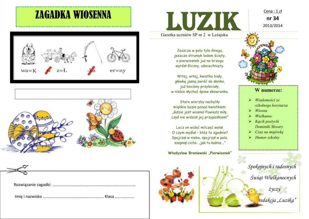 ZAGADKA WIOSENNA LUZIK Cena : 1 zł nr 34 2013/2014 Gazetka uczniów SP nr 2 w Leżajsku Jeszcze w polu tyle śniegu, jeszcze strumyk lodem ścięty, a pierwiosnek już na brzegu wyrósł śliczny, uśmiechnięty. Witaj, witaj, kwiatku biały, główkę jasną zwróć do słonka, już bociany przyleciały, w niebie słychać śpiew skowronka. Stare wierzby nachyliły miękkie bazie ponad kwiatkiem: „Gdzie jest wiosna! Powiedz miły, czyś nie widział jej przypadkiem!” Lecz on widać milczeć wolał. O czym myślał – któż to zgadnie? Spojrzał w niebo, spojrzał w pola, szepnął cicho: „jak tu ładnie...” W numerze: Wiadomości ze szkolnego korytarza Wiosna Wielkanoc Kącik poetycki Dominiki Skwary Czas na majówkę Humor szkolny Władysław Broniewski „Pierwiosnek” Spokojnych i radosnych Świąt Wielkanocnych Rozwiązanie zagadki: ………………………………………………………………………. Imię i nazwisko …………………………………………………… Klasa ………………. życzy redakcja „Luzika” Sesja nauczycielska w Imoli (Włochy) W dniach 24-28 lutego 2014 roku dwoje nauczycieli leżajskiej „dwójki” – p. Anna Szczawińska, p. Bogusław Wiącek – uczestniczyło we Włoszech w piątej sesji pedagogicznej międzynarodowego projektu edukacyjnego „Zdrowe dzieci – zdrowa szkoła” (”Healthy kids – healthy school”), realizowanego w ramach akcji Comeniusa „Wielostronne Projekty Szkół”. Gospodarzem kilkudniowej konferencji był zespół placówek oświatowych Istituto Compresivo no. 3, mający swe siedziby w trzech sąsiadujących ze sobą miejscowościach: Imoli, Mordano, Bubano. Podczas warsztatowych spotkań reprezentanci partnerskich szkół z Hiszpanii, Francji, Grecji, Niemiec, Portugalii, Turcji, Włoch i Polski dokonali szczegółowego podsumowania dotychczasowych działań projektowych. Opracowali ponadto plan anglojęzycznego poradnika w wersji książkowej o tematyce profilaktycznej – głównego produktu końcowego projektu. Uczestnicy sesji, poza angażowaniem się w czynności bezpośrednio związane z wdrażaniem założeń projektowych, mieli sposobność zapoznania się z cechami włoskiego systemu edukacyjnego, składając wizyty w różnych typach szkół. Pogłębili też swą znajomość historii, geografii i dziedzictwa kulturowego centralnej części Włoch, zwiedzając liczne zabytki architektoniczne, muzea i centra kultury w Imoli, Bolonii i Florencji. KONKURS !!! W tym numerze wspaniały konkurs z nagrodami. Zasady udziału: kup 34 numer „Luzika”, wypełnij kupon, znajdujący się na ostatniej stronie naszej gazetki, wpisując nazwisko i imię, klasę oraz rozwiązanie zagadki. wypełniony kupon wrzuć do puszki, znajdującej się w naszej bibliotece szkolnej najpóźniej do 14 kwietnia. Losowanie nagród odbędzie się 15 kwietnia. Powodzenia . Redakcja „Luzika”. Nagrody w ostatnim konkursie wylosowali: Janusz Paulina kl. 2b, Szmuc Maciej kl. 2b, Karaś Adam kl. 3c, Borkowska Anna kl. 4 b, Jaworski Krystian kl. 4b, Rudzińska Agata kl. 4b. Serdecznie gratulujemy!! Ciocia mówi do Jasia: - Ale Ty jesteś do mnie podobny... - Mamo... Ciocia mnie straszy! U paostwa Kowalskich dzwoni telefon. Odbiera Jasio: -Halo? -Dzieo dobry. Czy są rodzice? -Nie, poszli do kina. -A jest ktoś inny oprócz ciebie? - Tak, moja siostra. -A czy możesz ją zawoład do telefonu? -Tak. Niech pan poczeka. Po kilku minutach Jaś przykłada słuchawkę do ucha: -Przepraszam pana, ale nie mogę wyciągnąd siostry z wózka! Jasiu po kilkuletnim pobycie w USA wraca do Zakopanego. Ojciec mówi do Jasia: - Jasiu, wynieś obornik. Jasiu pyta: - What? Ojciec: - Łot krów i świo. - Tato, który pociąg ma największe opóźnienie? - pyta Jaś. - Nie mam pojęcia. - Ten, który w zeszłym roku obiecałeś mi na gwiazdkę. p. Bogusław Wiącek Wiadomości ze szkolnego korytarza Uczniowie naszej szkoły uczestniczyli w Wojewódzkich Konkursach Przedmiotowych organizowanych przez Kuratora Oświaty w Rzeszowie. Oto wyniki: - język polski – laureat Michał Sroka kl. VI a – opiekun p. Marzena Orzelska-Witkowska - historia – laureat Michał Sroka kl. VI a – opiekun p. Krystyna Pliszka 01.04.2014 odbył się Sprawdzian szóstoklasisty. Trzymamy kciuki! 21.03.2014 odbył się „Kangur” – Międzynarodowy Konkurs Matematyczny. Czekamy na wyniki! Konstytucja 3 Maja najstarsza ustawa zasadnicza w Europie i druga na świecie Majowe święto dla wszystkich POLAKÓW JEST DNIEM SZCZEGÓLNYM. Dzień 3 maja ustanowiono świętem narodowym w dowód pamięci o przodkach, którzy pragnęli ocalić kraj przed upadkiem. Posłowie zebrani na Sejmie Czteroletnim w Warszawie uchwalili 3 maja 1791 roku konstytucję. 19.03.2014 r. w Międzyszkolnym Konkursie Recytatorskim ph. „Do Czarnolasu nie tak daleko”- nagrodę otrzymała Emilia Rączka z kl. VI a – opiekun p.Marzena OrzelskaWitkowska. 13.03.2014 miał miejsce Dzień otwarty Szkoły Podstawowej nr 2, na który zaproszeni zostali rodzice wraz z sześcioletnimi i siedmioletnimi dziedmi. Przybyli goście mieli możliwośd zwiedzenia szkoły, sal lekcyjnych, komputerowych, zaplecza sportowego, szatni oraz szkolnego muzeum. Rodzice mogli porozmawiad z Dyrekcją i nauczycielami, a dzieci uczestniczyły w różnego rodzaju grach i zabawach oraz zapoznały się z fantastyczną atmosferą panującą w naszych murach. Konstytucja miała ulepszyć ustrój i wzmocnić Rzeczpospolitą. Wprowadzała w miejsce elekcji (wyboru) króla tron dziedziczny. Odbierała uprawnienia polityczne szlachcie, która nie posiadała majątku. Więcej praw natomiast zyskali mieszczanie, którzy mogli odtąd starać się o wysokie stanowiska w wojsku i Kościele. Najwyższą władzę sprawował sejm, na którym szlacheccy posłowie musieli podejmować decyzje większością głosów. Jeden poseł nie mógł zerwać obrad okrzykiem "liberum veto". Utworzono rząd - Straż Praw z króle