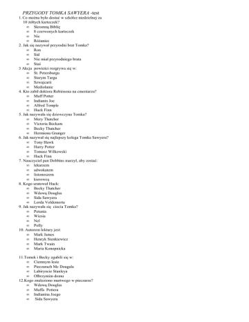 PRZYGODY TOMKA SAWYERA -test 1. Co można było dostać w szkółce niedzielnej za 10 żółtych karteczek? • Skromną Biblię • 8 czerwonych karteczek • Nic • Różaniec 2. Jak się nazywał przyrodni brat Tomka? • Ron • Sid • Nie miał przyrodniego brata • Staś 3 Akcja powieści rozgrywa się w: • St. Petersburgu • Starym Targu • Szwajcarii • Mediolanie 4. Kto zabił doktora Robinsona na cmentarzu? • Muff Potter • Indianin Joe • Alfred Temple • Huck Finn 5. Jak nazywała się dziewczyna Tomka? • Mery Thatcher • Victoria Beckam • Becky Thatcher • Hermiona Granger 6. Jak nazywał się najlepszy kolega Tomka Sawyera? • Tony Hawk • Harry Potter • Tomasz Wilkowski • Huck Finn 7. Nauczyciel pan Dobbins marzył, aby zostać: • lekarzem • adwokatem • listonoszem • kierowcą 8. Kogo uratował Huck: • Becky Thatcher • Wdową Douglas • Sida Sawyera • Lorda Voldemorta 9. Jak nazywała się ciocia Tomka? • Petunia • Wiesia • Nel • Polly 10. Autorem lektury jest: • Mark James • Henryk Sienkiewicz • Mark Twain • Maria Konopnicka 11.Tomek i Becky zgubili się w: • Ciemnym lesie • Pieczarach Mc Dougala • Labiryncie Stanleya • Olbrzymim domu 12.Kogo znaleziono martwego w pieczarze? • Wdową Douglas • Muffa Pottera • Indianina Joego • Sida Sawyera