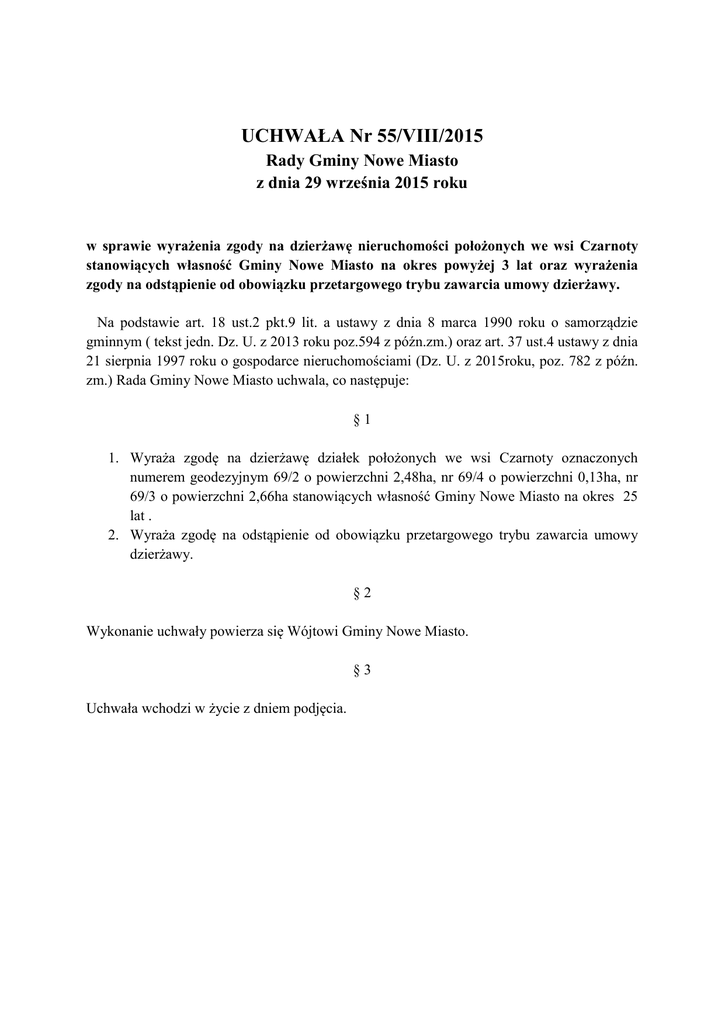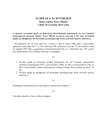 UCHWAŁA Nr 55/VIII/2015 Rady Gminy Nowe Miasto z dnia 29 września 2015 roku w sprawie wyrażenia zgody na dzierżawę nieruchomości położonych we wsi Czarnoty stanowiących własność Gminy Nowe Miasto na okres powyżej 3 lat oraz wyrażenia zgody na odstąpienie od obowiązku przetargowego trybu zawarcia umowy dzierżawy. Na podstawie art. 18 ust.2 pkt.9 lit. a ustawy z dnia 8 marca 1990 roku o samorządzie gminnym ( tekst jedn. Dz. U. z 2013 roku poz.594 z późn.zm.) oraz art. 37 ust.4 ustawy z dnia 21 sierpnia 1997 roku o gospodarce nieruchomościami (Dz. U. z 2015roku, poz. 782 z późn. zm.) Rada Gminy Nowe Miasto uchwala, co następuje: §1 1. Wyraża zgodę na dzierżawę działek położonych we wsi Czarnoty oznaczonych numerem geodezyjnym 69/2 o powierzchni 2,48ha, nr 69/4 o powierzchni 0,13ha, nr 69/3 o powierzchni 2,66ha stanowiących własność Gminy Nowe Miasto na okres 25 lat . 2. Wyraża zgodę na odstąpienie od obowiązku przetargowego trybu zawarcia umowy dzierżawy. §2 Wykonanie uchwały powierza się Wójtowi Gminy Nowe Miasto. §3 Uchwała wchodzi w życie z dniem podjęcia. Uzasadnienie do Uchwały Nr 55/VIII/2015/2015 Rady Gminy Nowe Miasto z dnia 29 września 2015 roku w sprawie wyrażenia zgody na dzierżawę nieruchomości położonych we wsi Czarnoty stanowiących własność Gminy Nowe Miasto na okres powyżej 3 lat oraz wyrażenia zgody na odstąpienie od obowiązku przetargowego trybu zawarcia umowy dzierżawy. Działki numer 69/2,69/3,69/4 położone we wsi Czarnoty stanowią własność gminy Nowe Miasto na mocy decyzji Wojewody Ciechanowskiego: -numer Gnn.8229-37/29/153/98 z dnia 20.06.1998r.- dotyczy działki numer 69/2,KW16838/9, - numer.nn.8229-37/29/154/98 z dnia 20.06.1998r.- dotyczy działki numer 69/4,- KW16838/9 ,oraz Aktu Notarialnego Nr 937/2001- dotyczy działki nr 69/3-KW nr 32203/7. Płońskie Stowarzyszenie Kolekcjonerów Broni Palnej i Strzelectwa Sportowego z siedzibą 05-100 Nowy Dwór Mazowiecki, ul. Dębowa 40/13 wystąpiło do Wójta Gminy o zawarcie umowy dzierżawy na okres 25 lat poczynając od 2015 roku. Wnioskodawca na w/w nieruchomościach zamierza uruchomić strzelnicę w celu między innymi popularyzacji strzelectwa sportowego i rekreacyjnego, kolekcjonowania broni palnej, prowadzenia szkoleń z zakresu obsługi broni palnej i.t. p. Art. 37 ust.4 ustawy z dnia 21 sierpnia 1997 roku o gospodarce nieruchomości (Dz. U. z 2015 roku poz.782 z późn. zm.) upoważnia odpowiednio Radę Gminy do wyrażenia zgody na odstąpienie od obowiązku przetargowego trybu zawarcia umów najmu ,użytkowania lub dzierżawy. Na podstawie wniosku o zawarcie umowy dzierżawy , proponuje się wyrażenie zgody na zawarcie umowy dzierżawy na czas wskazany w uchwale w trybie bezprzetargowym.