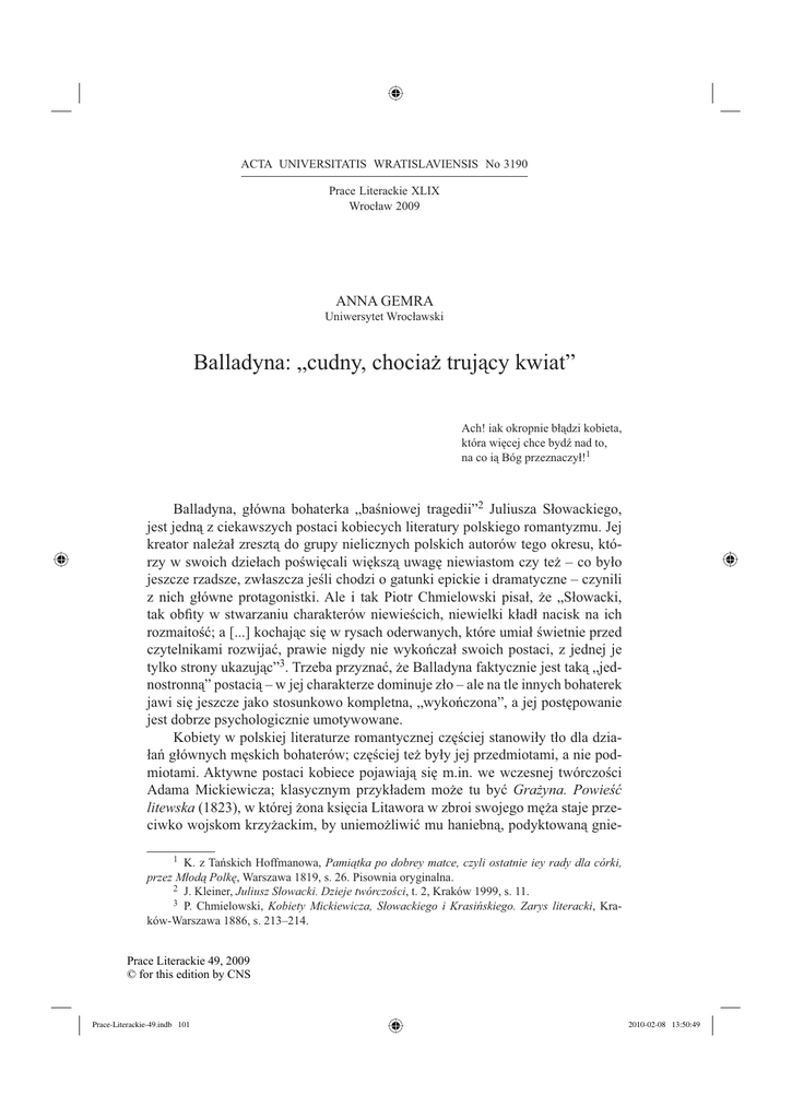 ACTA UNIVERSITATIS WRATISLAVIENSIS No 3190 Prace Literackie XLIX Wrocław 2009 ANNA GEMRA Uniwersytet Wrocławski Balladyna: „cudny, chociaż trujący kwiat” Ach! iak okropnie błądzi kobieta, która więcej chce bydź nad to, na co ią Bóg przeznaczył!1 Balladyna, główna bohaterka „baśniowej tragedii”2 Juliusza Słowackiego, jest jedną z ciekawszych postaci kobiecych literatury polskiego romantyzmu. Jej kreator należał zresztą do grupy nielicznych polskich autorów tego okresu, którzy w swoich dziełach poświęcali większą uwagę niewiastom czy też – co było jeszcze rzadsze, zwłaszcza jeśli chodzi o gatunki epickie i dramatyczne – czynili z nich główne protagonistki. Ale i tak Piotr Chmielowski pisał, że „Słowacki, tak obfity w stwarzaniu charakterów niewieścich, niewielki kładł nacisk na ich rozmaitość; a [...] kochając się w rysach oderwanych, które umiał świetnie przed czytelnikami rozwijać, prawie nigdy nie wykończał swoich postaci, z jednej je tylko strony ukazując”3. Trzeba przyznać, że Balladyna faktycznie jest taką „jednostronną” postacią – w jej charakterze dominuje zło – ale na tle innych bohaterek jawi się jeszcze jako stosunkowo kompletna, „wykończona”, a jej postępowanie jest dobrze psychologicznie umotywowane. Kobiety w polskiej literaturze romantycznej częściej stanowiły tło dla działań głównych męskich bohaterów; częściej też były jej przedmiotami, a nie podmiotami. Aktywne postaci kobiece pojawiają się m.in. we wczesnej twórczości Adama Mickiewicza; klasycznym przykładem może tu być Grażyna. Powieść litewska (1823), w której żona księcia Litawora w zbroi swojego męża staje przeciwko wojskom krzyżackim, by uniemożliwić mu haniebną, podyktowaną gnie1 K. z Tańskich Hoffmanowa, Pamiątka po dobrey matce, czyli ostatnie iey rady dla córki, przez Młodą Polkę, Warszawa 1819, s. 26. Pisownia oryginalna. 2 J. Kleiner, Juliusz Słowacki. Dzieje twórczości, t. 2, Kraków 1999, s. 11. 3 P. Chmielowski, Kobiety Mickiewicza, Słowackiego i Krasińskiego. Zarys literacki, Kraków-Warszawa 1886, s. 213–214. Prace Literackie 49, 2009 © for this edition by CNS Prace-Literackie-49.indb 101 2010-02-08 13:50:49 102 ANNA GEMRA wem narodową zdradę. Samej Grażyny jest jednak w tym tekście niewiele, a jej aktywność „usprawiedliwia” męskie przebranie, podobnie zresztą jak przebranie Emilii Plater w wierszu Śmierć pułkownika (1836). Zbroja Grażyny i „żołnierska odzież” Emilii skutecznie pozwalają bohaterkom na ukrycie swojej płci i jednocześnie legitymizują ich poczynania, jako niewiastom bowiem nie wolno im było parać się rycerskim zajęciem. W Dziadach – we wszystkich ich częściach – postaci kobiecych jest niewiele; to męski świat, w którym niewiasty niewiele mają do powiedzenia. Mogą cierpieć, jak matka Rollisona w Dziadach części III, lub być przyczyną cierpienia, jak ukochana Gustawa z Dziadów części IV; mogą być „damami modnymi” czytającymi romanse (Dziady część I. Widowisko), bawiącymi się na balach wydawanych przez zaborców (Dziadów część III), albo pannami z polskich wiejskich dworków, którym niewinność i dziecięctwo duszy pozwalają na nawiązanie kontaktu ze sferą nadprzyrodzoną, jak Ewie z Dziadów części III. Ich rola w akcji jest silnie ograniczona; funkcjonują nie tyle jako samodzielne postaci, ile jako swego rodzaju symbole, tak jak matka Rollisona, polska Matka Bolesna. Niewielką rolę odgrywają także kobiety w dziełach Zygmunta hrabiego Krasińskiego; te bardziej aktywne są przede wszystkim zbrodniarkami (jak rewolucjonistki w Nie-Boskiej komedii); inne, zdobywając władzę dla swych mężczyzn, usuwają się w cień i rządzą zza tronu, jak Mammea z Irydiona; jeszcze inne, jak Kornelia z tego samego dramatu, stają się aniołami stróżami błądzących mężczyzn, reprezentantkami „wiecznej kobiecości”, orędującej, usprawiedliwiającej, ocalającej. A przecież Kornelia jest dla Irydiona tylko środkiem do celu, pionkiem w grze o zemstę: bez większych wahań wykorzystuje ją i poświęca w imię „sprawy”, podobnie jak zrobił to z własną siostrą, Elsinoe. Nawet w Agaj-Hanie. Powieści historycznej (1833) opowiadającej o Marynie Mniszchównie narrator Krasińskiego większą uwagą obdarza bohaterów męskich niż carową. Wojewodzianka sandomierska i żona Dymitra I Samozwańca ma co prawda „męskie serce”4, ale w rysunku postaci na pierwszy plan wysuwają się jej niewieście powaby; narrator niejednokrotnie podkreśla, że carowa wykorzystuje swą płeć i urodę do zjednania sobie mężczyzn. Maryna jest zatem nie tyle władczynią, ile piękną kobietą, obiektem męskiego pożądania i rywalizacji, podobnie zresztą jak Orlika z Zamku Kaniowskiego (1828) Seweryna Goszczyńskiego, manipulowana tak przez rządcę, jak i przez Nebabę. Także w utworach innych pisarzy, jak np. Józef Ignacy Kraszewski czy Aleksander hrabia Fredro, kobiety rzadko ukazywane są jako osoby posiadające faktyczną władzę nad swym życiem i podejmujące istotne decyzje5, częściej zaś jako takie, które żyjąc w otoczeniu mało błyskotliwych mężczyzn, z definicji podlegają jednak ich władzy i muszą używać intryg i całego swego sprytu, by mieć choć odrobinę swobody i samodzielności. Takie podejście pisarzy do postaci kobiecych nie było skutkiem mizoginizmu, 4 Z. Krasiński, Agaj-Han. Powieść historyczna, Białystok 1998, s. 20. W tych rozważaniach pomijam Cypriana Kamila Norwida ze względu na to, że jego twórczość znacznie odbiega od „klasycznego” romantyzmu. 5 Prace Literackie 49, 2009 © for this edition by CNS Prace-Literackie-49.indb 102 2010-02-08 13:50:49 Balladyna: „cudny, chociaż trujący kwiat” 103 ale wynikało z obyczajów epoki, w której niewiasty, uważane za istoty z natury słabsze, mniej zdolne do życia w świecie „zewnę