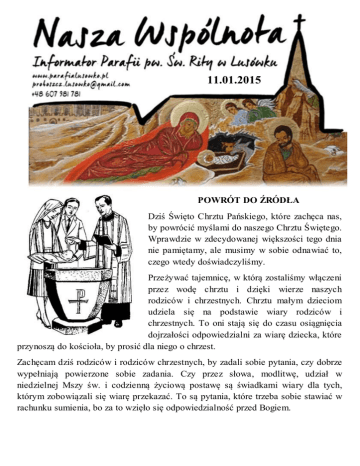 11.01.2015 POWRÓT DO ŹRÓDŁA Dziś Święto Chrztu Pańskiego, które zachęca nas, by powrócić myślami do naszego Chrztu Świętego. Wprawdzie w zdecydowanej większości tego dnia nie pamiętamy, ale musimy w sobie odnawiać to, czego wtedy doświadczyliśmy. Przeżywać tajemnicę, w którą zostaliśmy włączeni przez wodę chrztu i dzięki wierze naszych rodziców i chrzestnych. Chrztu małym dzieciom udziela się na podstawie wiary rodziców i chrzestnych. To oni stają się do czasu osiągnięcia dojrzałości odpowiedzialni za wiarę dziecka, które przynoszą do kościoła, by prosić dla niego o chrzest. Zachęcam dziś rodziców i rodziców chrzestnych, by zadali sobie pytania, czy dobrze wypełniają powierzone sobie zadania. Czy przez słowa, modlitwę, udział w niedzielnej Mszy św. i codzienną życiową postawę są świadkami wiary dla tych, którym zobowiązali się wiarę przekazać. To są pytania, które trzeba sobie stawiać w rachunku sumienia, bo za to wzięło się odpowiedzialność przed Bogiem. OGŁOSZENIA DUSZPASTERSKIE 1. Msze Święte w najbliższych dniach: 12 i 13 stycznia (poniedziałek i wtorek) o 700 ; Pozostałe dni tygodnia o 815 2. Biuro parafialne czynne do końca stycznia po każdej Eucharystii. 3. Dziś niedziela gospodarcza. Dziękuję za złożone ofiary. 4. Za kadzidło uzbieraliśmy 602,23 złotych 5. Woda święcona znajduje się na stoliku przy konfesjonale (proszę przynieść ze sobą pojemnik). Można też sprzed ołtarza zabierać poświęcona kredę i kadzidło do oznaczenia naszych drzwi. 6. Zapraszam do czytania prasy katolickiej – Przewodnika Katolickiego (cena 4,5 zł) i Małego Przewodnika dla dzieci. 7. Plan kolędy na najbliższe dni poniżej, a cały na stronie parafialnej www.parafialusowko.pl i w gablocie. Bardzo się cieszę, że mogę gościć w Waszych domach z błogosławieństwem Bożym. Plan Odwiedzin Duszpasterskich – Kolędy 11.01.2015; Niedz; 1500; Sierosław – ul. Marmurowa, Okrężna i Niedźwiedzia 12.01.2015; Pon; 16 30; Pokrzywnica – ul. Dworska, Myśliwska. 13.01.2015; Wt; 1630; ul. Imbirowa, Kminkowa, Cienista 14.01.2015; Śr; 1000;; Sierosław – Pałac, ul. Morwowa i ul. Kręta do Kasztanowej 16.01.2015; Czw; 1630;; ul. Wiązowa od Grabowej od nr 76 do 30 15.01.2015; Pt; 1630; ul. Leszczynowa od Jankowickiej, ul. Jastrzębia, ul. Perkozowa, ul. Łabędziowa 16.01.2015; Sob; 10 00; ul. Morska od Jankowickiej 17.01.2015; Niedz; 1500; Rozalin Biały – ul. Nagietka i Tulipana 18.01.2015; Pon; 16 30; Rozalin Biały – ul. Niezapominajki i Rozalin Żółty – ul. Storczyka 4 – 6.02.2015 odwiedziny duszpasterskie przełożone po wcześniejszym uzgodnieniu Gdy intencji na jednej Eucharystii jest kilka, to zostaną odprawione w tygodniu tyle razy ile jest na tej Mszy Świętej intencji. Intencje 10 – 25.01.2015 SOBOTA, 10.01.2015, 1630 1) Kazimierza Jankowiaka od brata Janusza z rodziną 2) śp. Jakuba Śmieszalskiego od kolegów i koleżanek Kasi z pracy NIEDZIELA, 11.01.2015; 830 śp. Edwarda Andrzejewskiego (12 r.śm) rodziców Reginę Stanisława Andrzejewskich i Sławomira (30r.śm) Leśniewskiego od synów 1000 1) śp. Jakuba Śmieszalskiego i Adasia Ignasiaka od Przybylskich i Ziemniewskich 2) śp. Marianny Lemańskiej ( 9 r.śm. im) Marianny i Feliksa i zmarłych: Janusza Lemańskiego, Feliksa i Władysławy Lemańskich, Katarzyny i Józefa Kokot, Ireny, Leona i Marka Nowaków, Haliny Matuszewskiej, Benedykta Brygiera, Franciszki Franciszka Seges, Anny Życkiej i za zmarłych z rodziny Łukasiewiczów i z rodz. Świątków 1130 w intencji Juliusza z okazji urodzin, w podziękowaniu za otrzymane łaski i z prośbą o Boże błogosławieństwo dla niego i całej rodziny PONIEDZIAŁEK, 12.01.2015; 700 WTOREK 13.01.2015; 700 ŚRODA 14.01.2015; 815 CZWARTEK, 15.01.2015 815 śp. Franciszka (23 r.śm), Marię Błaszczaków, Jadwigę, Stanisława Jacka, Stanisława Kleszczów, Czesława Łysiaka Anielę Mączyńską PIĄTEK, 16.01.2015, 815 SOBOTA, 17.01.2015, 1630 śp. Jakuba Śmieszalskiego od kolegów i koleżanek Kasi z pracy NIEDZIELA, 18.01.2015; 830 1) Sławomira Leśniewskiego (30 rśm) Witolda, Jerzego Leśniewskich i Janinę Zawisza 2) Henryka Szymanowskiego (4 r.śm i im) od żony z rodziną i Roberta Łuczaka (8 r.śm) od mamy i siostry z rodzina i Krystynę Wiciak 1000 śp. Jakuba Śmieszalskiego od Węców z Poznania 1130 w intencji 6 lat Urszuli i Wojciecha PONIEDZIAŁEK, 19.01.2015; 700 WTOREK 20.01.2015; 700 ŚRODA 21.01.2015; 815 CZWARTEK, 22.01.2015 815 PIĄTEK, 23.01.2015, 815 SOBOTA, 24.01.2015, 1630 śp. Agnieszkę, Stanisławę, Jana, Mariana, Mieczysława, Stefana Smieszchalskich, Annę, Antoniego, Czesława Ignacego Perdon, Ireneusza Rura, Edwarda Jabłońskiego, Jakuba Śmieszalskiego, Adasia Ignasiaka i zm z rodz. Michalskich i Perdon NIEDZIELA, 25.01.2015; 830 1000 1) z okazji dnia Babci i dziadka śp. Czesławy, Władysławy Kwiatkowskich od wnuczki Marleny z rodziną i wnuka Roberta z żoną. 2) z okazji 95 urodzin Kazimiery Kaczmarek 1130 1) w intencji roczku Hani o bł. Boże dla niej i całej rodziny 2) śp. Jakuba Śmieszalskiego od sąsiadów Budziaków 3) śp. Jadwigę Dolańską (1 r. śm) od córki Wszystkim solenizantom i jubilatom wszystkiego, co piękne i dobre oraz łask potrzebnych do życia i zbawienia Chrzest święty jest fundamentem całego życia chrześcijańskiego, bramą życia w Duchu i bramą otwierającą dostęp do innych sakramentów. Przez chrzest zostajemy wyzwoleni od grzechu i odrodzeni jako synowie Boży, stajemy się członkami Chrystusa oraz zostajemy wszczepieni w Kościół i stajemy się uczestnikami jego posłania. Chrzest jest sakramentem odrodzenia przez wodę i w słowie. (KKK 1213). Chrzest św. jest sakramentem, w którym przez polanie wodą i wymówienie słów sakramentalnych człowiek otrzymuje odpuszczenie grzechu pierworodnego i wszystkich grzechów przed chrztem popełnionych oraz staje się dzieckiem Bożym i otrzy