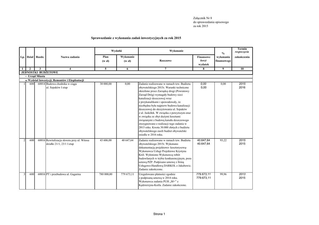 Załącznik Nr 8 do sprawozdania opisowego za rok 2015 Sprawozdanie z wykonania zadań inwestycyjnych za rok 2015 Wydatki Lp. Dział Rozdz. Nazwa zadania 1 2 3 4 JEDNOSTKI BUDŻETOWE – Urząd Miasta • Wydział Inwestycji, Remontów i Eksploatacji 1 600 60014 Budowa chodnika w ciągu ul. Szpaków I etap Wykonanie Termin rozpoczęcia % wykonania finansowego zakończenia Plan (w zł) Wykonanie (w zł) Rzeczowe Finansowe koszt wydatek 5 6 7 8 9 10 30 000,00 0,00 Zadanie realizowane w ramach tzw. Budżetu obywatelskiego 2015r. Warunki techniczne określone przez Zarządcę drogi (Powiatowy Zarząd Dróg) wymagały budowy sieci kanalizacji deszczowej wraz z przykanalikami i spowodowały, że niezbędna była najpierw budowa kanalizacji deszczowej do skrzyżowania ul. Szpaków z ul. Jaskółek. W związku z powyższym oraz w związku ze zbyt dużymi kosztami związanymi z budową kanału deszczowego zrezygnowano z realizacji tego zadania w 2015 roku. Kwota 30.000 złotych z budżetu obywatelskiego zasili budżet obywatelski osiedla w 2016 roku. 0,00 0,00 0,00 2015 2016 40.647,64 40.647,64 93,22 2015 2015 779.673,11 779.673,11 99,96 2013 2015 2 600 60016 Rewitalizacja skweru przy ul. Witosa działki 21/1, 23/1 I etap 43 606,00 40 647,64 Zadanie realizowane w ramach tzw. Budżetu obywatelskiego 2015r. Wykonano dokumentację projektowo- kosztorysowąWykonawca Usługi Projektowe Krystyna Król. Wyłoniono Wykonawcę robót budowlanych w trybie konkurencyjnym, poza ustawą PZP. Podpisano umowę z firmą Usługowo-Handlową DARKOL z Jakubowic. Zadanie zakończone. 3 600 60016 PT i przebudowa ul. Gagarina 780 000,00 779 673,11 Uregulowano płatności zgodnie z podpisaną umową w 2014 roku. Wykonawca zadania PUH „M+” z Kędzierzyna-Koźla. Zadanie zakończone. Strona 1 1 2 3 4 JEDNOSTKI BUDŻETOWE 4 600 60016 PT i przebudowa ciągu pieszo-jezdnego przy ul. 1 Maja od nr 12-18 5 363 500,00 6 363 440,85 7 Uregulowano płatności zgodnie z podpisaną umową w 2014 roku. Wykonawca zadania firma Zakład Usług Handlowych „AZALIA” z Lisięcic. Zadanie zakończone. W wyniku postępowania przetargowego podpisano umowę na prace projektowe z firmą Usługi Projektowe Alina Banach z Nysy. W posiadaniu Wydziału dokumentacja geotechniczna i zatwierdzona koncepcja programowo-przestrzenna. Trwa procedura wydania decyzji o środowiskowych uwarunkowaniach. Dokumentacja projektowo-techniczna opracowana przez firmę DMK Inżynieria z Rybnika odebrana, w posiadaniu Wydziału. Uzyskano decyzję ZRID - decyzja ostateczna. 8 363.440,85 363.440,85 9 99,98 10 2014 2015 22.845,00 22.845,00 45,69 2015 2016 70.362,80 70.362,80 97,05 2013 2019 Uregulowano płatności zgodnie z podpisaną umową w 2014 roku. Wykonawca zadania firmę FHU Zygfryd DAPA z Ostrożnicy. Zadanie zakończone. 99.836,16 99.836,16 99,84 2013 2015 5 600 60016 PT rozbudowy ul. Powstańca Filipa Pieli 50 000,00 22 845,00 6 600 60016 PT i przebudowa kompleksu ulic: Plebiscytowej, Lompy, Słonecznej, Krótkiej, Wąskiej i Pustej 72 500,00 70 362,80 7 600 60016 PT i budowa chodnika od ul. Jagodowej do pływalni 100 000,00 99 836,16 8 600 60016 Budowa chodnika na skwerze pomiędzy ul. Waryńskiego a Witosa 10 000,00 0,00 Postępowanie poza ustawą zostało unieważnione, gdyż najkorzystniejsza oferta przewyższała środki zaplanowane w budżecie na realizację zadania. 0,00 0,00 0,00 2015 2016 9 600 60016 PT i przebudowa ul. Norwida 162 000,00 148 091,22 Dokumentacja projektowo-kosztorysowa odebrana, w posiadaniu Wydziału. Uzyskano pozwolenie na budowę. Złożono wniosek do Wydziału Zamówień Publicznych o wszczęcie postępowania. Wydział Zamówień Publicznych ogłosił przetarg nieograniczony. Przetarg rozstrzygnięto, wyłoniono wykonawcę firmę PRDiM z Kędzierzyna-Koźla. Podpisano umowę na realizacje zadania. Zadanie zakończone. 148.091,22 148.091,22 91,41 2014 2016 10 600 60016 Skomunikowanie terenu inwestycyjnego „Koźle Port” poprzez budowę drogi wraz z niezbędną infrastrukturą 90 000,00 43,05 Ustalono przebieg nowej drogi wystąpiono o warunki techniczne budowy drogi, kanalizacji i wody. Uzyskano wypis i wyrys z miejscowego planu zagospodarowania miasta. 43,05 43,05 0,05 2015 2017 11 600 60016 PT i wykonanie przebudowy ul. Wincentego Witosa 10 000,00 143,91 W trybie zapytania ofertowego wybrano wykonawcę prac projektowych tj. firmę Usługi Projektowe Alina Banach z Nysy. Termin wykonania koncepcji luty 2016 rok, zaś zakończenie prac projektowych- czerwiec 2016 rok. 143,91 143,91 1,44 2015 2017 Strona 2 1 2 3 4 JEDNOSTKI BUDŻETOWE 12 600 60016 Budowa ulic na os. Powstańców Śląskich 5 510 000,00 6 506 134,99 13 600 60016 PT i przebudowa ul. Tuwima 40 000,00 36 900,00 14 600 60016 Przebudowa ul. Adama Benisza w Kędzierzynie-Koźlu 6 500,00 0,00 15 600 60016 PT i przebudowa ul. Spokojnej na os. Kuźniczka 44 000,00 43 665,00 16 600 60016 Przebudowa i rozbudowa ul. Kozielskiej 6 152 920,00 6 129 201,79 7 Uregulowano płatności zgodnie z podpisaną umową w 2014 roku . Wykonawca zadania K+D Budownictwo z Kędzierzyna-Koźla. Zadanie zakończone. Dokumentacja projektowo-kosztorysowa opracowana przez firmę Usługi Projektowe i Nadzór Budowlany Ryszard Warmiński z Gierałtowic odebrana, w posiadaniu Wydziału. Uzyskano pozwolenie na budowę. 8 506.134,99 506.134,99 9 99,24 10 2012 2018 36.900,00 36.900,00 92,25 2014 2017 0,00 2015 2016 99,24 2014 2016 99,61 2014 2015 Uzyskano warunki techniczne: ZD, MWIK, 0,00 0,00 MZEC, Zakład Gazowniczy, Tauron oraz wypis i wyrys z miejscowego planu zagospodarowania miasta. Przygotowano opis przedmiotu zamówienia. Prowadzone są prace przygotowawcze w celu zlecenia wykonania dokumentacji. Dokumentacja projektowo-kosztorysowa 43.665,00 43.665,00 opracowana przez firmę Pracownia Projektowa Alina Banach z Nysy odebrana, w posiadaniu Wydziału. Złożono wniosek do Wydziału ZP o 6.129.201,79 6.129.201,79 wszczęcie postępowania na wykonanie robót budowlanych w trybie przetargu nie