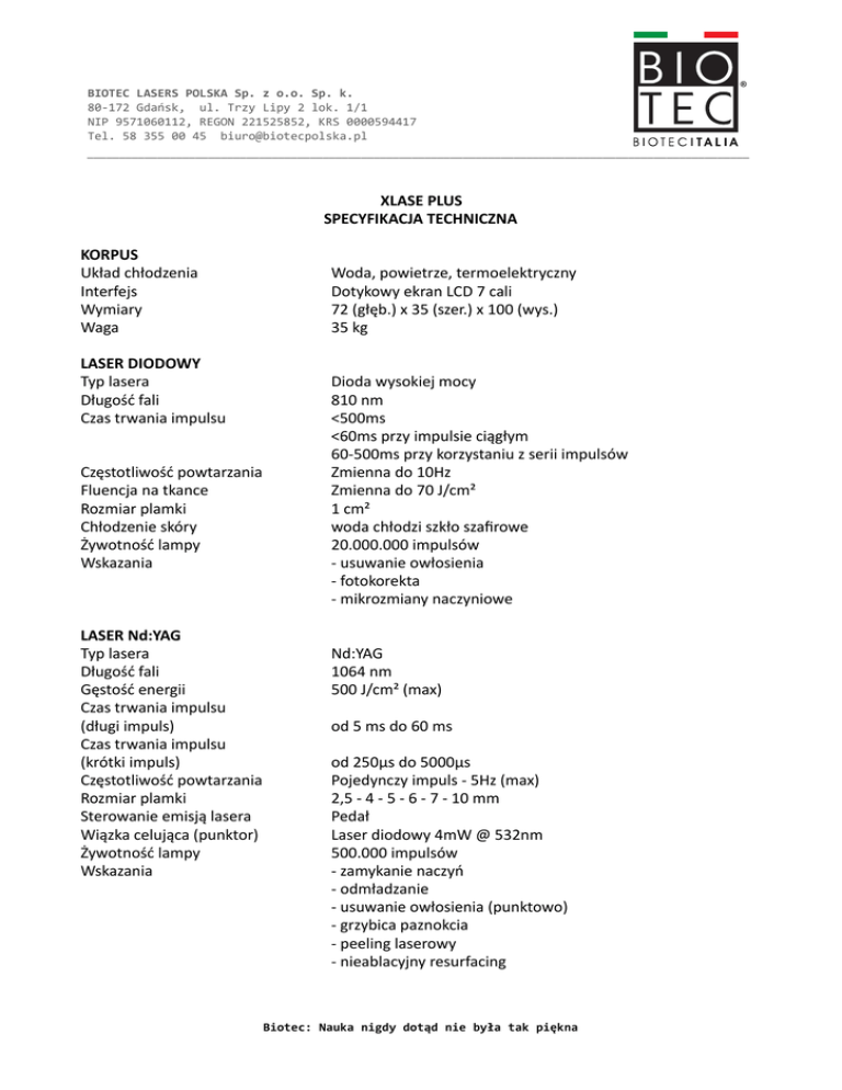 BIOTECLASERSPOLSKASp.zo.o.Sp.k. 80-172Gdańsk,ul.TrzyLipy2lok.1/1 NIP9571060112,REGON221525852,KRS0000594417 [email protected] ________________________________________________________________________________________________________ XLASEPLUS SPECYFIKACJATECHNICZNA KORPUS Układchłodzenia Interfejs Wymiary Waga Woda,powietrze,termoelektryczny DotykowyekranLCD7cali 72(głęb.)x35(szer.)x100(wys.) 35kg LASERDIODOWY Typlasera Długośćfali Czastrwaniaimpulsu Częstotliwośćpowtarzania Fluencjanatkance Rozmiarplamki Chłodzenieskóry Żywotnośćlampy Wskazania Diodawysokiejmocy 810nm <500ms <60msprzyimpulsieciągłym 60-500msprzykorzystaniuzseriiimpulsów Zmiennado10Hz Zmiennado70J/cm² 1cm² wodachłodziszkłoszafirowe 20.000.000impulsów -usuwanieowłosienia -fotokorekta -mikrozmianynaczyniowe LASERNd:YAG Typlasera Długośćfali Gęstośćenergii Czastrwaniaimpulsu (długiimpuls) Czastrwaniaimpulsu (krótkiimpuls) Częstotliwośćpowtarzania Rozmiarplamki Sterowanieemisjąlasera Wiązkacelująca(punktor) Żywotnośćlampy Wskazania Nd:YAG 1064nm 500J/cm²(max) od5msdo60ms od250μsdo5000μs Pojedynczyimpuls-5Hz(max) 2,5-4-5-6-7-10mm Pedał Laserdiodowy4mW@532nm 500.000impulsów -zamykanienaczyń -odmładzanie -usuwanieowłosienia(punktowo) -grzybicapaznokcia -peelinglaserowy -nieablacyjnyresurfacing Biotec:Naukanigdydotądniebyłatakpiękna LASERQ-SWITCHED Typlasera Długośćfali Czastrwaniaimpulsu Częstotliwośćpowtarzania Rozmiarplamki Gęstośćenergiibiernej Q-switched Żywotnośćlampy Wskazania Nd:YAG 1064/KTP532nm 6-20nsec Impulspowtarzalny-do5Hz 3-5mm 1000-5000mJ/cm² 500.000impulsów -usuwanietatuaży -peelinglaserowy -usuwanieprzebarwień LASERER:YAG Typlasera Długośćfali Czastrwaniaimpulsu Częstotliwośćpowtarzania Rozmiarplamki Gęstośćenergii Żywotnośćlampy Wskazania Er:YAG 2940nm krótki,średni,długi Impulspowtarzalny:2Hz(spiętrzany),5Hz(niespiętrzany) Resurfacingfrakcyjny:piksel7x7,10x10,20x20mm Resurfacingablacyjny:5mm krótki:200-1200mJ/P,średni600-1800mJ/P,długi800-2500 mJ/P 500.000impulsów -odmładzanieskóry(resurfacingablacyjnylubfrakcyjny) -peelinglaserowy -usuwanieblizn(pooperacyjnych,pourazowych, potrądzikowych)irozstępów CPL Źródło Spektrumemisji Energianaimpuls Czastrwaniaimpulsu Odstępymiędzyimpulsami Ilośćmikroimpulsówwciągu Częstotliwośćpowtarzania Obszarzabiegowyna1impuls Sterowanieemisjąlasera Żywotnośćlampy Wskazania Lampaksenonowa -550-1200nm -550-950nm -650-950nm -420-1200nm -695-1200nm -755-1200nm 150J(max) od1do40ms od5do50ms od1do5 Pojedynczyimpuls-3Hz(max) 50mmx10mm(5cm²) Pedał,przycisk 50.000impulsów -trądzik -rozszerzonepory -termoliping - rumień Biotec:Naukanigdydotądniebyłatakpiękna Producentemaparatujest:BiotecItaliaSRL V.ledellaRepubblica20 36031Dueville(VI) www.biotecitalia.com WyłącznymdystrybutoremaparaturyBiotecItaliawPolscejest: BiotecLasersPolskaSp.zo.o.Sp.k. ul.TrzyLipy2lok.1/1 80-172Gdańsk NIP9571060112,Regon221525852,KRS0000594417 www.biotecpolska.pl Biotec:Naukanigdydotądniebyłatakpiękna