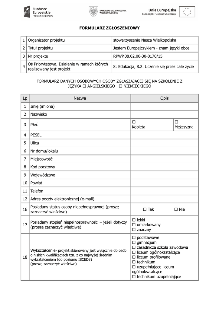 FORMULARZ ZGŁOSZENIOWY 1 Organizator projektu stowarzyszenie Nasza Wielkopolska 2 Tytuł projektu Jestem Europejczykiem - znam języki obce 3 Nr projektu RPWP.08.02.00-30-0170/15 4 Oś Priorytetowa, Działanie w ramach których realizowany jest projekt 8: Edukacja, 8.2. Uczenie się przez całe życie FORMULARZ DANYCH OSOBOWYCH OSOBY ZGŁASZAJĄCEJ SIĘ NA SZKOLENIE Z JĘZYKA ANGIELSKIEGO NIEMIECKIEGO Lp Nazwa Opis 1 Imię (imiona) 2 Nazwisko 3 Płeć Kobieta 4 PESEL _ _ _ _ _ _ _ _ _ _ _ 5 Ulica 6 Nr domu/lokalu 7 Miejscowość 8 Kod pocztowy 9 Województwo Mężczyzna 10 Powiat 11 Telefon 12 Adres poczty elektronicznej (e-mail) 16 Posiadany status osoby niepełnosprawnej (proszę zaznaczyć właściwe) Posiadany stopień niepełnosprawności – jeżeli dotyczy 17 (proszę zaznaczyć właściwe) Wykształcenie- projekt skierowany jest wyłącznie do osób 18 o niskich kwalifikacjach tzn. z co najwyżej średnim wykształceniem (do poziomu ISCED3) (proszę zaznaczyć właściwe) Tak Nie lekki umiarkowany znaczny podstawowe gimnazjum zasadnicza szkoła zawodowa liceum ogólnokształcące liceum profilowane technikum uzupełniające liceum ogólnokształcące technikum uzupełniające Lp Nazwa Opis Uczestnictwo we wsparciu LLL (wsparcie oferowane wcześniej w projektach w ramach Programu 15 Operacyjnego Kapitał Ludzki 2007-2013) (proszę zaznaczyć właściwe) Status na rynku pracy (proszę zaznaczyć właściwe) * osoba pracująca Wielkość przedsiębiorstwa * osoba bierna zawodowo - osoby, które w danej chwili nie tworzą zasobów siły roboczej (tzn. nie pracują i nie są bezrobotne). Studenci studiów stacjonarnych są uznawani za osoby bierne zawodowo. Do osób biernych zawodowo zalicza się również emerytów i rencistów. Osoby będące na urlopie wychowawczym (rozumianym jako nieobecność w pracy, spowodowana opieką nad dzieckiem w okresie, który nie mieści się w ramach urlopu macierzyńskiego lub urlopu rodzicielskiego), są uznawane za bierne zawodowo, chyba że są zarejestrowane już jako bezrobotne (wówczas status bezrobotnego ma pierwszeństwo). Osoby prowadzące działalność na własny rachunek (w tym członek rodziny bezpłatnie pomagający osobie prowadzącej działalność) nie są uznawane za bierne zawodów *osoba bezrobotna - osoby pozostające bez pracy, gotowe do podjęcia pracy i aktywnie poszukujące zatrudnienia. Definicja uwzględnia osoby zarejestrowane jako bezrobotne zgodnie z krajowymi przepisami, nawet jeżeli nie spełniają one wszystkich trzech kryteriów. Osobami bezrobotnymi są zarówno osoby bezrobotne w rozumieniu badania aktywności ekonomicznej ludności, jak i osoby zarejestrowane jako bezrobotne. Definicja nie uwzględnia studentów studiów stacjonarnych, nawet jeśli spełniają powyższe kryteria. Osoby kwalifikujące się do urlopu macierzyńskiego lub rodzicielskiego, które są bezrobotne w rozumieniu niniejszej definicji (nie pobierają świadczeń z tytułu urlopu), są również osobami bezrobotnymi w rozumieniu Wytycznych; 19 20 Wielkość i rodzaj przedsiębiorstwa Tak Nie Tak Nie Tak Nie Tak Nie mikro małe średnie duże w tym: smozatrudnienie administracja publiczna nie dotyczy Niniejszym oświadczam, że: 1. 2. 3. 4. 5. 6. wyrażam zgodę na udział w postępowaniu rekrutacyjnym w ramach projektu „Jestem Europejczykiem - znam języki obce” wyrażam zgodę na gromadzenie, przetwarzanie moich danych osobowych zawartych w niniejszym formularzu (zgodnie z Ustawą z dnia 29 sierpnia 1997 r. o ochronie danych osobowych Dz. U. z 2002 r. Nr 101 poz. 926, ze zm.), do celów związanych z przeprowadzeniem rekrutacji w ramach w/w projektu zgłaszam się do projektu z własnej inicjatywy kierowany potrzebą podniesienia kompetencji. świadomy/-a odpowiedzialności karnej za składanie nieprawdziwych danych (art. 233 k. k.) oświadczam, że dane zawarte w niniejszym formularzu i w załączonych do niego dokumentach są zgodne ze stanem faktycznym i prawnym, co potwierdzam własnoręcznym podpisem oświadczam, że zostałem poinformowany o tym, że projekt jest współfinansowany z środków Unii Europejskiej Wyrażam zgodę na udział w procesie monitoringu i ewaluacji projektu, w tym m.in. wypełnianie ankiet, dokumentów oraz testów sprawdzających …........................................... podpis