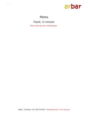2016-08-12 Menu Piątek, 12 sierpnia Menu jest jeszcze niedostępne. ArBar - Catering • tel. 504 235 848 • [email protected] • www.arbar.pl