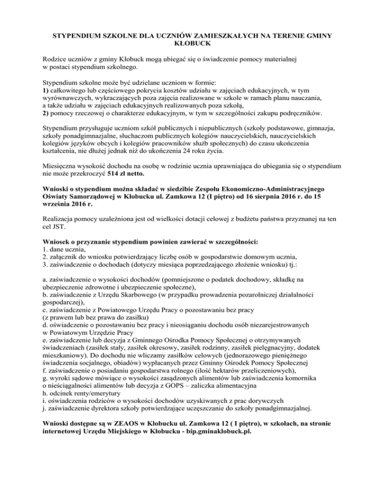 STYPENDIUM SZKOLNE DLA UCZNIÓW ZAMIESZKAŁYCH NA TERENIE GMINY KŁOBUCK Rodzice uczniów z gminy Kłobuck mogą ubiegać się o świadczenie pomocy materialnej w postaci stypendium szkolnego. Stypendium szkolne może być udzielane uczniom w formie: 1) całkowitego lub częściowego pokrycia kosztów udziału w zajęciach edukacyjnych, w tym wyrównawczych, wykraczających poza zajęcia realizowane w szkole w ramach planu nauczania, a także udziału w zajęciach edukacyjnych realizowanych poza szkołą, 2) pomocy rzeczowej o charakterze edukacyjnym, w tym w szczególności zakupu podręczników. Stypendium przysługuje uczniom szkół publicznych i niepublicznych (szkoły podstawowe, gimnazja, szkoły ponadgimnazjalne, słuchaczom publicznych kolegiów nauczycielskich, nauczycielskich kolegiów języków obcych i kolegiów pracowników służb społecznych) do czasu ukończenia kształcenia, nie dłużej jednak niż do ukończenia 24 roku życia. Miesięczna wysokość dochodu na osobę w rodzinie ucznia uprawniająca do ubiegania się o stypendium nie może przekroczyć 514 zł netto. Wnioski o stypendium można składać w siedzibie Zespołu Ekonomiczno-Administracyjnego Oświaty Samorządowej w Kłobucku ul. Zamkowa 12 (I piętro) od 16 sierpnia 2016 r. do 15 września 2016 r. Realizacja pomocy uzależniona jest od wielkości dotacji celowej z budżetu państwa przyznanej na ten cel JST. Wniosek o przyznanie stypendium powinien zawierać w szczególności: 1. dane ucznia, 2. załącznik do wniosku potwierdzający liczbę osób w gospodarstwie domowym ucznia, 3. zaświadczenie o dochodach (dotyczy miesiąca poprzedzającego złożenie wniosku) tj.: a. zaświadczenie o wysokości dochodów (pomniejszone o podatek dochodowy, składkę na ubezpieczenie zdrowotne i ubezpieczenie społeczne), b. zaświadczenie z Urzędu Skarbowego (w przypadku prowadzenia pozarolniczej działalności gospodarczej), c. zaświadczenie z Powiatowego Urzędu Pracy o pozostawaniu bez pracy (z prawem lub bez prawa do zasiłku) d. oświadczenie o pozostawaniu bez pracy i nieosiąganiu dochodu osób niezarejestrowanych w Powiatowym Urzędzie Pracy e. zaświadczenie lub decyzja z Gminnego Ośrodka Pomocy Społecznej o otrzymywanych świadczeniach (zasiłek stały, zasiłek okresowy, zasiłek rodzinny, zasiłek pielęgnacyjny, dodatek mieszkaniowy). Do dochodu nie wliczamy zasiłków celowych (jednorazowego pieniężnego świadczenia socjalnego, obiadów) wypłacanych przez Gminny Ośrodek Pomocy Społecznej f. zaświadczenie o posiadaniu gospodarstwa rolnego (ilość hektarów przeliczeniowych), g. wyroki sądowe mówiące o wysokości zasądzonych alimentów lub zaświadczenia komornika o nieściągalności alimentów lub decyzja z GOPS – zaliczka alimentacyjna h. odcinek renty/emerytury i. oświadczenia rodziców o wysokości dochodów uzyskiwanych z prac dorywczych j. zaświadczenie dyrektora szkoły potwierdzające uczęszczanie do szkoły ponadgimnazjalnej. Wnioski dostępne są w ZEAOS w Kłobucku ul. Zamkowa 12 ( I piętro), w szkołach, na stronie internetowej Urzędu Miejskiego w Kłobucku - bip.gminaklobuck.pl. WYPRAWKA SZKOLNA W ROKU SZKOLNYM 2016/2017 Zgodnie z Rządowym programem pomocy uczniom w 2016 roku – „Wyprawka szkolna” mieszkańcy gminy moga ubiegać się o finansowanie zakupów podręczników. W roku szkolnym 2016/2017 pomoc skierowana zostaje do: • słabowidzących, • niesłyszących, • słabosłyszących, • z upośledzeniem umysłowym w stopniu lekkim, • z upośledzeniem umysłowym w stopniu umiarkowanym lub znacznym, • z niepełnosprawnością ruchową, w tym z afazją, • z autyzmem, w tym z zespołem Aspergera, • z niepełnosprawnościami sprzężonymi, w przypadku gdy jedną z niepełnosprawności jest niepełnosprawność wymieniona powyżej – posiadających orzeczenie o potrzebie kształcenia specjalnego, o których mowa w art. 71b ust. 3 ustawy z dnia 7 września 1991 r. o systemie oświaty, zwanej dalej „ustawą”, uczęszczających w roku szkolnym 2016/2017 do szkół dla dzieci i młodzieży do: klasy VI szkoły podstawowej, klasy III gimnazjum, szkoły ponadgimnazjalnej: zasadniczej szkoły zawodowej, liceum ogólnokształcącego, technikum lub szkoły specjalnej przysposabiającej do pracy dla uczniów z upośledzeniem umysłowym w stopniu umiarkowanym lub znacznym oraz dla uczniów z niepełnosprawnościami sprzężonymi lub do klasy VI ogólnokształcącej szkoły muzycznej I stopnia, klas III–VI ogólnokształcącej szkoły muzycznej II stopnia, klas III–VI ogólnokształcącej szkoły sztuk pięknych, klas III i VI–IX ogólnokształcącej szkoły baletowej, lub liceum plastycznego. - w przypadku uczniów z niepełnosprawnością intelektualną w stopniu umiarkowanym lub znacznym oraz uczniów z niepełnosprawnościami sprzężonymi, w przypadku gdy jedną z niepełnosprawności jest niepełnosprawność intelektualna w stopniu umiarkowanym lub znacznym, uczęszczających w roku szkolnym 2016/2017 do szkół dla dzieci i młodzieży do: klas I–III i VI szkoły podstawowej, klasy III gimnazjum, lub szkoły ponadgimnazjalnej, dofinansowanie obejmuje również zakup materiałów edukacyjnych, o których mowa w art. 3 pkt 24 ustawy. Pomoc, o której mowa jest udzielana na wniosek rodziców ucznia (prawnych opiekunów, rodziców zastępczych, osób prowadzących rodzinny dom dziecka) albo pełnoletniego ucznia, albo na wniosek nauczyciela, pracownika socjalnego lub innej osoby, za zgodą rodziców ucznia (prawnych opiekunów, rodziców zastępczych, osób prowadzących rodzinny dom dziecka) albo pełnoletniego ucznia do 7 września 2016r. Wniosek o dofinansowanie zakupu podręczników należy złożyć do dyrektora szkoły, do której uczeń będzie uczęszczał w roku szkolnym 2016/2017. Do wniosku należy dołączyć kopię orzeczenia o potrzebie kształcenia specjalnego, o którym mowa w art. 71b ust. 3 ustawy. Wnioski dostępne są w szkole,