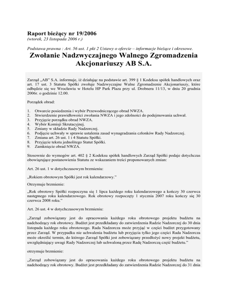 Raport bieŜący nr 19/2006 (wtorek, 23 listopada 2006 r.) Podstawa prawna : Art. 56 ust. 1 pkt 2 Ustawy o ofercie – informacje bieŜące i okresowe. Zwołanie Nadzwyczajnego Walnego Zgromadzenia Akcjonariuszy AB S.A. Zarząd „AB” S.A. informuje, iŜ działając na podstawie art. 399 § 1 Kodeksu spółek handlowych oraz art. 17 ust. 3 Statutu Spółki zwołuje Nadzwyczajne Walne Zgromadzenie Akcjonariuszy, które odbędzie się we Wrocławiu w Hotelu HP Park Plaza przy ul. Drobnera 11/13, w dniu 20 grudnia 2006r. o godzinie 12.00. Porządek obrad: 1. 2. 3. 4. 5. 6. 7. 8. 9. Otwarcie posiedzenia i wybór Przewodniczącego obrad NWZA. Stwierdzenie prawidłowości zwołania NWZA i jego zdolności do podejmowania uchwał. Przyjęcie porządku obrad NWZA. Wybór Komisji Skrutacyjnej. Zmiany w składzie Rady Nadzorczej. Podjęcie uchwały w sprawie ustalenia zasad wynagradzania członków Rady Nadzorczej. Zmiana art. 26 ust. 1 i 4 Statutu Spółki. Przyjęcie tekstu jednolitego Statut Spółki. Zamknięcie obrad NWZA. Stosownie do wymogów art. 402 § 2 Kodeksu spółek handlowych Zarząd Spółki podaje dotychczas obowiązujące postanowienia Statutu ze wskazaniem treści proponowanych zmian: Art. 26 ust. 1 w dotychczasowym brzmieniu: „Rokiem obrotowym Spółki jest rok kalendarzowy.” Otrzymuje brzmienie: „Rok obrotowy Spółki rozpoczyna się 1 lipca kaŜdego roku kalendarzowego a kończy 30 czerwca następnego roku kalendarzowego. Rok obrotowy rozpoczęty 1 stycznia 2007 roku kończy się 30 czerwca 2008 roku.” Art. 26 ust. 4 w dotychczasowym brzmieniu: „Zarząd zobowiązany jest do opracowania kaŜdego roku obrotowego projektu budŜetu na nadchodzący rok obrotowy. BudŜet jest przedkładany do zatwierdzenia Radzie Nadzorczej do 30 dnia listopada kaŜdego roku obrotowego. Rada Nadzorcza moŜe przyjąć w części budŜet przygotowany przez Zarząd. W przypadku nie uchwalenia budŜetu lub przyjęcia tylko jego części Rada Nadzorcza moŜe określić termin, do którego Zarząd Spółki jest zobowiązany przedłoŜyć nowy projekt budŜetu, uwzględniający uwagi Rady Nadzorczej lub uchwaloną przez Radę Nadzorczą część budŜetu.” otrzymuje brzmienie: „Zarząd zobowiązany jest do opracowania kaŜdego roku obrotowego projektu budŜetu na nadchodzący rok obrotowy. BudŜet jest przedkładany do zatwierdzenia Radzie Nadzorczej do 31 dnia maja kaŜdego roku obrotowego. Rada Nadzorcza moŜe przyjąć w części budŜet przygotowany przez Zarząd. W przypadku nie uchwalenia budŜetu lub przyjęcia tylko jego części Rada Nadzorcza moŜe określić termin, do którego Zarząd Spółki jest zobowiązany przedłoŜyć nowy projekt budŜetu, uwzględniający uwagi Rady Nadzorczej lub uchwaloną przez Radę Nadzorczą część budŜetu.” Rejestracja Akcjonariuszy i wydawanie kart do głosowania rozpocznie się w dniu odbycia Nadzwyczajnego Walnego Zgromadzenia Spółki przed salą obrad o godz. 10.45. Akcjonariusze mogą brać udział w Walnym Zgromadzeniu oraz wykonywać prawo głosu osobiście lub przez pełnomocnika. Przedstawiciele osób prawnych powinni okazać aktualne wyciągi z odpowiednich rejestrów, wymieniające osoby uprawnione do reprezentowania tych podmiotów. Współwłaściciele akcji zobowiązani są wskazać swego przedstawiciela do udziału w Walnym Zgromadzeniu. Pełnomocnictwo do udziału w Zgromadzeniu powinno być, pod rygorem niewaŜności, udzielone na piśmie. Zgodnie z art. 406 § 1 Kodeksu spółek handlowych oraz art. 9 Ustawy o obrocie instrumentami finansowymi prawo do uczestnictwa w Walnym Zgromadzeniu przysługuje: - uprawnionym z akcji imiennych i świadectw tymczasowych oraz zastawnikom i uŜytkownikom akcji, którym przysługuje prawo głosu, jeŜeli są wpisani do księgi akcyjnej przynajmniej na tydzień przed odbyciem Walnego Zgromadzenia, - uprawnionym z akcji na okaziciela, jeśli złoŜą w siedzibie Spółki przynajmniej na tydzień przed odbyciem Walnego Zgromadzenia, imienne świadectwo depozytowe, wystawione przez podmiot prowadzący rachunek papierów wartościowych, potwierdzające upowaŜnienie posiadacza akcji zdematerializowanych do uczestnictwa w tym Zgromadzeniu. W treści świadectwa podmiot prowadzący rachunek papierów wartościowych potwierdza, iŜ na okres od wydania świadectwa do zakończenia Walnego Zgromadzenia podmiot prowadzący rachunek papierów wartościowych dokonał blokady akcji wymienionych w świadectwie. Świadectwa depozytowe naleŜy składać w siedzibie Spółki, w Sekretariacie Zarządu przy ulicy Kościerzyńskiej 32, w terminie do dnia 13 grudnia 2006 roku (włącznie), w godzinach 9.00 - 16.00 Zgodnie z art. 407 § 1 Kodeksu spółek handlowych lista akcjonariuszy uprawnionych do uczestnictwa w Nadzwyczajnym Walnym Zgromadzeniu będzie wyłoŜona do wglądu w siedzibie Spółki we Wrocławiu przy ul. Kościerzyńskiej 32 na trzy dni powszednie przed terminem Zgromadzenia. .