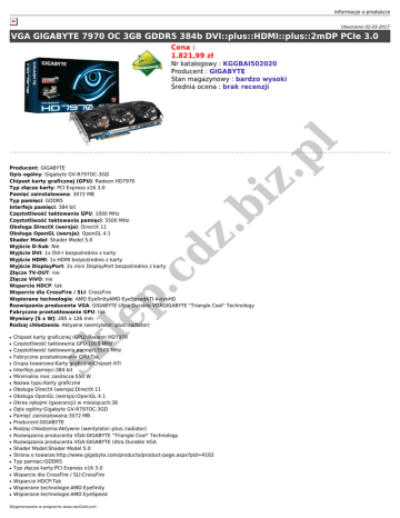 Informacje o produkcie Utworzono 02-03-2017 VGA GIGABYTE 7970 OC 3GB GDDR5 384b DVI::plus::HDMI::plus::2mDP PCIe 3.0 Cena : 1.821,99 zł iz .p l Nr katalogowy : KGGBAI502020 Producent : GIGABYTE Stan magazynowy : bardzo wysoki Średnia ocena : brak recenzji ● ● ● ● ● ● ● ● ● ● ● ● ● ● ● ● ● ● ● ● ● ● ● ● Chipset karty graficznej (GPU):Radeon HD7970 Częstotliwość taktowania GPU:1000 MHz Częstotliwość taktowania pamięci:5500 MHz Fabryczne przetaktowanie GPU:Tak Grupa towarowa:Karty graficzne\Chipset ATI Interfejs pamięci:384 bit Minimalna moc zasilacza:550 W Nazwa typu:Karty graficzne Obsługa DirectX (wersja):DirectX 11 Obsługa OpenGL (wersja):OpenGL 4.1 Okres rękojmi (gwarancji) w miesiącach:36 Opis ogólny:Gigabyte GV-R797OC-3GD Pamięć zainstalowana:3072 MB Producent:GIGABYTE Rodzaj chłodzenia:Aktywne (wentylator::plus::radiator) Rozwiązania producenta VGA:GIGABYTE "Triangle Cool" Technology Rozwiązania producenta VGA:GIGABYTE Ultra Durable VGA Shader Model:Shader Model 5.0 Strona o towarze:http://www.gigabyte.com/products/product-page.aspx?pid=4102 Typ pamięci:GDDR5 Typ złącza karty:PCI Express x16 3.0 Wsparcie dla CrossFire / SLI:CrossFire Wsparcie HDCP:Tak Wspierane technologie:AMD Eyefinity Wspierane technologie:AMD EyeSpeed sk ● le p .c dz .b Producent: GIGABYTE Opis ogólny: Gigabyte GV-R797OC-3GD Chipset karty graficznej (GPU): Radeon HD7970 Typ złącza karty: PCI Express x16 3.0 Pamięć zainstalowana: 3072 MB Typ pamięci: GDDR5 Interfejs pamięci: 384 bit Częstotliwość taktowania GPU: 1000 MHz Częstotliwość taktowania pamięci: 5500 MHz Obsługa DirectX (wersja): DirectX 11 Obsługa OpenGL (wersja): OpenGL 4.1 Shader Model: Shader Model 5.0 Wyjście D-Sub: Nie Wyjście DVI: 1x DVI-I bezpośrednio z karty Wyjście HDMI: 1x HDMI bezpośrednio z karty Wyjście DisplayPort: 2x mini DisplayPort bezpośrednio z karty Złącze TV-OUT: nie Złącze VIVO: nie Wsparcie HDCP: tak Wsparcie dla CrossFire / SLI: CrossFire Wspierane technologie: AMD EyefinityAMD EyeSpeedATI AvivoHD Rozwiązania producenta VGA: GIGABYTE Ultra Durable VGAGIGABYTE "Triangle Cool" Technology Fabryczne przetaktowanie GPU: tak Wymiary [S x W]: 285 x 126 mm Rodzaj chłodzenia: Aktywne (wentylator::plus::radiator) Wygenerowano w programie www.oscGold.com ● ● ● ● ● ● Wspierane technologie:ATI AvivoHD Wyjście DisplayPort:2x mini DisplayPort bezpośrednio z karty Wyjście D-Sub:Nie Wyjście DVI:1x DVI-I bezpośrednio z karty Wyjście HDMI:1x HDMI bezpośrednio z karty Wymiary [S x W]:285 x 126 Złącze TV-OUT:Nie Złącze VIVO:Nie sk le p .c dz .b Grupa towarowa: Karty graficzne\Chipset ATI Miejsce serwisowania: Incom S.A. Nazwa typu: Karty graficzne Okres rękojmi (gwarancji) w miesiącach: 36 Opis ogólny: Gigabyte GV-R797OC-3GD Producent: GIGABYTE Stan magazynu Wrocław: 9.00 Typ pamięci: GDDR5 Pamięć zainstalowana: 3072 MB Strona o towarze: http://www.gigabyte.com/products/product-page.aspx?pid=4102 Wymiary [S x W]: 285 x 126 Chipset karty graficznej (GPU): Radeon HD7970 Częstotliwość taktowania GPU: 1000 MHz Częstotliwość taktowania pamięci: 5500 MHz Fabryczne przetaktowanie GPU: Tak Interfejs pamięci: 384 bit Obsługa DirectX (wersja): DirectX 11 Obsługa OpenGL (wersja): OpenGL 4.1 Rodzaj chłodzenia: Aktywne (wentylator radiator) Rozwiązania producenta VGA: GIGABYTE "Triangle Cool" Technology Shader Model: Shader Model 5.0 Typ złącza karty: PCI Express x16 3.0 Wsparcie dla CrossFire / SLI: CrossFire Wsparcie HDCP: Tak Wspierane technologie: AMD Eyefinity Wyjście DisplayPort: 2x mini DisplayPort bezpośrednio z karty Wyjście D-Sub: Nie Wyjście DVI: 1x DVI-I bezpośrednio z karty Wyjście HDMI: 1x HDMI bezpośrednio z karty Złącze TV-OUT: Nie Złącze VIVO: Nie Minimalna moc zasilacza: 550 W l ● iz .p ●