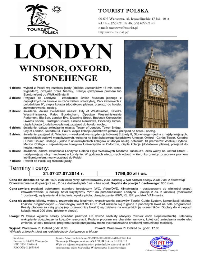 TOURIST POLSKA 00-697 Warszawa, Al. Jerozolimskie 47 lok. 10 A tel / fax: (22) 621 32 46, (22) 622 62 43 e-mail: [email protected] http://www.tourist.pl/ LONDYN WINDSOR, OXFORD, STONEHENGE 1 dzień: wyjazd z Polski wg rozkładu jazdy (zbiórka uczestników 15 min przed wyjazdem), przejazd przez Niemcy, Francję (przeprawa promem lub Eurotunelem) do Wielkiej Brytanii 2 dzień: Przyjazd do Londynu - zwiedzanie: British Museum jednego z największych na świecie muzeów historii starożytnej, Park Greenwich z południkiem 0°, ciepła kolacja (dodatkowo płatna), przejazd do hotelu, zakwaterowanie, nocleg. 3 dzień: śniadanie, dalsze zwiedzanie miasta: City of Westminster, Katedra Westministerska, Pałac Buckingham, Opactwo Westministerskie Parlament, Big Ben, London Eye, Downing Street, Budynek Królewskiej Gwardii Konnej, Trafalgar Square, Galeria Narodowa, Piccadilly Circus, ciepła kolacja (dodatkowo płatna), przejazd do hotelu, nocleg. 4 dzień: śniadanie, dalsze zwiedzanie miasta: Tower of London, Tower Bridge, City of London, Katedra ST. Paul’s, ciepła kolacja (dodatkowo płatna), przejazd do hotelu, nocleg. 5 dzień: śniadanie, przejazd do Windsoru - weekendowa rezydencja królowej Elżbiety II, Stonehenge - jedna z najsłynniejszych, europejskich budowli megalitycznych, wpisana na listę światowego dziedzictwa Unesco, Oxford - Carfax Tower, Katedra i Christ Church College - jedno z uniwersyteckich kolegiów w którym naukę pobierało 13 premierów Wielkiej Brytanii, Merton College - najważniejsze kolegium Uniwersytetu w Oxfordzie, ciepła kolacja (dodatkowo płatna), przejazd do hotelu, nocleg. 6 dzień: śniadanie, dalsze zwiedzanie Londynu: Galeria Figur Woskowych Madame Tussaud’s, czas wolny na Oxford Street najsłynniejszej ulicy handlowej w Londynie. W godzinach wieczornych odjazd w kierunku granicy, przeprawa promem lub Eurotunelem, nocny przejazd do Polski. 7 dzień: Powrót do Polski wg rozkładu jazdy. Terminy i ceny: 21.07-27.07.2014 r. 1799,00 zł / os. Cena dla dziecka do 12 lat: 1699 zł/dziecko (przy zakwaterowaniu z os. dorosłą w tym samym pokoju 2 lub 2 os. z dostawką) Dokwaterowanie do pokoju 2 os., 2 os z dostawką lub 3 os. - bez opłat. Dopłata do pokoju 1 osobowego: 880 zł/os. Cena zawiera: przejazd autokarem: standard turystyczny (WC, Video/DVD, klimatyzacja - dostosowany do wielkości grupy), zakwaterowanie: 4 noclegi hotel turystyczny **/*** na przedmieściach Londynu - pokoje 2 os. z łazienką (możliwość 1 dostawki), wyżywienie: 4 śniadania, opieka pilota, ubezpieczenie NNW, KL, BP, podatek VAT-marża. Cena nie zawiera: biletów wstępu, przewodników lokalnych, wypożyczenia zestawów Tourist Guide System, komunikacji lokalnej, kosztów programowych – orientacyjny koszt 95 GBP. Pilot rozlicza się z grupą z pobranych kwot na cele programowe. Koszty płacone za całą grupę (np. przewodnicy lokalni) są dzielone na wszystkich jej uczestników. Dopłaty do 4 ciepłych kolacji; koszt 200 zł/os. (płatne w biurze). Uwagi: W trakcie wyjazdu należy posiadać paszport lub dowód osobisty (dotyczy również osób niepełnoletnich). Zalecamy wykupienie ubezpieczenia kosztów rezygnacji. Podany program ma charakter ramowy, kolejność zwiedzania może ulec zmianie. W celu realizacji programu cześć przejazdów może być realizowana środkami komunikacji miejskiej. Wyjazd: Warszawa Pl. Defilad godz. 8.00. Powrót: Warszawa Pl. Defilad ok. godz. 17.00 Wyjazdy z innych miast wg rozkładu jazdy dostępnego w biurze. Siedziba: Boczna 4, 05-123 Chotomów NIP: 536-135-68-44 REGON: 012650846 Konto: Alior Bank S.A. nr: 95-2490-0005-0000-4510-6122-1445 Gwarancja Ubezpieczeniowa AXA TUiR S.A. nr 01.352.615 Wpis do rejestru organizatorów i pośredników turystyki nr 457 prowadzony przez Marszałka Województwa Mazowieckiego Cz ł onek Polskiej Izby Turystyki