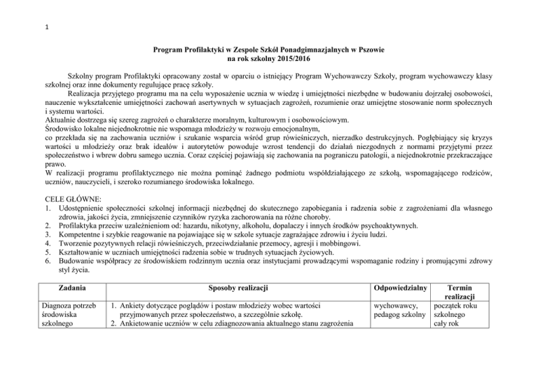 1 Program Profilaktyki w Zespole Szkół Ponadgimnazjalnych w Pszowie na rok szkolny 2015/2016 Szkolny program Profilaktyki opracowany został w oparciu o istniejący Program Wychowawczy Szkoły, program wychowawczy klasy szkolnej oraz inne dokumenty regulujące pracę szkoły. Realizacja przyjętego programu ma na celu wyposażenie ucznia w wiedzę i umiejętności niezbędne w budowaniu dojrzałej osobowości, nauczenie wykształcenie umiejętności zachowań asertywnych w sytuacjach zagrożeń, rozumienie oraz umiejętne stosowanie norm społecznych i systemu wartości. Aktualnie dostrzega się szereg zagrożeń o charakterze moralnym, kulturowym i osobowościowym. Środowisko lokalne niejednokrotnie nie wspomaga młodzieży w rozwoju emocjonalnym, co przekłada się na zachowania uczniów i szukanie wsparcia wśród grup rówieśniczych, nierzadko destrukcyjnych. Pogłębiający się kryzys wartości u młodzieży oraz brak ideałów i autorytetów powoduje wzrost tendencji do działań niezgodnych z normami przyjętymi przez społeczeństwo i wbrew dobru samego ucznia. Coraz częściej pojawiają się zachowania na pograniczu patologii, a niejednokrotnie przekraczające prawo. W realizacji programu profilaktycznego nie można pominąć żadnego podmiotu współdziałającego ze szkołą, wspomagającego rodziców, uczniów, nauczycieli, i szeroko rozumianego środowiska lokalnego. CELE GŁÓWNE: 1. Udostępnienie społeczności szkolnej informacji niezbędnej do skutecznego zapobiegania i radzenia sobie z zagrożeniami dla własnego zdrowia, jakości życia, zmniejszenie czynników ryzyka zachorowania na różne choroby. 2. Profilaktyka przeciw uzależnieniom od: hazardu, nikotyny, alkoholu, dopalaczy i innych środków psychoaktywnych. 3. Kompetentne i szybkie reagowanie na pojawiające się w szkole sytuacje zagrażające zdrowiu i życiu ludzi. 4. Tworzenie pozytywnych relacji rówieśniczych, przeciwdziałanie przemocy, agresji i mobbingowi. 5. Kształtowanie w uczniach umiejętności radzenia sobie w trudnych sytuacjach życiowych. 6. Budowanie współpracy ze środowiskiem rodzinnym ucznia oraz instytucjami prowadzącymi wspomaganie rodziny i promującymi zdrowy styl życia. Zadania Diagnoza potrzeb środowiska szkolnego Sposoby realizacji 1. Ankiety dotyczące poglądów i postaw młodzieży wobec wartości przyjmowanych przez społeczeństwo, a szczególnie szkołę. 2. Ankietowanie uczniów w celu zdiagnozowania aktualnego stanu zagrożenia Odpowiedzialny wychowawcy, pedagog szkolny Termin realizacji początek roku szkolnego cały rok 2 pod kątem istniejących zagrożeń uzależnieniami. Kontynuacja działań w kierunku utrzymania statusu bezpiecznej szkoły Przeciwdziałanie agresji i przemocy w szkole Informowanie rodziców w zakresie problematyki uzależnień. Formy profilaktyki podejmowane przez szkołę. konkretnymi uzależnieniami. 3. Diagnoza rzeczywistych problemów występujących w społeczności lokalnej (na podstawie informacji: Policji, służby zdrowia, kuratorów sądowych, pracowników socjalnych, itp.,). 1. Utrzymanie systemu chroniącego szkołę przed przenikaniem do niej osób spoza szkoły (dyżury nauczycieli i woźny szkolny, monitoring). 2. Zabezpieczenie szkoły w czasie różnych imprez szkolnych we współpracy z rodzicami uczniów. 3. Podejmowanie działań przeciwdziałających zjawisku tzw. szykanowania. 1. Przeprowadzanie spotkań z pedagogiem, psychologiem, policją, przedstawicielami sądu - spotkania z młodzieżą, rodzicami, nauczycielami mające na celu uświadomienie problemu i zaangażowanie we współpracę w redukowaniu aktów agresji i przemocy w szkole. 2. Przeprowadzanie pogadanek w klasach I-ych dot. diagnozowania problemu „kozła ofiarnego”, izolowania i tzw „fali”. 3. Stwarzanie alternatywnych form spędzania wolnego czasu (np. Otrzęsiny, Andrzejki, szkolny dzień sportu, wyjazdy do teatru, kina, wycieczki; inne imprezy integrujące społeczność szkolną, zajęcia pozalekcyjne, zajęcia sportowe, koła zainteresowań np. koło fotograficzne, Klub Europejski, PCK, szkolne koło Caritas i inne ). 4. Realizacja szkolnego programu profilaktycznego „Agresji – stop!” 1. Pogadanki dla rodziców na temat uzależnień (hazardu, nikotyny, alkoholu, dopalaczy i innych środków psychoaktywnych, tablice informacyjne) ze szczególnym uwzględnieniem dopalaczy. 2. Prelekcje dla rodziców prowadzone przez specjalistów. 3. Stałe kontakty z członkami rady pedagogicznej w sytuacji pojawiających się zagrożeń. 1. Zajęcia integracyjne w klasach pierwszych. 2. Zajęcia integrujące zespół klasowy, happening „Agresji –Stop!”, organizacja przyjęcia pierwszoklasistów w poczet uczniów szkoły 3. Prezentacja problematyki uzależnień w ramach lekcji wychowawczych (hazardu, nikotyny, alkoholu, dopalaczy i innych środków psychoaktywnych). dyrekcja szkoły, nauczyciele, pedagog szkolny dyrekcja szkoły nauczyciele, samorząd uczniowski rodzice pedagog szkolny, przedstawiciel policji nauczyciele, samorząd uczniowski higienistka na bieżąco wg. potrzeb cały rok wg potrzeb wg harmonogramu pedagog szkolny, przedstawiciel policji nauczyciele, zebrania rodziów wg potrzeb Wychowawcy pedagog szkolny samorząd uczniowski wychowawcy początek roku szkolnego wrzesień/ październik cały rok zgodnie 3 4. Organizowanie dla młodzieży spotkań ze specjalistami z różnych dziedzin. 5. Zajęcia dla młodzieży z wykorzystaniem programów profilaktycznych: „Ars czyli jak dbać o miłość”, „Podstępne WZW”, „Wybierz życie – pierwszy krok”, „Znamię – znam je”, „Popularyzacja zaleceń Europejskiego Kodeksu Walki z Rakiem”. 6. Zajęcia dla młodzieży z wykorzystaniem filmów dydaktycznych. 7. Włączanie tematyki uzależnień w treści lekcji przedmiotowych (hazard, nikotyna, alkohol, dopalacze i inne środki psychoaktywne). 8. Indywidualna pomoc psychologiczno – pedagogiczna dla uczniów i ich rodzic