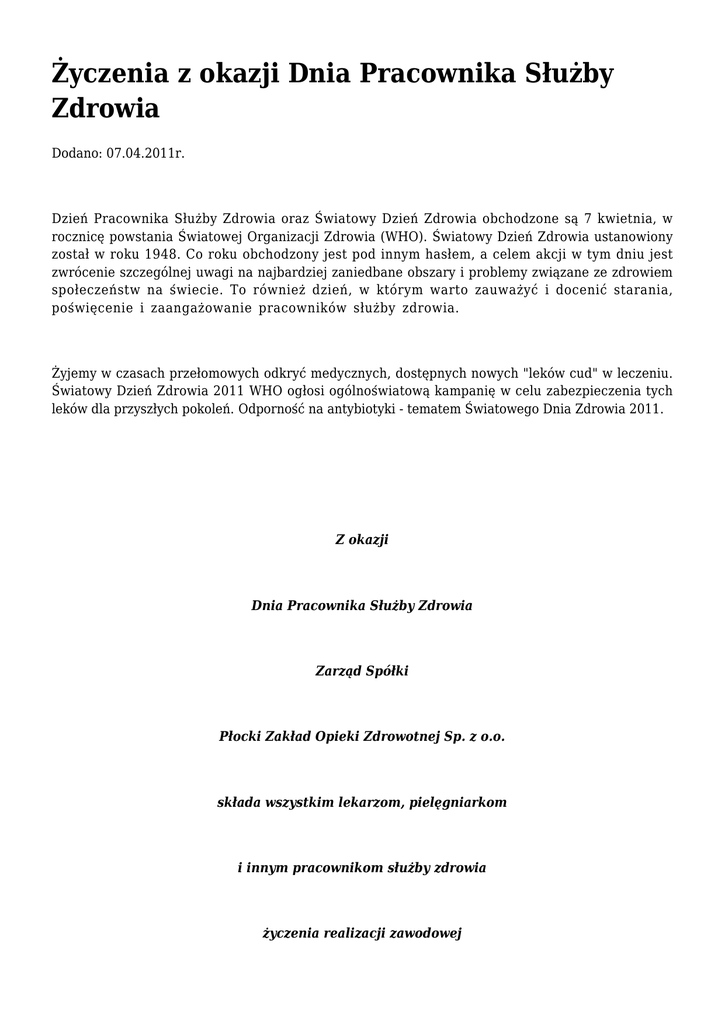 Życzenia z okazji Dnia Pracownika Służby Zdrowia Dodano: 07.04.2011r. Dzień Pracownika Służby Zdrowia oraz Światowy Dzień Zdrowia obchodzone są 7 kwietnia, w rocznicę powstania Światowej Organizacji Zdrowia (WHO). Światowy Dzień Zdrowia ustanowiony został w roku 1948. Co roku obchodzony jest pod innym hasłem, a celem akcji w tym dniu jest zwrócenie szczególnej uwagi na najbardziej zaniedbane obszary i problemy związane ze zdrowiem społeczeństw na świecie. To również dzień, w którym warto zauważyć i docenić starania, poświęcenie i zaangażowanie pracowników służby zdrowia. Żyjemy w czasach przełomowych odkryć medycznych, dostępnych nowych "leków cud" w leczeniu. Światowy Dzień Zdrowia 2011 WHO ogłosi ogólnoświatową kampanię w celu zabezpieczenia tych leków dla przyszłych pokoleń. Odporność na antybiotyki - tematem Światowego Dnia Zdrowia 2011. Z okazji Dnia Pracownika Służby Zdrowia Zarząd Spółki Płocki Zakład Opieki Zdrowotnej Sp. z o.o. składa wszystkim lekarzom, pielęgniarkom i innym pracownikom służby zdrowia życzenia realizacji zawodowej i docenienia ich ciężkiej pracy na rzecz niesienia pomocy innym.