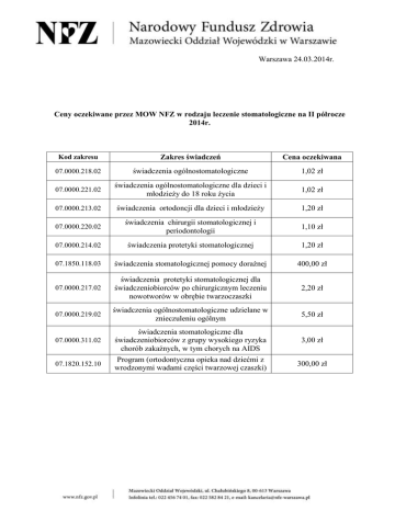Warszawa 24.03.2014r. Ceny oczekiwane przez MOW NFZ w rodzaju leczenie stomatologiczne na II półrocze 2014r. Kod zakresu Zakres świadczeń Cena oczekiwana 07.0000.218.02 świadczenia ogólnostomatologiczne 1,02 zł 07.0000.221.02 świadczenia ogólnostomatologiczne dla dzieci i młodzieży do 18 roku życia 1,02 zł 07.0000.213.02 świadczenia ortodoncji dla dzieci i młodzieży 1,20 zł 07.0000.220.02 świadczenia chirurgii stomatologicznej i periodontologii 1,10 zł 07.0000.214.02 świadczenia protetyki stomatologicznej 1,20 zł 07.1850.118.03 świadczenia stomatologicznej pomocy doraźnej 400,00 zł 07.0000.217.02 świadczenia protetyki stomatologicznej dla świadczeniobiorców po chirurgicznym leczeniu nowotworów w obrębie twarzoczaszki 2,20 zł 07.0000.219.02 świadczenia ogólnostomatologiczne udzielane w znieczuleniu ogólnym 5,50 zł 07.0000.311.02 07.1820.152.10 świadczenia stomatologiczne dla świadczeniobiorców z grupy wysokiego ryzyka chorób zakaźnych, w tym chorych na AIDS Program (ortodontyczna opieka nad dziećmi z wrodzonymi wadami części twarzowej czaszki) 3,00 zł 300,00 zł