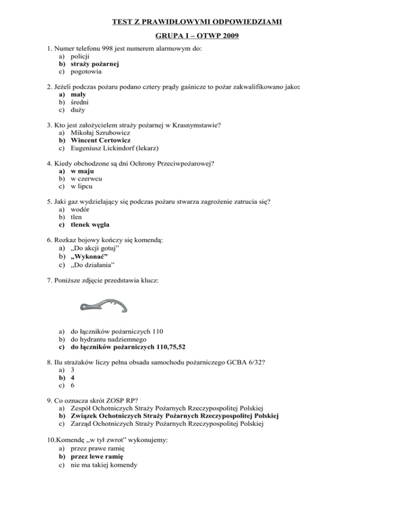 TEST Z PRAWIDŁOWYMI ODPOWIEDZIAMI GRUPA I – OTWP 2009 1. Numer telefonu 998 jest numerem alarmowym do: a) policji b) straży pożarnej c) pogotowia 2. Jeżeli podczas pożaru podano cztery prądy gaśnicze to pożar zakwalifikowano jako: a) mały b) średni c) duży 3. Kto jest założycielem straży pożarnej w Krasnymstawie? a) Mikołaj Szrubowicz b) Wincent Certowicz c) Eugeniusz Lickindorf (lekarz) 4. Kiedy obchodzone są dni Ochrony Przeciwpożarowej? a) w maju b) w czerwcu c) w lipcu 5. Jaki gaz wydzielający się podczas pożaru stwarza zagrożenie zatrucia się? a) wodór b) tlen c) tlenek węgla 6. Rozkaz bojowy kończy się komendą: a) „Do akcji gotuj” b) „Wykonać” c) „Do działania” 7. Poniższe zdjęcie przedstawia klucz: a) do łączników pożarniczych 110 b) do hydrantu nadziemnego c) do łączników pożarniczych 110,75,52 8. Ilu strażaków liczy pełna obsada samochodu pożarniczego GCBA 6/32? a) 3 b) 4 c) 6 9. Co oznacza skrót ZOSP RP? a) Zespół Ochotniczych Straży Pożarnych Rzeczypospolitej Polskiej b) Związek Ochotniczych Straży Pożarnych Rzeczypospolitej Polskiej c) Zarząd Ochotniczych Straży Pożarnych Rzeczypospolitej Polskiej 10.Komendę ,,w tył zwrot” wykonujemy: a) przez prawe ramię b) przez lewe ramię c) nie ma takiej komendy 11. W którym roku założona została straż ogniowa w Krasnymstawie? a) 1881 r. b) 1902 r. c) 1918 r. 12. Ustawianie stert i stogów w stosunku do budynków wykonanych z „materiałów niepalnych” jest dozwolone w odległości co najmniej: a) 20m b) 15m c) 30m 13. W jakim stopniu jest obecny Komendant Powiatowy Państwowej Straży Pożarnej w Krasnymstawie? a) starszy brygadier b) brygadier c) starszy kapitan 14. Odpady niebezpieczne to: a) szkło b) tworzywa sztuczne c) baterie 15. Poniższa oznaka noszona przez strażaka PSP na ubraniu specjalnym określa stopień: a) młodszego kapitana b) brygadiera c) młodszego brygadiera 16. Jasna krew wypływająca silnym strumieniem z rany poszkodowanego człowieka to krwotok: a) tętniczy b) żylny c) miąższowy 17. Ile stopni liczy korpus oficerów w Państwowej Straży Pożarnej? a) 8 b) 5 c) 7 18. Szkoła kształcąca kadry oficerskie Państwowej Straży Pożarnej znajduje się w Warszawie i nosi nazwę: a) Centralna Szkoła Pożarnicza b) Wyższa Szkoła Państwowej Straży Pożarnej c) Szkoła Główna Służby Pożarniczej 19. Jaką nazwę nosi sprzęt użytkowany w straży pożarnej przedstawiony na fotografii? a) rozgałęźnik b) zbieracz c) rozdzielacz 20. Kadencja władz Zarządu Głównego Związku OSP RP trwa: a) 3 lata b) 4 lata c) 5 lat 21. W jakiej odległości od lasu można rozpalić ognisko? a) 100 m b) 150 m c) 200 m 22. Sito kominowe należy do: a) podręcznego sprzętu gaśniczego b) sprzętu ratowniczego c) sprzętu burzącego 23. Hydrant zewnętrzny podziemny oznakowany jest tabliczką: a) z białym tłem i czerwonymi literkami b) z żółtym tłem i czarnymi literkami c) z czerwonym tłem i białymi literkami 24. Do wytworzenia i podawania piany średniej służy: a) prądownica pianowa b) wytwornica pianowa c) agregat pianotwórczy 25. Jaki stopień strażacki członka OSP określa powyższa dystynkcja? a) pomocnika dowódcy sekcji b) dowódcy sekcji c) sekcyjnego 26 .Samochód pożarniczy o masie całkowitej do 3 500 kg jest pojazdem: a) ciężkim b) lekkim c) nie ma takiego pojazdu o takiej masie 27. Gminne zawody sportowo-pożarnicze OSP rozgrywane są: a) w dwóch konkurencjach ( ćwiczenie bojowe i sztafeta 7x50) b) w jednej konkurencji (ćwiczenie bojowe) c) w dwóch konkurencjach ( ćwiczenie bojowe i sztafeta 6x50) 28. Państwowa Straż Pożarna została powołana z dniem: a) 1 maja 1990 r. b) 1 lipca 1992 r. c) 1 stycznia 1992 r. 29. Pożary grupy ,,C” to pożary: a) ciał stałych b) gazów palnych c) cieczy palnych 30. Węże W-52 i W-75 różnią się od siebie: a) długością b) ciśnieniem roboczym c) średnicą