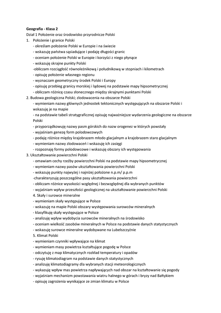 Geografia - Klasa 2 Dział 1 Położenie oraz środowisko przyrodnicze Polski 1. Położenie i granice Polski - określam położenie Polski w Europie i na świecie - wskazuję paostwa sąsiadujące i podaję długości granic - oceniam położenie Polski w Europie i korzyści z niego płynące - wskazuję skrajne punkty Polski -obliczam rozciągłośd równoleżnikową i południkową w stopniach i kilometrach - opisuję położenie własnego regionu - wyznaczam geometryczny środek Polski i Europy - opisuję przebieg granicy morskiej i lądowej na podstawie mapy hipsometrycznej - obliczam różnicę czasu słonecznego między skrajnymi punktami Polski 2. Budowa geologiczna Polski; zlodowacenia na obszarze Polski - wymieniam nazwy głównych jednostek tektonicznych występujących na obszarze Polski i wskazuję je na mapie - na podstawie tabeli stratygraficznej opisuję najważniejsze wydarzenia geologiczne na obszarze Polski - przyporządkowuję nazwy pasm górskich do nazw orogenez w których powstały - wyjaśniam genezę form polodowcowych - podaję różnice między krajobrazem młodo glacjalnym a krajobrazem staro glacjalnym - wymieniam nazwy zlodowaceo i wskazuję ich zasięgi - rozpoznaję formy polodowcowe i wskazuję obszary ich występowania 3. Ukształtowanie powierzchni Polski - omawiam cechy rzeźby powierzchni Polski na podstawie mapy hipsometrycznej - wymieniam nazwy pasów ukształtowania powierzchni Polski - wskazuję punkty najwyżej i najniżej położone n.p.m/ p.p.m -charakteryzuję poszczególne pasy ukształtowania powierzchni - obliczam różnice wysokości względnej i bezwzględnej dla wybranych punktów - wyjaśniam wpływ przeszłości geologicznej na ukształtowanie powierzchni Polski 4. Skały i surowce mineralne - wymieniam skały występujące w Polsce - wskazuję na mapie Polski obszary występowania surowców mineralnych - klasyfikuję skały występujące w Polsce - analizuję wpływ wydobycia surowców mineralnych na środowisko - oceniam wielkośd zasobów mineralnych w Polsce na podstawie danych statystycznych - wskazuję surowce mineralne wydobywane na Lubelszczyźnie 5. Klimat Polski - wymieniam czynniki wpływające na klimat - wymieniam masy powietrza kształtujące pogodę w Polsce - odczytuję z map klimatycznych rozkład temperatury i opadów - rysuję klimatodiagram na podstawie danych statystycznych - analizuję klimatodiagramy dla wybranych stacji meteorologicznych - wykazuję wpływ mas powietrza napływających nad obszar na kształtowanie się pogody - wyjaśniam mechanizm powstawania wiatru halnego w górach i bryzy nad Bałtykiem - opisuję zagrożenia wynikające ze zmian klimatu w Polsce 6. Wody podziemne i powierzchniowe - klasyfikuję wody występujące w Polsce - wskazuję na mapie Polski rzeki główne oraz ich dopływy - wymieniam główne kanały i wskazuję je na mapie - określam rodzaj zasilania rzek w Polsce - wykazuję asymetrię dorzecza Wisły i Odry - przedstawiam sposoby wykorzystywania wód podziemnych - wskazuję na mapie Polski największe i najgłębsze jeziora - klasyfikuję wody podziemne - wyróżniam typy genetyczne jezior - określam funkcje sztucznych zbiorników wodnych - omawiam rozmieszczenie wód mineralnych w Polsce 7. Morze Bałtyckie - określam położenie Bałtyku na mapie Europy - przedstawiam genezę Bałtyku - wymieniam i wskazuję największe zatoki, półwyspy, wyspy - omawiam cechy fizyczne wód Bałtyku - omawiam zróżnicowanie poziomu zasolenia wód Bałtyku - opisuję gospodarcze wykorzystanie wód Bałtyku - proponuję sposoby ochrony wód Bałtyku 8. Gleby w Polsce - klasyfikuję gleby w Polsce - rozróżniam typy gleb ze względu na ich żyznośd - opisuję zróżnicowane gleb na Lubelszczyźnie na podstawie map w atlasie - analizuję profile glebowe - proponuję działania mające na celu ochronę gleb 9. Szata roślinna i zwierzęta w Polsce - rozpoznaję typy zbiorowisk roślinnych występujących w Polsce - określam funkcje lasów - opisuję układ roślinności w górach na przykładzie Tatr - wyjaśniam zależności między klimatem a szatą roślinną - oceniam lesistośd Polski na podstawie mapy tematycznej - rozpoznaję wybrane gatunki roślin i zwierząt - opisuję świat roślin i zwierząt na Lubelszczyźnie 10. Podział administracyjny Polski - wskazuję na mapie Polski województwa i ich stolice - wyjaśniam na czym polega trójstopniowy podział władzy w Polsce - analizuję znaczenie podziału administracyjnego 11. Cechy demograficzne ludności w Polsce - opisuję zmiany liczby ludności Polski po II wojnie światowej - analizuję skutki ujemnego przyrostu naturalnego - prognozuję zmiany liczby ludności w Polsce na najbliższe 50 lat - analizuję dane statystyczne dotyczące zmian liczby ludności w Polsce na przykładzie piramidy wieku i płci - wskazuję okresy wyżów i niżów demograficznych - obliczam współczynnik przyrostu naturalnego i przyrostu rzeczywistego w Polsce 12. Rozmieszczenie ludności w Polsce - wyjaśniam termin: gęstośd zaludnienia - wskazuję obszary o największej i najmniejszej gęstości zaludnienia w Polsce - wymieniam atrakcje i bariery ograniczające rozmieszczenie ludności - analizuję czynniki, które zadecydowały o gęstości zaludnienia na Lubelszczyźnie 13. Urbanizacja w Polsce - wyjaśniam pojęcia: urbanizacja, dezurbanizacja, reurbanizacja - obliczam wskaźnik urbanizacji dla wybranych obszarów - wskazuję na mapie najbardziej zurbanizowane obszary - określam funkcje miast - podaję różnicę między miastem a wsią - omawiam problemy mieszkaoców wielkich miast - wskazuję na mapie wielkie aglomeracje miejskie 14. Wewnętrzne i zewnętrzne migracje Polaków - definiuję pojęcia: migracja, emigracja, imigracja, ewakuacja, deportacja - podaję przyczyny migracji - określam skutki migracji w krajach emigracyjnych i imigracyjnych - opisuję wpływ migracji na zmiany liczby ludności Polski - obliczam saldo migracji ludno
