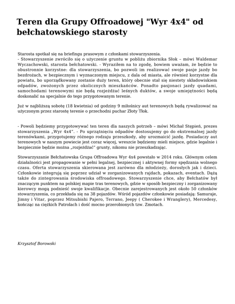 Teren dla Grupy Offroadowej "Wyr 4x4" od bełchatowskiego starosty Starosta spotkał się na briefingu prasowym z członkami stowarzyszenia. - Stowarzyszenie zwróciło się o użyczenie gruntu w pobliżu zbiornika Słok – mówi Waldemar Wyczachowski, starosta bełchatowski. - Wyraziłem na to zgodę, bowiem uważam, że będzie to obustronnie korzystne: dla stowarzyszenia, bo pozwoli im realizować swoje pasje jazdy bo bezdrożach, w bezpiecznym i wyznaczonym miejscu, z dala od miasta, ale również korzystne dla powiatu, bo uporządkowany zostanie duży teren, który obecnie stał się niestety składowiskiem odpadów, zwożonych przez okolicznych mieszkańców. Ponadto pasjonaci jazdy quadami, samochodami terenowymi nie będą rozjeżdżać leśnych duktów, a swoje umiejętności będą doskonalić na specjalnie do tego przygotowanym terenie. Już w najbliższą sobotę (18 kwietnia) od godziny 9 miłośnicy aut terenowych będą rywalizować na użyczonym przez starostę terenie o przechodni puchar Złoty Tłok. - Powoli będziemy przygotowywać ten teren dla naszych potrzeb – mówi Michał Stępień, prezes stowarzyszenia „Wyr 4x4”. - Po uprzątnięciu odpadów dostosujemy go do ekstremalnej jazdy terenówkami, przygotujemy różnego rodzaju przeszkody, aby urozmaicić jazdę. Posiadaczy aut terenowych w naszym powiecie jest coraz więcej, wreszcie będziemy mieli miejsce, gdzie legalnie i bezpiecznie będzie można „rozjeżdżać” grunty, nikomu nie przeszkadzając. Stowarzyszanie Bełchatowska Grupa Offroadowa Wyr 4x4 powstało w 2014 roku. Głównym celem działalności jest propagowanie w pełni legalnej, bezpiecznej i aktywnej formy spędzania wolnego czasu. Oferta stowarzyszenia skierowana jest zarówno dla młodzieży, dorosłych jak i dzieci. Członkowie integrują się poprzez udział w zorganizowanych rajdach, pokazach, eventach. Dążą także do zintegrowania środowiska offroadowego. Stowarzyszenie chce, aby Bełchatów był znaczącym punktem na polskiej mapie tras terenowych, gdzie w sposób bezpieczny i zorganizowany kierowcy mogą podnieść swoje kwalifikacje. Obecnie zarejestrowanych jest około 50 członków stowarzyszenia, co przekłada się na 38 pojazdów. Wśród pojazdów członkowie posiadają: Samuraje, Jimny i Vitar, poprzez Mitsubishi Pajero, Terrano, Jeepy ( Cherokee i Wranglery), Mercedesy, kończąc na ciężkich Patrolach i dość mocno przerobionych tzw. Zmotach. Krzysztof Borowski