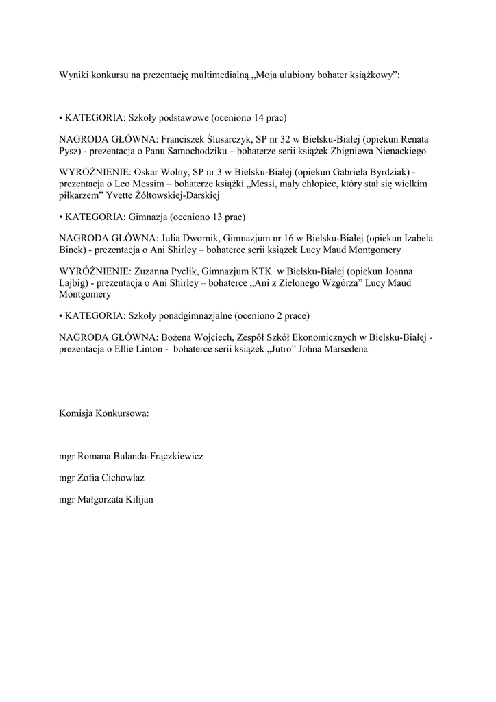 Wyniki konkursu na prezentację multimedialną „Moja ulubiony bohater książkowy”: • KATEGORIA: Szkoły podstawowe (oceniono 14 prac) NAGRODA GŁÓWNA: Franciszek Ślusarczyk, SP nr 32 w Bielsku-Białej (opiekun Renata Pysz) - prezentacja o Panu Samochodziku – bohaterze serii książek Zbigniewa Nienackiego WYRÓŻNIENIE: Oskar Wolny, SP nr 3 w Bielsku-Białej (opiekun Gabriela Byrdziak) prezentacja o Leo Messim – bohaterze książki „Messi, mały chłopiec, który stał się wielkim piłkarzem” Yvette Żółtowskiej-Darskiej • KATEGORIA: Gimnazja (oceniono 13 prac) NAGRODA GŁÓWNA: Julia Dwornik, Gimnazjum nr 16 w Bielsku-Białej (opiekun Izabela Binek) - prezentacja o Ani Shirley – bohaterce serii książek Lucy Maud Montgomery WYRÓŻNIENIE: Zuzanna Pyclik, Gimnazjum KTK w Bielsku-Białej (opiekun Joanna Lajbig) - prezentacja o Ani Shirley – bohaterce „Ani z Zielonego Wzgórza” Lucy Maud Montgomery • KATEGORIA: Szkoły ponadgimnazjalne (oceniono 2 prace) NAGRODA GŁÓWNA: Bożena Wojciech, Zespół Szkół Ekonomicznych w Bielsku-Białej prezentacja o Ellie Linton - bohaterce serii książek „Jutro” Johna Marsedena Komisja Konkursowa: mgr Romana Bulanda-Frączkiewicz mgr Zofia Cichowlaz mgr Małgorzata Kilijan