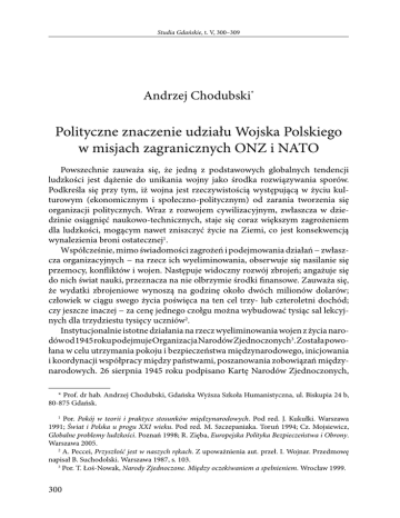 Studia Gdańskie, t. V, 300–309 Andrzej Chodubski* Polityczne znaczenie udziału Wojska Polskiego w misjach zagranicznych ONZ i NATO Powszechnie zauważa się, że jedną z podstawowych globalnych tendencji ludzkości jest dążenie do unikania wojny jako środka rozwiązywania sporów. Podkreśla się przy tym, iż wojna jest rzeczywistością występującą w życiu kulturowym (ekonomicznym i społeczno-politycznym) od zarania tworzenia się organizacji politycznych. Wraz z rozwojem cywilizacyjnym, zwłaszcza w dziedzinie osiągnięć naukowo-technicznych, staje się coraz większym zagrożeniem dla ludzkości, mogącym nawet zniszczyć życie na Ziemi, co jest konsekwencją wynalezienia broni ostatecznej. Współcześnie, mimo świadomości zagrożeń i podejmowania działań − zwłaszcza organizacyjnych − na rzecz ich wyeliminowania, obserwuje się nasilanie się przemocy, konfliktów i wojen. Następuje widoczny rozwój zbrojeń; angażuje się do nich świat nauki, przeznacza na nie olbrzymie środki finansowe. Zauważa się, że wydatki zbrojeniowe wynoszą na godzinę około dwóch milionów dolarów; człowiek w ciągu swego życia poświęca na ten cel trzy- lub czteroletni dochód; czy jeszcze inaczej − za cenę jednego czołgu można wybudować tysiąc sal lekcyjnych dla trzydziestu tysięcy uczniów. Instytucjonalnie istotne działania na rzecz wyeliminowania wojen z życia narodów od 1945 roku podejmuje Organizacja Narodów Zjednoczonych. Została powołana w celu utrzymania pokoju i bezpieczeństwa międzynarodowego, inicjowania i koordynacji współpracy między państwami, poszanowania zobowiązań międzynarodowych. 26 sierpnia 1945 roku podpisano Kartę Narodów Zjednoczonych, * Prof. dr hab. Andrzej Chodubski, Gdańska Wyższa Szkoła Humanistyczna, ul. Biskupia 24 b, 80-875 Gdańsk. Por. Pokój w teorii i praktyce stosunków międzynarodowych. Pod red. J. Kukułki. Warszawa 1991; Świat i Polska u progu XXI wieku. Pod red. M. Szczepaniaka. Toruń 1994; Cz. Mojsiewicz, Globalne problemy ludzkości. Poznań 1998; R. Zięba, Europejska Polityka Bezpieczeństwa i Obrony. Warszawa 2005. A. Peccei, Przyszłość jest w naszych rękach. Z upoważnienia aut. przeł. I. Wojnar. Przedmowę napisał B. Suchodolski. Warszawa 1987, s. 103. Por. T. Łoś-Nowak, Narody Zjednoczone. Między oczekiwaniem a spełnieniem. Wrocław 1999. 300 Polityczne znaczenie udziału Wojska Polskiego w misjach zagranicznych ONZ i NATO uznawaną za dokument konstytuujący instytucję. Przewiduje się w niej sankcje w przypadku nieprzestrzegania przyjętych postanowień, w tym użycie sił zbrojnych ONZ, w których skład wchodzą żołnierze z państw stałych członków Rady Bezpieczeństwa oraz innych państw. Polska jest uznawana za „członka-założyciela ONZ”. W warunkach przemian ustrojowych zachodzących od 1989 roku nasz kraj w znaczącym stopniu uczestniczy w realizacji wyzwań mających na celu rozwiązywanie konfliktów międzynarodowych. Jest uczestnikiem misji ONZ. Swoją obecność Polska zaznaczyła w: 1.Tymczasowych Siłach Zbrojnych Narodów Zjednoczonych w Libanie (UNIFIL). Polska, reprezentowana przez batalion logistyczny, uczestniczyła w działaniach międzynarodowych sił pokojowych nadzorujących wycofanie wojsk izraelskich w południowym Libanie; 2.Politycznym Kontyngencie Narodów Zjednoczonych w Iraku (UNGCI). Uczestniczyli w nim lekarze i pielęgniarki. Celem kontyngentu była międzynarodowa ochrona mniejszości kurdyjskiej w Iraku oraz dystrybucja pomocy humanitarnej; 3.Misji Obserwacji Narodów Zjednoczonych Irak−Kuwejt (UNIKOM). Polacy uczestniczyli w niej jako obserwatorzy wojskowi. Celem misji było prowadzenie nadzoru nad strefą zdemilitaryzowaną między Irakiem a Kuwejtem, co realizowały siły rozdzielająco-obserwacyjne; 4.Misji Narodów Zjednoczonych na rzecz Referendum w Saharze Zachodniej (MINURSO). Polacy uczestniczyli w niej jako personel obserwatorów. Celem misji było przeprowadzenie referendum w Saharze Zachodniej oraz nadzorowanie powrotu repatriantów, mających prawo do głosowania; 5.Specjalnej Komisji Narodów Zjednoczonych ds. Kontroli Rozbrojenia Iraku (UNSCOM). Komisja miała za cel nadzór nad realizacją zobowiązań Iraku do likwidacji broni chemicznych. Uczestniczyli w niej polscy oficerowie; 6.Siłach Narodów Zjednoczonych ds. Nadzoru Rozdzielenia Wojsk na Wzgórzach Golan (UNDOF). Polski kontyngent stanowił w siłach batalion piechoty (Polbatt). Celem sił był nadzór w strefie buforowej na Wzgórzach Golan zawieszenia broni po ataku izraelskim na Syrię; 7.Misji Obserwacyjnej Narodów Zjednoczonych w Angoli (UNAVEM III). Polacy uczestniczyli w siłach pokojowych wspomagających wprowadzenie w życie porozumienia pokojowego zawartego w 1994 roku między rządem Angoli a opozycją (UNITA); 8.Międzynarodowych Siłach Policyjnych Narodów Zjednoczonych (UNIPTP). 26 przedstawicieli Polski, jako obserwatorzy w Bośni i Hercegowinie, uczestniczyło w misji mającej na celu nadzorowanie wprowadzania w życie porozumienia pokojowego z Dayton w aspekcie przestrzegania praw człowieka; Almanach wiedzy powszechnej 1998. Pod red. R. Choromańskiego, K. Makowskiej. Warszawa 1998, s. 111−112. 301 Andrzej Chodubski 9.Misji Obserwacyjnej Narodów Zjednoczonych w Prevlace (Chorwacja) (UNMOP). Jej celem były obserwacja i nadzór porozumienia serbsko-chorwackiego, zwłaszcza w zakresie demilitaryzacji Półwyspu Prevlaca, a w tym portu wojennego; 10. Misji Obserwacyjnej Narodów Zjednoczonych w Tadżykistanie (UNMOT). Siły obserwacyjne, w których brali udział Polacy, nadzorowały porozumienie o zaprzestaniu walk między stroną rządową a opozycją Tadżykistanu; 11. Tymczasowej Administracji Narodów Zjednoczonych we Wschodniej Slawonii, Baranii i Zachodnim Śremie (UNTAES). Celem misji był nadzór nad reintegracją regionu kontrolowanego przez Serbów z Chorwacją, jej urzeczywistnianie na podstawie porozumienia z 12 listopada 19