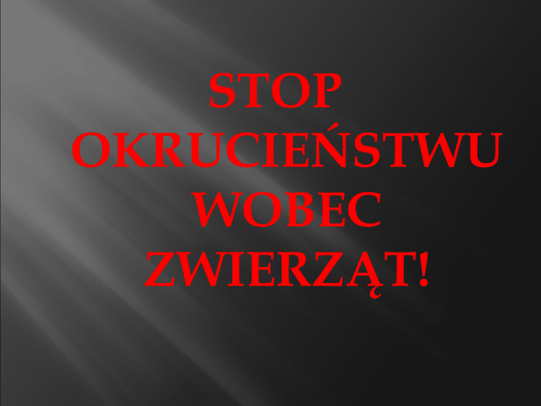 STOP OKRUCIEŃSTWU WOBEC ZWIERZĄT! Z przykładami okrucieństwa spotykamy się każdego dnia. Większość przypadków bestialskich zachowań człowieka umyka jednak opinii publicznej, a przede wszystkim karze! Wystarczy jednak rozejrzeć się wokoło by dojrzeć czające się zło. Oto psy i koty… nasi najwierniejsi przyjaciele… ofiary naszej bezduszności… Ozzy… pies który bardzo chciał żyć… Znalazł nowy dom… by … zostać skatowanym tępym przedmiotem, a następnie zakopanym, prawdopodobnie jeszcze żywcem! „Wymarzony” właściciel pozostał bezkarny! Zaniedbana Lucy Nie dla wszystkich oczywistym faktem jest, że gdy jeden z domowników choruje to należy mu się opieka lekarska i pomoc. Nie dla wszystkich oczywistym faktem jest, że przyjaciela w potrzebie się nie porzuca. Ta sunia trafiła do schroniska w fatalnym stanie. Prawie łysa, co przy właśnie nadchodzącej wówczas zimie stanowiło ogromny problem. Jak można doprowadzić do takiego zaniedbania? Jak nieczuły był jej „Pan”?... Pirat… Był wesoły i pełen energii. Lecz dzięki człowiekowi jego spojrzenie na świat, a zwłaszcza człowieka zmieniło się zupełnie… Oto … Maksio - Pies polany kwasem… Ktoś kto polał tego psa kwasem celowo, to sam powinien się zanurzyć w czymś takim i opowiedzieć czy było miło. Jeśli stało się to przypadkiem, to obowiązkiem człowieka było udzielenie psu pomocy. Tak się jednak nie stało… Pies przeszedł przeszczep skóry, który przyjął się jednak tylko częściowo, musiał mieć amputowany kawałek łapki i amputowane ucho. Życie Maksia wisiało na włosku, Maksio stracił wolę walki i kiedy w końcu weterynarz podjęła decyzję, że dłużej Maksia męczyć nie może... On jakby zrozumiał, że śmierć jest blisko i podjął tą ostatnią, kto wie, czy nie najważniejszą walkę w swoim życiu. Postanowił nie dać się śmierci. Dziś Maksio ma nowy dom... Okaleczony Mruczek… Po prostu ktoś sprawdzał jego wytrzymałość na ból… Teraz leczy się w schronisku… ale czy zapomni? Jantarek – pies z worka Ten pies… najpierw został polany jakąś substancją, a potem zakopany w worku. Dziś na nowo uczy się ufności do człowieka… Czy mu się uda? A to Nosek… Zachorował na świerzb, więc właściciel go wyrzucił… a przecież to się leczy! Dziś Kociak szuka nowego domu… Utopiony i bezimienny… Pewnie kiedyś był ulubieńcem domowników… Czym zasłużył na taki los? Tego już nikt się nie dowie. Ale chyba nic nie jest w stanie wytłumaczyć faktu, że został zamordowany w bestialski sposób! Smycz… na jej końcu kawałek betonu… otchłań wody… Potem już tylko cisza i myśl „dlaczego?”… Zobacz więcej (choć przykro patrzeć): http://www.psy.info.pl/schronisko_wroclaw/drastyc zne_przypadki.html www.schronisko.chwilka.pl/html/interwencje.php http://www.otoz.pl By roztopić ludzkie serca…. Prezentacje przygotowały: Martyna Hofman i Kinga Małoszyc z klasy V a S.P. im. M. Konopnickiej w Raciszynie Raciszyn 2008