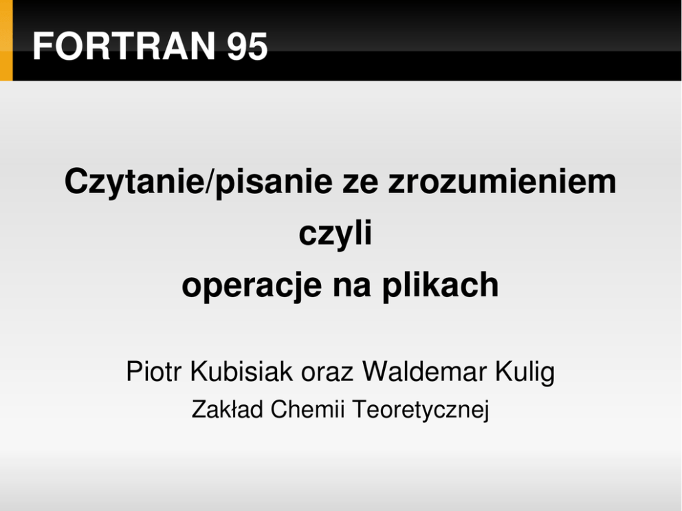 FORTRAN 95 Czytanie/pisanie ze zrozumieniem czyli operacje na plikach Piotr Kubisiak oraz Waldemar Kulig Zakład Chemii Teoretycznej Napisy Napisy (łańcuchy znakowe) są to zmienne znakowe (typu character). character (len=liczba_calkowita) nazwa_zmiennej character(liczba_calkowita) nazwa_zmiennej Przykład: character(len=8) :: bla character(8) :: blabla Mogą składać się z liter, cyfr i znaków alfabetu dostępnych na klawiaturze! Operacje na napisach character (len=22) :: imie, nazwisko, imie_nazwisko imie = 'Adam' ! zmienna o długości czterech znaków – reszta wypełniona odstępami nazwisko = 'Nowak' imie_nazwisko = 'Adam' // 'Nowak' operator zlepiania (konkatenacji) Operacje na napisach character (len=22) :: title, ten integer :: length, true_length ten = '12345678AB' title = 'Let us start !!!' ! UWAGA: Znaki !!! nie są traktowane jak komentarz ! tylko jako część napisu length = len(title) ! zwraca długość zmiennej tytuł łącznie ! z wypełniającymi odstępami true_length = len_trim(title) ! zwraca długość zmiennej tytuł BEZ ! wypełniających odstępów write(*,*) ten ! wypisze na ekran zmienną ten write(*,*) ten(2:5) ! wypisze na ekran 2,3,4 i 5 znak w zmiennej ten write(*,*) ten(4:) ! wypisze na ekran znaki do czwartego do końca zmiennej Operacje na plikach open(unit=liczba_całkowita, file='nazwa', status='slowo') slowo = new, old, replace, unknown, ... liczba_calkowita = 10 999999999 close(unit=liczba_całkowita, status='slowo') slowo = keep, delete Przykład: open(unit=100, file='moj_fajny_plik.dat', status='old') ....... close(unit=100) Funkcja WRITE Wypisanie na ekran: write(*,*) 'Hello world!' Wypisanie do pliku (wcześniej musi zostać otwarty!): write(100,*) 'Hello world!' Wypisanie do zmiennej typu character (musi być wcześniej zadeklarowana!): write(powitanie,*) 'Hello world!' Funkcja WRITE Formatowanie czyli wypisywanie wedle życzeń! write(*,fmt='(...)') zmienna Przykład: integer :: b=17 real :: z = 13.874, l = 1e12 character(len=14) :: bla = 'assadsffd' write(*,fmt='(i10, 2x, f8.4, 2x, e10.4, 2x, a17)') b, z, l, bla Funkcja READ Czytanie z klawiatury: read(*,*) cos Czytanie z pliku (wcześniej musi zostać otwarty!): read(100,*) cos Czytanie ze zmiennej typu character (musi być wcześniej zadeklarowana!): read(powitanie,*) cos Funkcja READ read(liczba,*, iostat=zmienna_typu_integer) Jeśli operacja czytania się powiodła to iostat=0, jeśli nie to jest różna od zera Przykład: integer:: error open(unit=37, file='bla.dat', status='unknown') read(37,*, iostat=error) z if(error == 0) then ..... else write(*,*)'Plik jest pusty nie moge nic przeczytac' exit end if