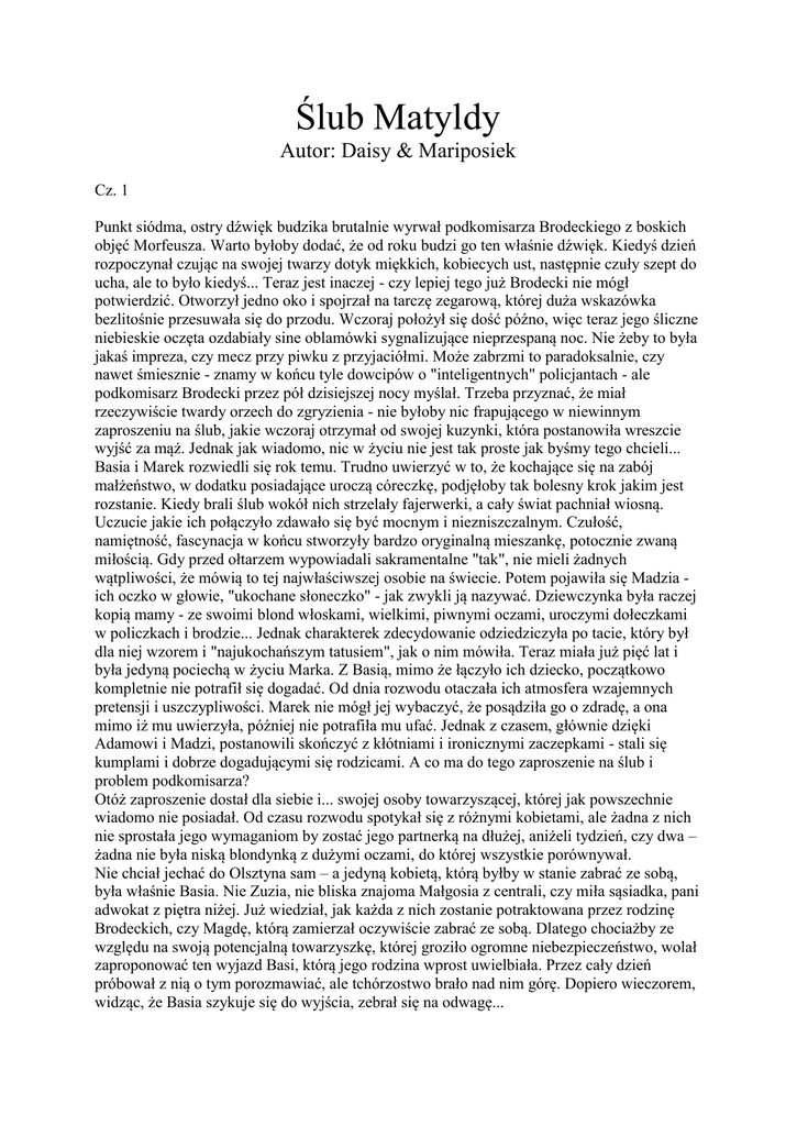 Ślub Matyldy Autor: Daisy & Mariposiek Cz. 1 Punkt siódma, ostry dźwięk budzika brutalnie wyrwał podkomisarza Brodeckiego z boskich objęć Morfeusza. Warto byłoby dodać, że od roku budzi go ten właśnie dźwięk. Kiedyś dzień rozpoczynał czując na swojej twarzy dotyk miękkich, kobiecych ust, następnie czuły szept do ucha, ale to było kiedyś... Teraz jest inaczej - czy lepiej tego już Brodecki nie mógł potwierdzić. Otworzył jedno oko i spojrzał na tarczę zegarową, której duża wskazówka bezlitośnie przesuwała się do przodu. Wczoraj położył się dość późno, więc teraz jego śliczne niebieskie oczęta ozdabiały sine oblamówki sygnalizujące nieprzespaną noc. Nie żeby to była jakaś impreza, czy mecz przy piwku z przyjaciółmi. Może zabrzmi to paradoksalnie, czy nawet śmiesznie - znamy w końcu tyle dowcipów o "inteligentnych" policjantach - ale podkomisarz Brodecki przez pół dzisiejszej nocy myślał. Trzeba przyznać, że miał rzeczywiście twardy orzech do zgryzienia - nie byłoby nic frapującego w niewinnym zaproszeniu na ślub, jakie wczoraj otrzymał od swojej kuzynki, która postanowiła wreszcie wyjść za mąż. Jednak jak wiadomo, nic w życiu nie jest tak proste jak byśmy tego chcieli... Basia i Marek rozwiedli się rok temu. Trudno uwierzyć w to, że kochające się na zabój małżeństwo, w dodatku posiadające uroczą córeczkę, podjęłoby tak bolesny krok jakim jest rozstanie. Kiedy brali ślub wokół nich strzelały fajerwerki, a cały świat pachniał wiosną. Uczucie jakie ich połączyło zdawało się być mocnym i niezniszczalnym. Czułość, namiętność, fascynacja w końcu stworzyły bardzo oryginalną mieszankę, potocznie zwaną miłością. Gdy przed ołtarzem wypowiadali sakramentalne "tak", nie mieli żadnych wątpliwości, że mówią to tej najwłaściwszej osobie na świecie. Potem pojawiła się Madzia ich oczko w głowie, "ukochane słoneczko" - jak zwykli ją nazywać. Dziewczynka była raczej kopią mamy - ze swoimi blond włoskami, wielkimi, piwnymi oczami, uroczymi dołeczkami w policzkach i brodzie... Jednak charakterek zdecydowanie odziedziczyła po tacie, który był dla niej wzorem i "najukochańszym tatusiem", jak o nim mówiła. Teraz miała już pięć lat i była jedyną pociechą w życiu Marka. Z Basią, mimo że łączyło ich dziecko, początkowo kompletnie nie potrafił się dogadać. Od dnia rozwodu otaczała ich atmosfera wzajemnych pretensji i uszczypliwości. Marek nie mógł jej wybaczyć, że posądziła go o zdradę, a ona mimo iż mu uwierzyła, później nie potrafiła mu ufać. Jednak z czasem, głównie dzięki Adamowi i Madzi, postanowili skończyć z kłótniami i ironicznymi zaczepkami - stali się kumplami i dobrze dogadującymi się rodzicami. A co ma do tego zaproszenie na ślub i problem podkomisarza? Otóż zaproszenie dostał dla siebie i... swojej osoby towarzyszącej, której jak powszechnie wiadomo nie posiadał. Od czasu rozwodu spotykał się z różnymi kobietami, ale żadna z nich nie sprostała jego wymaganiom by zostać jego partnerką na dłużej, aniżeli tydzień, czy dwa – żadna nie była niską blondynką z dużymi oczami, do której wszystkie porównywał. Nie chciał jechać do Olsztyna sam – a jedyną kobietą, którą byłby w stanie zabrać ze sobą, była właśnie Basia. Nie Zuzia, nie bliska znajoma Małgosia z centrali, czy miła sąsiadka, pani adwokat z piętra niżej. Już wiedział, jak każda z nich zostanie potraktowana przez rodzinę Brodeckich, czy Magdę, którą zamierzał oczywiście zabrać ze sobą. Dlatego chociażby ze względu na swoją potencjalną towarzyszkę, której groziło ogromne niebezpieczeństwo, wolał zaproponować ten wyjazd Basi, którą jego rodzina wprost uwielbiała. Przez cały dzień próbował z nią o tym porozmawiać, ale tchórzostwo brało nad nim górę. Dopiero wieczorem, widząc, że Basia szykuje się do wyjścia, zebrał się na odwagę... - Baśka... – zatrzymał ją w korytarzu, łapiąc za łokieć. Podrapał się po głowie, rozglądając na boki, czy aby nikt ich nie obserwuje, a widząc, że są sami, ciągnął dalej. – Muszę z tobą porozmawiać! To ważne! - Teraz? – spojrzała na zegarek. – Pani Marysia wspomniała rano, że chciałaby wyjść dzisiaj wcześniej. A Magdzie obiecałam, że przeczytam jej bajkę na dobranoc. - Zdążysz... to właściwie zajmie mi chwilkę. Proszę! – podkomisarz przytaknęła tylko i wróciła do kanciapy, siadając na skraju swojego biurka. - Co jest? – rzuciła, widząc jak Marek krąży przed nią po całej długości pokoju. – Jeśli chodzi o twój wyjazd z Magdą na wakacje.... to mówiłam, że nie ma problemu! Twój jest lipiec, mój sierpień! Uzgodniliśmy to przecież. - Nie, nie... to nie chodzi o Magdę, ani o wakacje.... chciałem.... Baśka mam dla Ciebie propozycję nie do odrzucenia! – wykrzyknął, wyciągając z szuflady białą kopertę, którą w następnej chwili podał Storosz. Baśka zmarszczyła brwi, zaglądając niepewnie do środka. – Matylda za dwa tygodnie wychodzi za mąż. - Matylda? – zamyśliła się. – Twoja kuzynka z Olsztyna? - Ta sama! – przytaknął. – Pamiętasz Roberta, jej chłopaka? Poznałaś go... wreszcie zamierzają się pobrać. Po sześciu latach narzeczeństwa. - Świetnie... ale nie rozumiem po co mi o tym wszystkim mówisz? - Znasz całą moją rodzinę, oni Cię ubóstwiają... a z Matyldą nawet się zaprzyjaźniłaś! – zaczął wymieniać, ale pod naciskiem jej przenikliwego spojrzenia zamilknął na moment. – A moje zaproszenie jest dla dwóch osób! – miauknął z lekkim przerażeniem. - Ty chyba nie chcesz.... – Brodecki delikatnie się uśmiechnął. – Chcesz, żebym pojechała tam z tobą? – krzyknęła, wstając. - Zawsze uważałem, że jesteś inteligentna. - Ponad rok temu się rozwiedliśmy, nie pałamy do siebie największą sympatią, nie widzi