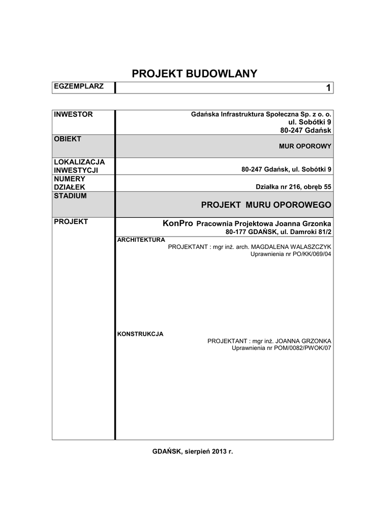 PROJEKT BUDOWLANY EGZEMPLARZ 1 Gdańska Infrastruktura Społeczna Sp. z o. o. INWESTOR ul. Sobótki 9 80-247 Gdańsk OBIEKT MUR OPOROWY LOKALIZACJA INWESTYCJI NUMERY DZIAŁEK STADIUM 80-247 Gdańsk, ul. Sobótki 9 Działka nr 216, obręb 55 PROJEKT MURU OPOROWEGO PROJEKT KonPro Pracownia Projektowa Joanna Grzonka 80-177 GDAŃSK, ul. Damroki 81/2 ARCHITEKTURA PROJEKTANT : mgr inż. arch. MAGDALENA WALASZCZYK Uprawnienia nr PO/KK/069/04 KONSTRUKCJA PROJEKTANT : mgr inż. JOANNA GRZONKA Uprawnienia nr POM/0082/PWOK/07 GDAŃSK, sierpień 2013 r. PROJEKT BUDOWLANY SPIS TREŚCI SPIS TREŚCI .................................................................................................................................................................... 2 1. DANE OGÓLNE ................................................................................................................................................................ 3 1.1. Podstawa opracowania................................................................................................................................................. 3 1.2. Inwestor ........................................................................................................................................................................ 3 1.3. Projektant ..................................................................................................................................................................... 3 1.4. Dane do projektowania ................................................................................................................................................. 3 1.5. Przedmiot opracowania ................................................................................................................................................ 3 2. OPIS KONSTRUKCYJNO-BUDOWLANY ................................................................................................................... 4 2.1. Warunki gruntowe......................................................................................................................................................... 4 2.2. Roboty ziemne ............................................................................................................................................................... 4 2.3. Mur oporowy: ............................................................................................................................................................... 4 2.4. Materiały konstrukcyjne: .............................................................................................................................................. 4 2.5. Dylatacje ....................................................................................................................................................................... 5 2.6. Izolacje.......................................................................................................................................................................... 5 3. WYKONANIE ROBÓT ............................................................................................................................................... 5 3.1. Wykopy fundamentowe.................................................................................................................................................. 5 3.2. Wykonanie deskowania dla ściany żelbetowej .............................................................................................................. 5 3.3. Izolacja ściany oporowej .............................................................................................................................................. 5 3.4. Zasypywanie wykopu .................................................................................................................................................... 5 3.5. Roboty odwadniające .................................................................................................................................................... 6 4. UWAGI KOŃCOWE .......................................................................................................................................................... 6 _____________________________________________________________________________________________ 2 Projekt muru oporowego przy budynku użytkowym w Gdańsku, ul. Sobótki 9, 80-247 Gdańsk PROJEKT BUDOWLANY 1. DANE OGÓLNE 1.1. PODSTAWA OPRACOWANIA Umowa na wykonanie projektu budowlanego muru oporowego na działce. 1.2. INWESTOR Gdańska Infrastruktura Społeczna Sp. z o. o. ul. Sobótki 9 80-247 Gdańsk 1.3. PROJEKTANT KonPro Pracownia Projektowa Joanna Grzonka, ul. Damroki 81/2, 80-177 Gdańsk, Tel. 502-462-722 mgr inż. Joanna Grzonka upr. nr POM/0082/PWOK/07 1.4. DANE DO PROJEKTOWANIA • Mapa sytuacyjno-wysokościowa co celów projektowych z naniesionym podziemnym uzbrojeniem terenu przyjęta do państwowego zasobu geodezyjno-kartograficznego • Projekt zagospodarowania terenu muru oporowego • Wizja lokalna dokonana w dniu 17.07.2013 r. • Wytyczne architektoniczne • Normy i przepisy branżowe 1.5. PRZEDMIOT OPRACOWANIA Przedmiotem opracowania jest wzmocnienie istniejącej skarpy na granicy działki i uporządkowanie spadków wód opadowych poprzez wykonanie muru oporowego na działce inwestora. Wykonanie „Projektu muru oporowego”, zlokalizowanego w Gdańsku ul. Sobótki 9 (działka nr 216 obr.55). _____________________________________________________________________________________________ 3 Projekt muru oporowego przy budynku użytkowym w Gdańsku, ul. Sobótki 9, 80-247 Gdańsk PROJEKT BUDOWLANY 2. OPIS KONSTRUKCYJNO-BUDOWLANY 2.1. WARUNKI GRUNTOWE Mur oporowy wykonano opierając się na dokumentacji projektowej dobudowy wiatrołapu z 1992r. Do obliczeń przyjęto piaski drobne, mało wilgotne, średnio-zagęszczone o stopniu zagęszczenia ID(n)=0,40. Głębokość przemarzania gruntów 