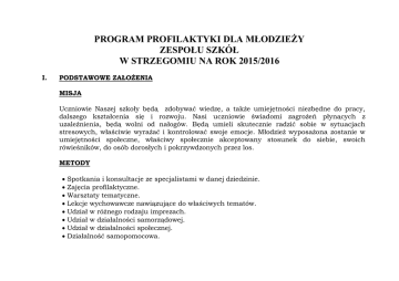 PROGRAM PROFILAKTYKI DLA MŁODZIEŻY ZESPOŁU SZKÓŁ W STRZEGOMIU NA ROK 2015/2016 I. PODSTAWOWE ZAŁOŻENIA MISJA Uczniowie Naszej szkoły będą zdobywać wiedzę, a także umiejętności niezbędne do pracy, dalszego kształcenia się i rozwoju. Nasi uczniowie świadomi zagrożeń płynących z uzależnienia, będą wolni od nałogów. Będą umieli skutecznie radzić sobie w sytuacjach stresowych, właściwie wyrażać i kontrolować swoje emocje. Młodzież wyposażona zostanie w umiejętności społeczne, właściwy społecznie akceptowany stosunek do siebie, swoich rówieśników, do osób dorosłych i pokrzywdzonych przez los. METODY Spotkania i konsultacje ze specjalistami w danej dziedzinie. Zajęcia profilaktyczne. Warsztaty tematyczne. Lekcje wychowawcze nawiązujące do właściwych tematów. Udział w różnego rodzaju imprezach. Udział w działalności samorządowej. Udział w działalności społecznej. Działalność samopomocowa. Szeroko rozumiana współpraca i wymiana poglądów między uczniami, rodzicami, nauczycielami i innymi pracownikami szkoły. CELE Kształtowanie wśród młodzieży nawyków i przyzwyczajeń zdrowotno - higienicznych. Wdrażania wychowanków do aktywnego działania na rzecz poprawy zdrowia własnego i publicznego. Kształtowanie postaw prozdrowotnych. Poprawa umiejętności interpersonalnych. Pomoc w rozpoznawaniu i wyrażaniu uczuć własnych. Kształcenie wizerunku patriotycznego. Umiejętność radzenia sobie z własnymi problemami. Dostarczenie wiedzy o mechanizmie uzależnień i radzeniu sobie z nimi. Poprawa własnego wizerunku. Zwiększenie gotowości korzystania z pomocy. Przygotowanie absolwenta do funkcjonowania na rynku pracy. WYKONAWCY Wykonawcami tego projektu są wszyscy pracownicy szkoły, a w szczególności dyrekcja, wychowawcy, nauczyciele, pielęgniarka szkolna oraz pedagodzy szkolni. Poza tym realizacja niniejszego programu uzależniona jest także od jakości współpracy z rodzicami i samymi uczniami Zespołu Szkół. W szczególnych zaś przypadkach szkoła liczy także na wsparcie instytucji pomocowych. Program Profilaktyki dla Młodzieży jest spójny z Programem Wychowawczym Szkoły . KSZTAŁTOWANIE POSTAW OBYWATELSKICH ZADANIE 1. Wpajanie szacunku dla symboli narodowych, religijnych i miejsc pamięci. 2. Rozwijanie i umacnianie tradycji narodowych oraz tożsamości narodowej. 3. Kształtowanie postaw i wartości obywatelskich. 4. Przygotowanie uczniów do życia społecznego i gospodarczego. 5. Kształtowanie postaw etyczno moralnych w życiu codziennym. 6. Integracja ze społecznością lokalna. TREŚĆ ZADAŃ 1. Symbole narodowe i religijne, ich rola i znaczenie. 2. Odpowiednie zachowanie się w ich obecności. 3. Święta narodowe i religijne. 4. Miejsca pamięci narodowej w regionie i kraju. 5. Ludzie związani z historia regionu, kraju. 6. Więzi społeczne w grupie – ich rodzaje i uwarunkowania. 7. Prawa i obowiązki obywateli, ich konstytucyjne gwarancje oraz środki ochrony tych praw. 8. Samorząd terytorialny – jego struktura, rola, znaczenie i zasady funkcjonowania. 9. Struktura władzy centralnej, kompetencje 7.Kształtowanie samorządności uczniów i zadania jej organów. 10. Współczesne wydarzenia publiczne w regionie i kraju. 11. Wartości etyczne. Życzliwość, prawda, tolerancja i rozwaga w życiu codziennym i publicznym. 12. Życie szkoły: prawa i obowiązki uczniów , samorząd szkolny, gazetka szkolna, zarządzanie szkołą SPODZIEWANE EFEKTY ewaluacja 1. Znajomość pojęcia symbolu narodowego, religijnego. 2. Umiejętność odpowiedniego zachowania się w obecności symboli narodowych i religijnych oraz w miejscach szczególnie związanych z historia Narodu i Ojczyzny. 3. Znajomość obowiązków wobec Narodu i Ojczyzny. 4. Rozumienie, czym jest grupa społeczna i jakie ma znaczenie i wpływ na rozwój jednostki. 5. Poznanie podstawowych zasad ustrojowych współczesnego państwa polskiego oraz wolności, praw i obowiązków obywateli RP. 6. Kształtowanie postaw zrozumienia rzetelnego wypełniania obowiązków na rzecz demokratycznego państwa polskiego. 7. Rozumienie podstawowych problemów swojego regionu. 8. Umiejętność załatwienia podstawowych spraw w urzędach administracji samorządowej. 9. Poznanie różnych form życia publicznego. 10. Umiejętność odnoszenia się z - obserwacja; - rozmowy; - dyskusje; - wywiady; - ankiety; - kwestionariusze; - prezentacje. 13.Młodzieżowa Rada Miasta – udział młodzieży Zespołu Szkół. szacunkiem do rówieśników, rodziców, nauczycieli, osób starszych. 11. Świadomość zasad funkcjonowania szkoły oraz praw i obowiązków jej społeczności. WSPÓŁPRACA Z RODZICAMI I Z ŚRODOWISKIEM ZADANIE TREŚĆ ZADAŃ 1. Integrowanie wychowawczych działań szkoły, rodziny i środowiska. 2. Przygotowanie uczniów do pełnienia funkcji społecznych. 3. Współpraca z Strzegomskim Centrum Kultury, muzeum, OPS, JST, gimnazjami , przedszkolami, kinem, teatrem, domem dziecka, lokalnymi mediami i organizacjami pozarządowymi . 4. Dbałość o prestiż szkoły. 1. Prowadzenie zebrań z rodzicami. Spotkania w ramach otwartych dni w szkole. 2. Przygotowywanie uroczystości klasowych i szkolnych. 3. Organizowanie sesji popularnonaukowych, wystaw ,akcji ,przedstawień dla mieszkańców, miasta i gminy. 4. Aktywny udział w akcjach, np. Wielka Orkiestra Świątecznej Pomocy, Sprzątanie Świata, Mikołajki dla dzieci z Domu Dziecka w Wałbrzychu, Akcja Nakręć się, zbiórka makulatury i inne akcje ekologiczne i społeczne. 5. Zapraszanie lokalnych mediów na imprezy organizowane przez szkołę. 6. Promocja szkoły. 7.Udział szkoły w Święcie Granitu Strzegomskiego 8 .Prowadzenie eventów i festynów tematycznych 9. Współpraca w zakresie realizacji zadań z placówką wsparcia dziennego SPODZIEWANE EFEKTY 1. Rozpoznawanie oczekiwań rodziców w stosunku do szkoły. 2. Współpraca rodziców w tworzeniu WSO, SPW,SPP i statutu szkoły. 3. Zapoz