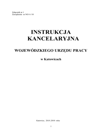 Załącznik nr 1 Zarządzenie nr NO/ 6 /10 INSTRUKCJA KANCELARYJNA WOJEWÓDZKIEGO URZĘDU PRACY w Katowicach Katowice, 28.01.2010 roku 1 SPIS TREŚCI Rozdział 1 POSTANOWIENIA WSTĘPNE I OGÓLNE 1. Przedmiot i cel 2. Znaczenie pojęć użytych w instrukcji 3 3 Rozdział 2 SYSTEM KANCELARYJNY 1. Czynności kancelaryjne 2. Komórki organizacyjne Urzędu i ich symbole 6 8 Rozdział 3 SZCZEGÓŁOWE USTALENIA DOTYCZĄCE WYKONYWANIA WAŻNIEJSZYCH CZYNNOŚCI KANCELARYJNYCH 1. 2. 3. 4. 5. 6. 7. 8. 9. 10. Przyjmowanie korespondencji i przesyłek Otwieranie i sprawdzanie korespondencji i przesyłek Przeglądanie i dekretowanie korespondencji Wewnętrzny obieg akt Rejestrowanie spraw i zakładanie teczek aktowych Załatwianie spraw Podpisywanie pism Wysyłanie i doręczanie korespondencji Przechowywanie akt Przekazywanie akt do archiwum zakładowego Rozdział 4 POSTANOWIENIA KOŃCOWE 1. Nadzór nad czynnościami kancelaryjnymi 2. Postępowanie z dokumentacją w przypadku reorganizacji lub likwidacji organizacyjnej 2 10 11 12 14 15 17 19 20 21 21 23 komórki 23 Rozdział 1 POSTANOWIENIA WSTĘPNE I OGÓLNE 1. Przedmiot i cel Instrukcja kancelaryjna, zwana dalej „instrukcją”, ustala zasady postępowania w zakresie: obiegu korespondencji i innych dokumentów, ich powstawania, przesyłania, ewidencjonowania, przechowywania w komórkach organizacyjnych oraz przekazywania do archiwum zakładowego w Wojewódzkim Urzędzie Pracy w Katowicach. Ustalone w instrukcji zasady postępowania dążą do zapewnienia jednolitego sposobu tworzenia, ewidencjonowania i przechowywania oraz ochrony przed utratą, uszkodzeniem bądź zniszczeniem akt w Wojewódzkim Urzędzie Pracy w Katowicach. W postępowaniu z dokumentami stanowiącymi tajemnicę służbową (poufnymi) stosuje się niniejszą instrukcję z uwzględnieniem przepisów w sprawie szczegółowych zasad i sposobu postępowania z wiadomościami stanowiącymi tajemnicę państwową i służbową. Postępowanie z dokumentami stanowiącymi tajemnicę (tajnymi) regulują odrębne przepisy. 2. Znaczenie pojęć użytych w instrukcji Akta sprawy - cała dokumentacja dotycząca danej sprawy (obejmująca: dokumenty, pisma, notatki, formularze, plany, kserokopie itp.), zawierające dane i informacje niezbędne przy jej rozpatrywaniu, Aprobata - wyrażenie zgody na treść i sposób załatwienia sprawy, Czystopis - tekst dokumentu lub pisma urzędowego w postaci ostatecznej przygotowanej do podpisu przez wystawcę, Dekretacja – skierowanie sprawy do referenta sprawy w celu jej załatwienia, Dokument – akt mający znaczenie dowodu, ustanawiający uprawnienia lub stwierdzający prawdziwość określonych w nim zdarzeń bądź danych, Dokumentacja niearchiwalna – część dokumentacji nie stanowiąca materiałów archiwalnych (kat. „B”), Dyrektor Urzędu – Dyrektor Wojewódzkiego Urzędu Pracy w Katowicach, Elektroniczny Rejestr Kancelaryjny – zestawienie spraw w formie elektronicznej, prowadzone przez Kancelarię ogólną oraz kancelarie Filii Urzędu, Kancelaria Ogólna – stanowisko pracy do, którego należy załatwienie sprawy obsługi kancelaryjnej Urzędu, 3 Kierownik komórki organizacyjnej – osoba funkcyjna, której powierzono stanowisko kierownicze w Urzędzie, Komórka organizacyjna – wydział, zespół, samodzielne stanowisko pracy w Urzędzie, Korespondencja – każde pismo wpływające do Urzędu lub wysyłane przez Urząd, Materiały archiwalne – część dokumentacji posiadająca wartość historyczną, wchodząca w skład państwowego zasobu archiwalnego (kat. „A”), Nośnik informatyczny – dyskietka, płyta CD lub inny nośnik, na którym zapisano w formie elektronicznej treść dokumentu, pisma, itp. Parafa – skrócony podpis osoby wyrażającej zgodę na treść i sposób załatwienia sprawy, Przesyłka – paczka otrzymywana i wysyłana za pośrednictwem poczty, gońca itp., Punkt zatrzymania – każde stanowisko pracy, przez które przechodzą akta sprawy w trakcie wykonywania czynności związanych z jej załatwieniem, Referent sprawy – pracownik opracowujący merytorycznie sprawę, Registratura – miejsce rejestracji spraw i przechowywania akt w komórkach organizacyjnych do czasu przekazania tych akt do archiwum zakładowego lub na makulaturę, Sekretariat Urzędu – stanowisko pracy, do którego należy obsługa organizacyjna Dyrekcji Urzędu, Spis spraw – formularz służący do rejestrowania spraw nadsyłanych do komórki organizacyjnej lub w niej powstałych, Sprawa – zdarzenie lub stan rzeczy wymagające podjęcia i wykonania czynności urzędowych, wyrażających się między innymi w tworzeniu akt, Talgos - elektroniczny obieg dokumentów i spraw dla administracji samorządowej i publicznej, Teczka aktowa (spraw) – teczka, skoroszyt, segregator itp. pomoce służące do przechowywania akt w komórce organizacyjnej i dotyczące jednorodnych lub rzeczowo pokrewnych akt, zgodnie z jednolitym rzeczowym wykazem akt, Termin – okres czasu lub konkretna data, wynikająca z obowiązujących przepisów lub ustaleń jednostek nadrzędnych i przełożonych, wyznaczająca czas załatwienia sprawy, Urząd – Wojewódzki Urząd Pracy w Katowicach, Wykaz akt – rzeczowy wykaz akt, stanowiący tematyczną klasyfikację dokumentacji Urzędu wraz z klasyfikacją archiwalną, 4 Załącznik – każdy akt dołączony do pisma podstawowego (akt składający się z kilku lub więcej luźnych arkuszy, które pod względem treści tworzą całość, należy uważać za jeden załącznik, akta zszyte, sklejone lub trwale złączone, broszury, książki i inne przedmioty należy traktować jako pojedyncze załączniki), Znak akt – zespół symboli określających przynależność sprawy do określonej komórki organizacyjnej i do określonej grupy rzeczowej z wykazu akt, Znak sprawy – stała cecha rozpoznawcza sprawy i wszystkich pism tej sprawy dotyczących. 5 Rozdział 2 SYSTEM KANCELARYJNY 1. Czynności kancelaryj