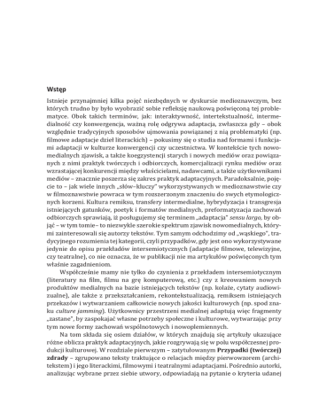 Wstęp Istnieje przynajmniej kilka pojęć niezbędnych w dyskursie medioznawczym, bez których trudno by było wyobrazić sobie refleksję naukową poświęconą tej problematyce. Obok takich terminów, jak: interaktywność, intertekstualność, intermedialność czy konwergencja, ważną rolę odgrywa adaptacja, zwłaszcza gdy – obok względnie tradycyjnych sposobów ujmowania powiązanej z nią problematyki (np. filmowe adaptacje dzieł literackich) – pokusimy się o studia nad formami i funkcjami adaptacji w kulturze konwergencji czy uczestnictwa. W kontekście tych nowomedialnych zjawisk, a także koegzystencji starych i nowych mediów oraz powiązanych z nimi praktyk twórczych i odbiorczych, komercjalizacji rynku mediów oraz wzrastającej konkurencji między właścicielami, nadawcami, a także użytkownikami mediów – znacznie poszerza się zakres praktyk adaptacyjnych. Paradoksalnie, pojęcie to – jak wiele innych „słów–kluczy” wykorzystywanych w medioznawstwie czy w filmoznawstwie powraca w tym rozszerzonym znaczeniu do swych etymologicznych korzeni. Kultura remiksu, transfery intermedialne, hybrydyzacja i transgresja istniejących gatunków, poetyk i formatów medialnych, preformatyzacja zachowań odbiorczych sprawiają, iż posługujemy się terminem „adaptacja” sensu largo, by objąć – w tym tomie– to niezwykle szerokie spektrum zjawisk nowomedialnych, którymi zainteresowali się autorzy tekstów. Tym samym odchodzimy od „wąskiego”, tradycyjnego rozumienia tej kategorii, czyli przypadków, gdy jest ono wykorzystywane jedynie do opisu przekładów intersemiotycznych (adaptacje filmowe, telewizyjne, czy teatralne), co nie oznacza, że w publikacji nie ma artykułów poświęconych tym właśnie zagadnieniom. Współcześnie mamy nie tylko do czynienia z przekładem intersemiotycznym (literatury na film, filmu na grę komputerową, etc.) czy z kreowaniem nowych produktów medialnych na bazie istniejących tekstów (np. kolaże, cytaty audiowizualne), ale także z przekształcaniem, rekontekstualizacją, remiksem istniejących przekazów i wytwarzaniem całkowicie nowych jakości kulturowych (np. spod znaku culture jamming). Użytkownicy przestrzeni medialnej adaptują więc fragmenty „zastane”, by zaspokajać własne potrzeby społeczne i kulturowe, wytwarzając przy tym nowe formy zachowań wspólnotowych i nowoplemiennych. Na tom składa się osiem działów, w których znajdują się artykuły ukazujące różne oblicza praktyk adaptacyjnych, jakie rozgrywają się w polu współczesnej produkcji kulturowej. W rozdziale pierwszym – zatytułowanym Przypadki (twórczej) zdrady – zgrupowano teksty traktujące o relacjach między pierwowzorem (architekstem) i jego literackimi, filmowymi i teatralnymi adaptacjami. Pośrednio autorki, analizując wybrane przez siebie utwory, odpowiadają na pytanie o kryteria udanej [4] Wstęp adaptacji (przypadek twórczej zdrady w ujęciu Alicji Helman) oraz wyjaśniają powody sprzeniewierzenia się adaptatorów literze lub idei tekstu wyjściowego. Ewa Łubieniewska analizuje sceniczną transformację „Balu w operze” Juliana Tuwima w inscenizacji Andrzeja Dziuka; badaczka traktuje ten spektakl jako udany przykład adaptowania materii poetyckiej, w której zachowano walory pierwowzoru, a jednocześnie reżyser wraz z zespołem stworzył – sharmonizowany pod względem kompozycyjnym, rytmicznym i melodycznym – spektakl teatralny. Dla odmiany, Alicja Baluch opisuje nieudane, by nie powiedzieć – zdradzieckie, czy nawet oszukańcze pseudoadaptacje klasycznych utworów dla dzieci (na przykładzie baśni magicznych i literackich), które skutkują znacznym odstępstwem od oryginału oraz dezorientacją czytelnika. Badaczka ilustruje to zjawisko ukazując modyfikacje baśni o Roszpunce z tomu Braci Grimm. Dagna Krysiak z kolei opisuje wybitne adaptacje filmowe na przykładzie filmów Jerzego Kawalerowicza, Wojciecha J. Hasa czy Piotra Dumały. W drugim rozdziale – Filmowe reprezentacje literatury i świadectw życia – znajdują się teksty trzech autorów. Natalia Zborowska opisuje filmowe reprezentacje (dokument, sztuka teatralna, film fabularny) angielskiego pisarza C.S. Lewisa w kontekście wybranych faktów z jego biografii oraz adaptacje książkowe, telewizyjne i kinowe cyklu „Opowieści z Narnii”. Aleksandra Smyczyńska koncentruje się na opisie metody adaptacyjnej Jana Jakuba Kolskiego ilustrując jej działanie na przykładzie filmu „Wenecja”, zaś Jacek Rozmus daje nam wgląd w literackie reprezentacje I wojny światowej w kontekście prozy żołnierskiej. Autor opisuje zjawisko adaptacji istniejących już „światów znarratywizowanych” w prozie Andrzeja Kuśniewicza, traktując adaptację jako formę re-kreacji. W rozdziale trzecim – Ideologia, stereotypy, język – umieszczono artykuły Anny Ślósarz, Magdaleny Kempnej-Pieniążek oraz Marzeny Błasiak-Tytuły. Pierwsza z wymienionych ukazuje, jak ideologia filmowych adaptacji wpisując się w oczekiwania odbiorców, utrwala istniejące w ich kulturze i świadomości stereotypy, co wpływa wtórnie na sposób recepcji pierwowzorów literackich. Magdalena Kempna-Pieniążek – na przykładzie filmowej twórczości Chrisa Eyre’a pokazuje, w jaki sposób reżyser dokonuje rewizji istniejącego stereotypowego wizerunku Indian Ameryki Północnej, wykorzystując adaptacje literackie oraz znane konwencje gatunkowe (filmu drogi czy filmu sportowego). Marzena Błasiak-Tytuła z kolei, na przykładzie „ponglish” ukazuje fenomen polsko-angielskiej mowy hybrydalnej, która ukształtowała się u polskich migrantów w Wielkiej Brytanii (jako forma adaptacji Polaków do nowej rzeczywistości społeczno-kulturowej). W czwartym rozdziale – W stronę intermedialności – znajdują się trzy artykuły. Autorka pierwszego z nich, Agnieszka Ogonowska, ukazuje adaptację filmową jako formę intermedialności, odwołując się 