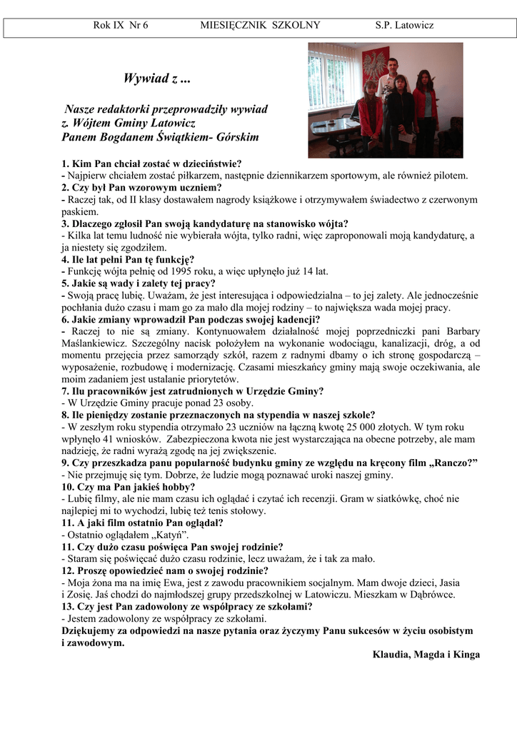 Rok IX Nr 6 MIESIĘCZNIK SZKOLNY S.P. Latowicz Wywiad z ... Nasze redaktorki przeprowadziły wywiad z. Wójtem Gminy Latowicz Panem Bogdanem Świątkiem- Górskim 1. Kim Pan chciał zostać w dzieciństwie? - Najpierw chciałem zostać piłkarzem, następnie dziennikarzem sportowym, ale równieŜ pilotem. 2. Czy był Pan wzorowym uczniem? - Raczej tak, od II klasy dostawałem nagrody ksiąŜkowe i otrzymywałem świadectwo z czerwonym paskiem. 3. Dlaczego zgłosił Pan swoją kandydaturę na stanowisko wójta? - Kilka lat temu ludność nie wybierała wójta, tylko radni, więc zaproponowali moją kandydaturę, a ja niestety się zgodziłem. 4. Ile lat pełni Pan tę funkcję? - Funkcję wójta pełnię od 1995 roku, a więc upłynęło juŜ 14 lat. 5. Jakie są wady i zalety tej pracy? - Swoją pracę lubię. UwaŜam, Ŝe jest interesująca i odpowiedzialna – to jej zalety. Ale jednocześnie pochłania duŜo czasu i mam go za mało dla mojej rodziny – to największa wada mojej pracy. 6. Jakie zmiany wprowadził Pan podczas swojej kadencji? - Raczej to nie są zmiany. Kontynuowałem działalność mojej poprzedniczki pani Barbary Maślankiewicz. Szczególny nacisk połoŜyłem na wykonanie wodociągu, kanalizacji, dróg, a od momentu przejęcia przez samorządy szkół, razem z radnymi dbamy o ich stronę gospodarczą – wyposaŜenie, rozbudowę i modernizację. Czasami mieszkańcy gminy mają swoje oczekiwania, ale moim zadaniem jest ustalanie priorytetów. 7. Ilu pracowników jest zatrudnionych w Urzędzie Gminy? - W Urzędzie Gminy pracuje ponad 23 osoby. 8. Ile pieniędzy zostanie przeznaczonych na stypendia w naszej szkole? - W zeszłym roku stypendia otrzymało 23 uczniów na łączną kwotę 25 000 złotych. W tym roku wpłynęło 41 wniosków. Zabezpieczona kwota nie jest wystarczająca na obecne potrzeby, ale mam nadzieję, Ŝe radni wyraŜą zgodę na jej zwiększenie. 9. Czy przeszkadza panu popularność budynku gminy ze względu na kręcony film „Ranczo?” - Nie przejmuję się tym. Dobrze, Ŝe ludzie mogą poznawać uroki naszej gminy. 10. Czy ma Pan jakieś hobby? - Lubię filmy, ale nie mam czasu ich oglądać i czytać ich recenzji. Gram w siatkówkę, choć nie najlepiej mi to wychodzi, lubię teŜ tenis stołowy. 11. A jaki film ostatnio Pan oglądał? - Ostatnio oglądałem „Katyń”. 11. Czy duŜo czasu poświęca Pan swojej rodzinie? - Staram się poświęcać duŜo czasu rodzinie, lecz uwaŜam, Ŝe i tak za mało. 12. Proszę opowiedzieć nam o swojej rodzinie? - Moja Ŝona ma na imię Ewa, jest z zawodu pracownikiem socjalnym. Mam dwoje dzieci, Jasia i Zosię. Jaś chodzi do najmłodszej grupy przedszkolnej w Latowiczu. Mieszkam w Dąbrówce. 13. Czy jest Pan zadowolony ze współpracy ze szkołami? - Jestem zadowolony ze współpracy ze szkołami. Dziękujemy za odpowiedzi na nasze pytania oraz Ŝyczymy Panu sukcesów w Ŝyciu osobistym i zawodowym. Klaudia, Magda i Kinga